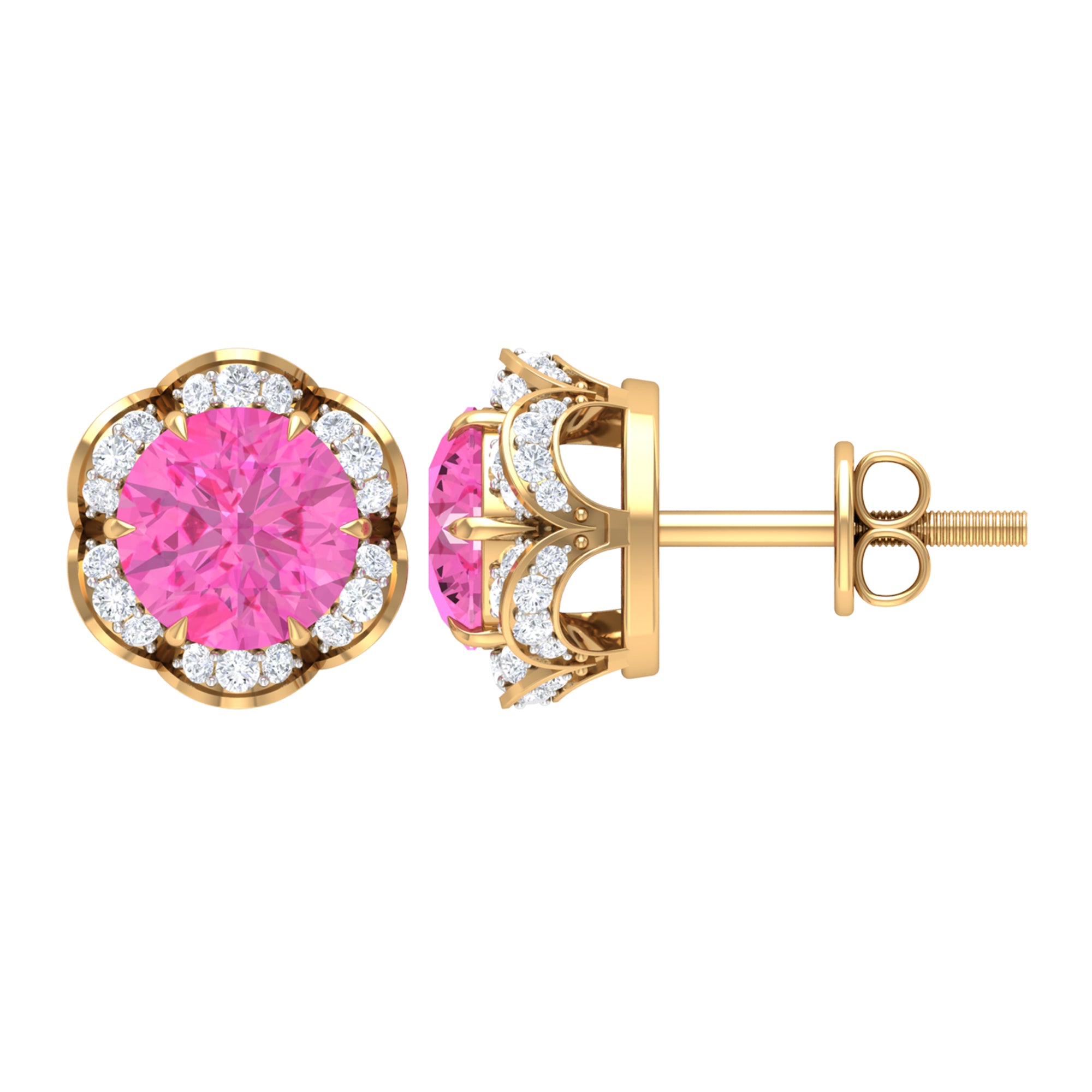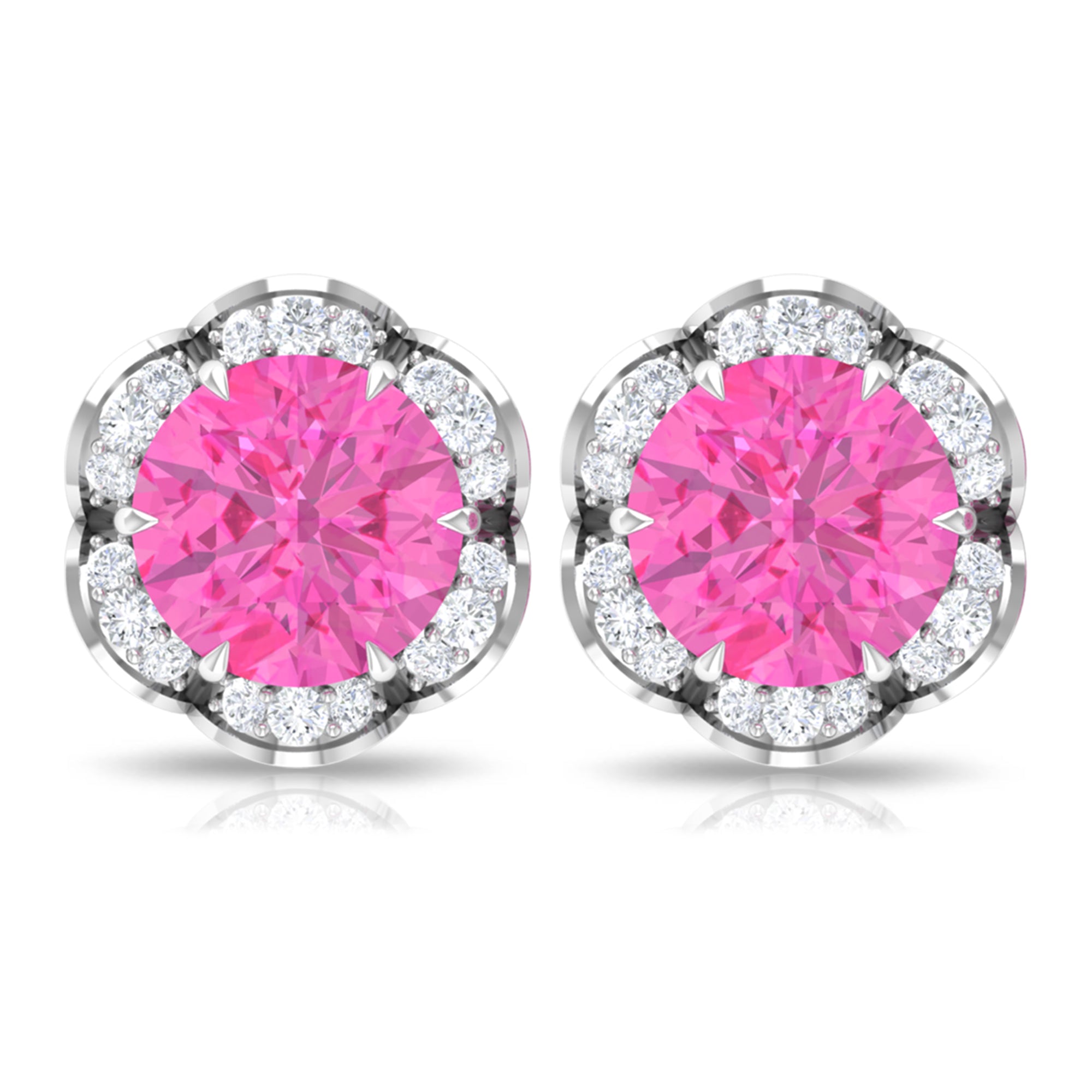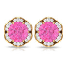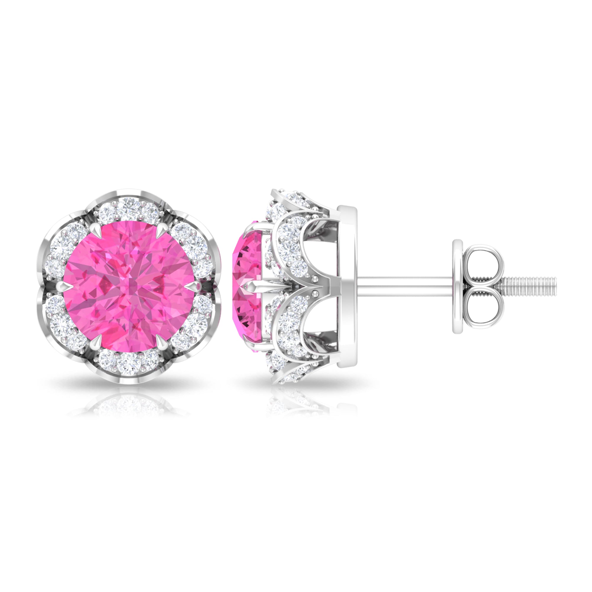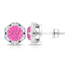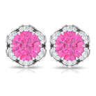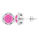 Attain a stylish and refined appearance with these stunning Floral Stud Earrings adorned with Round Cut Pink Sapphire and Diamond gemstones, delicately positioned within an enchanting floral arrangement. Created using premium-quality metal.