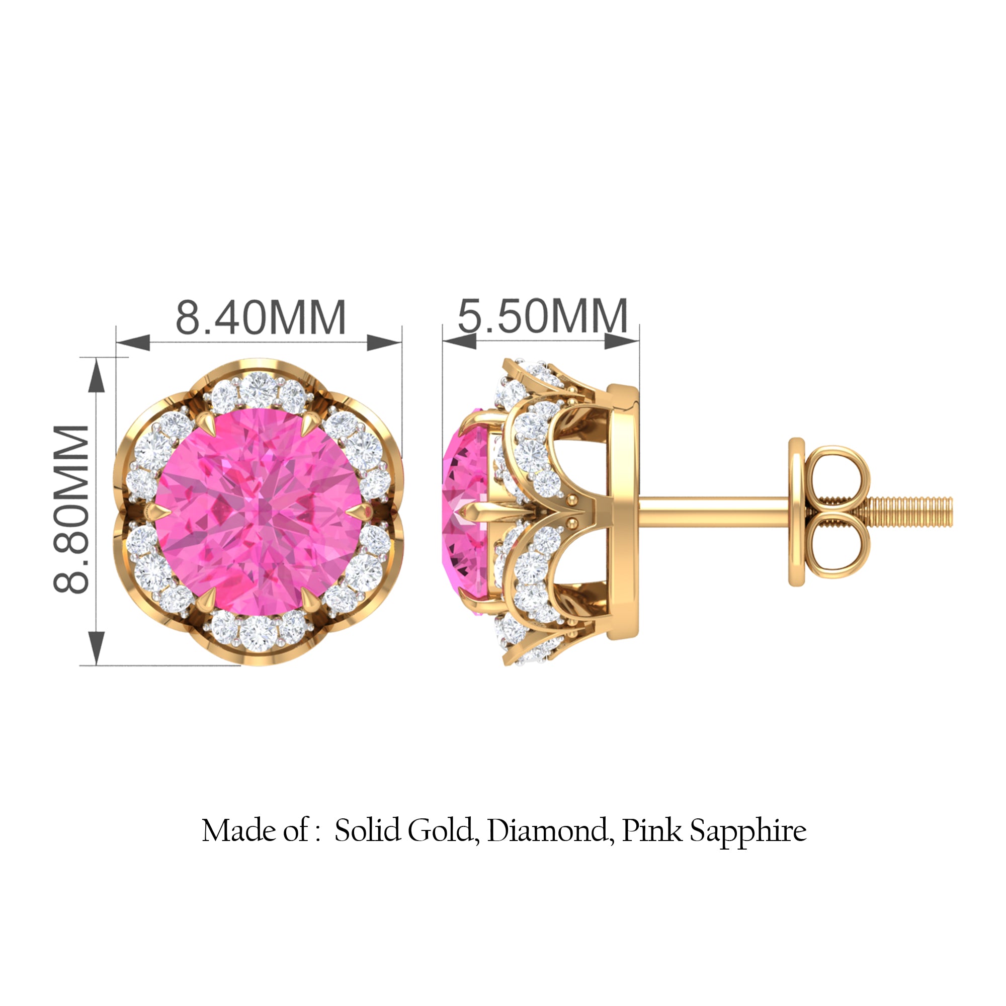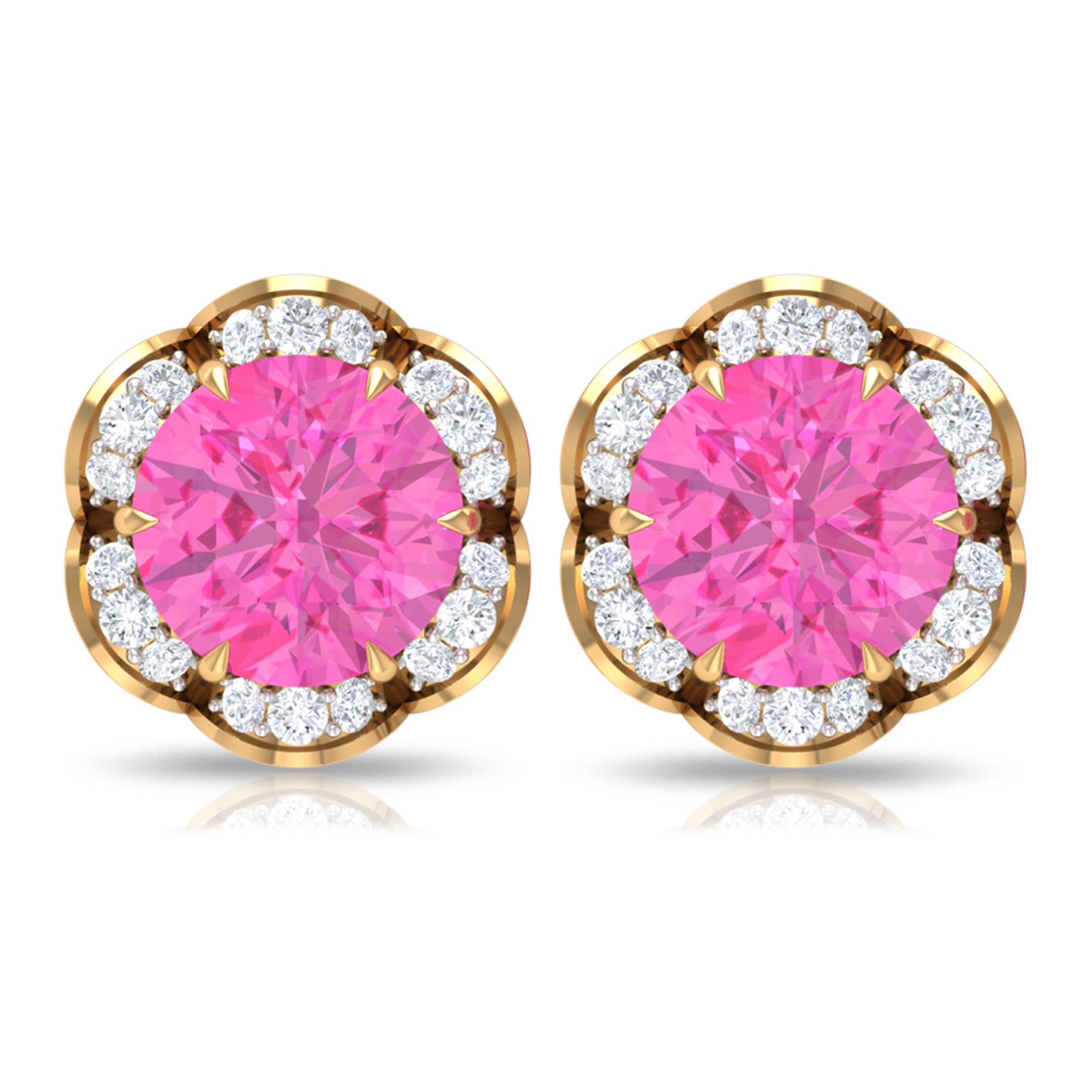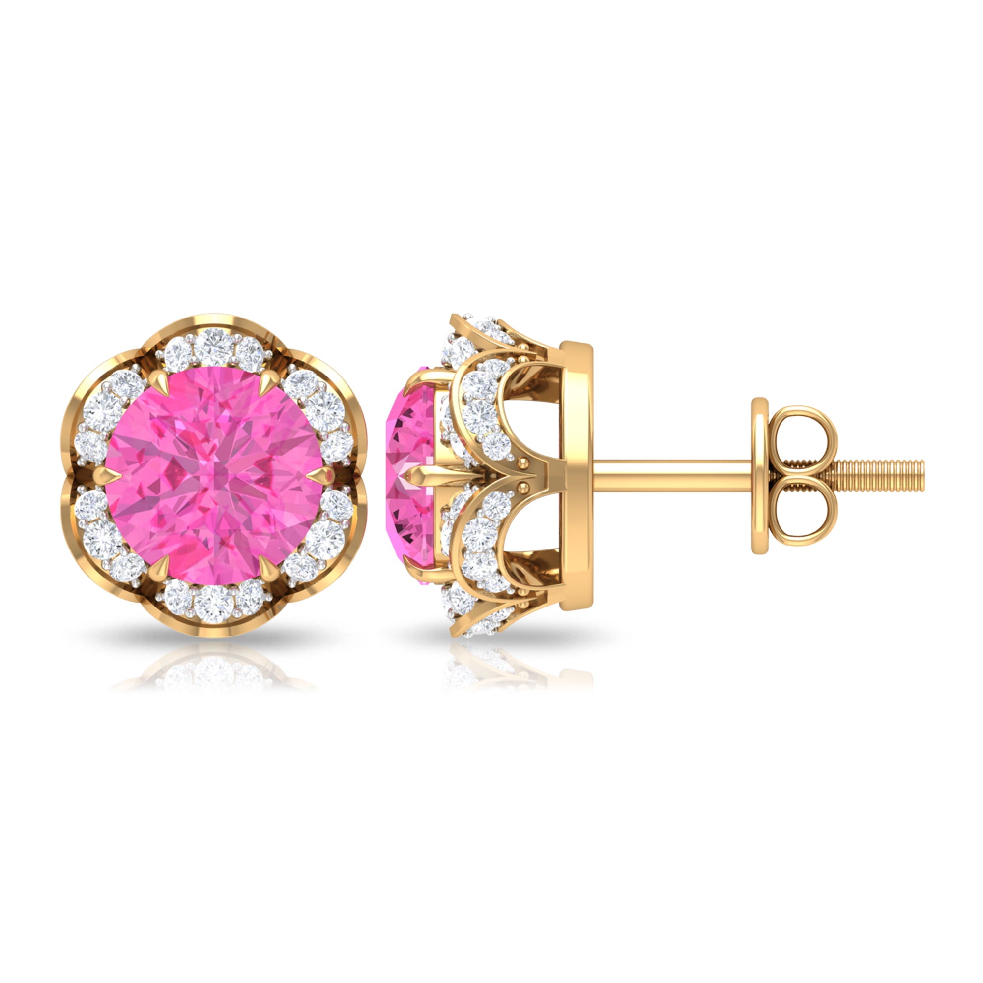 Attain a stylish and refined appearance with these stunning Floral Stud Earrings adorned with Round Cut Pink Sapphire and Diamond gemstones, delicately positioned within an enchanting floral arrangement. Created using premium-quality metal.