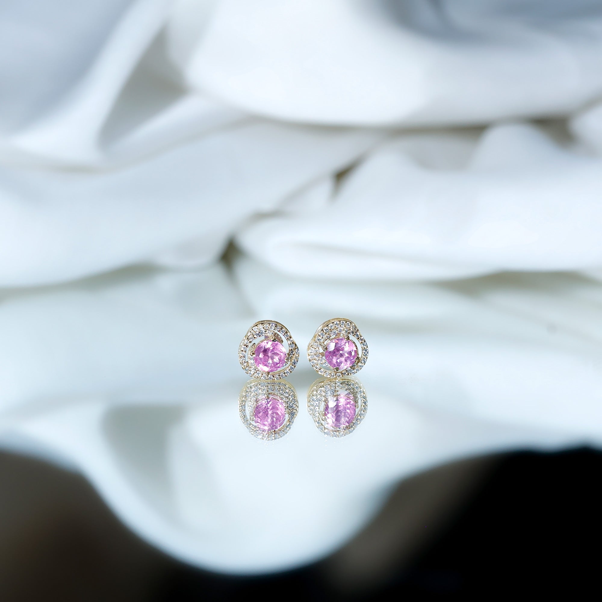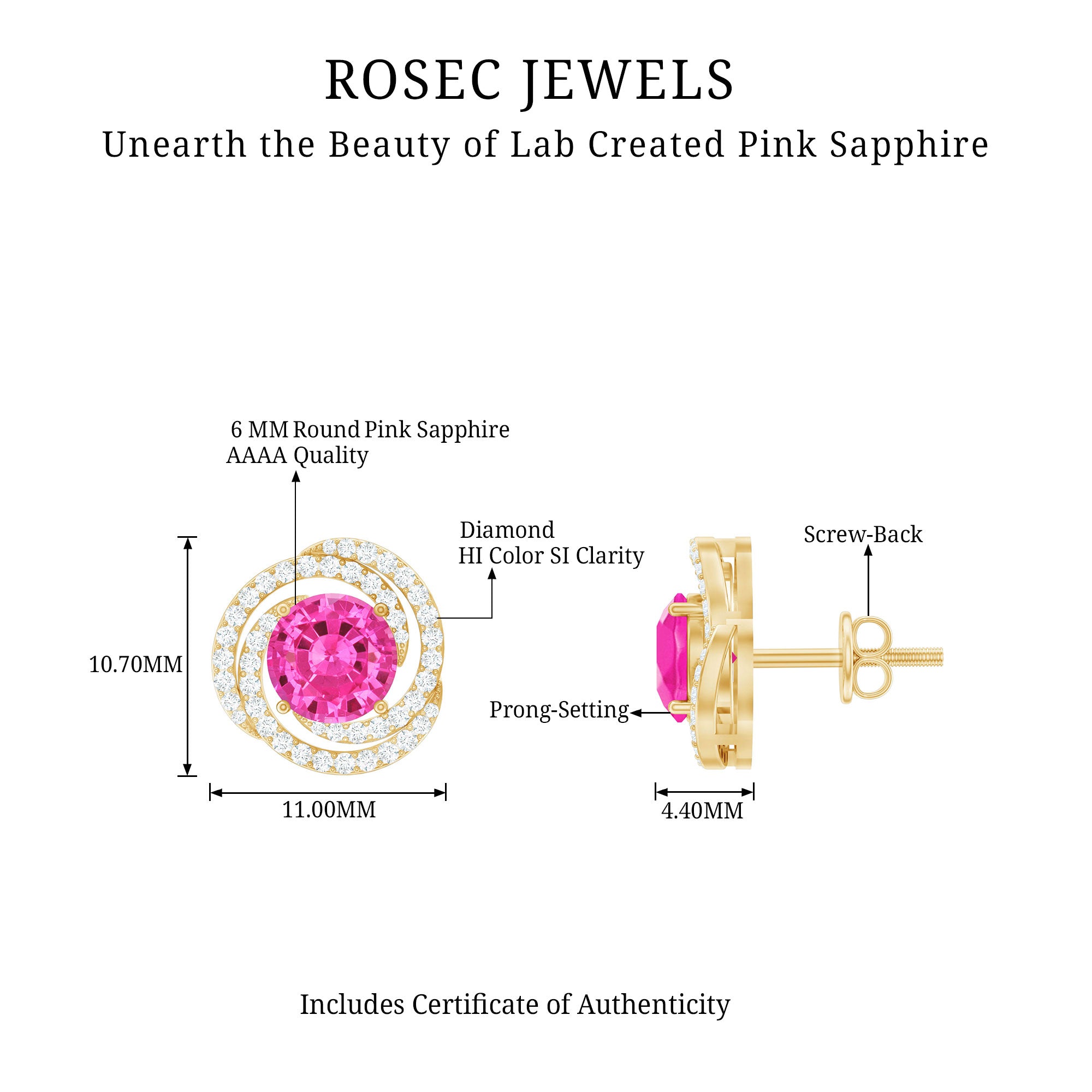 Mark your anniversary with flair through this splendid Swirl Stud Earring. The design showcases a dazzling Brilliant lab-created Round Shape Pink Sapphire held in place by a prong setting, encircled by several layers of Diamond that enhance its distinctiveness and allure.