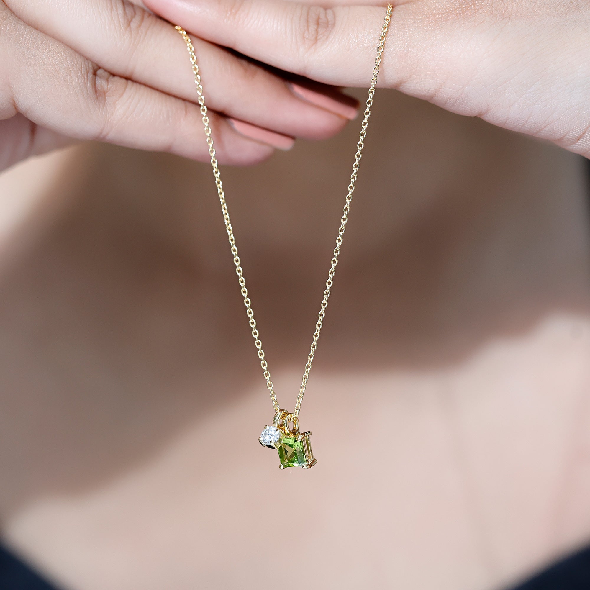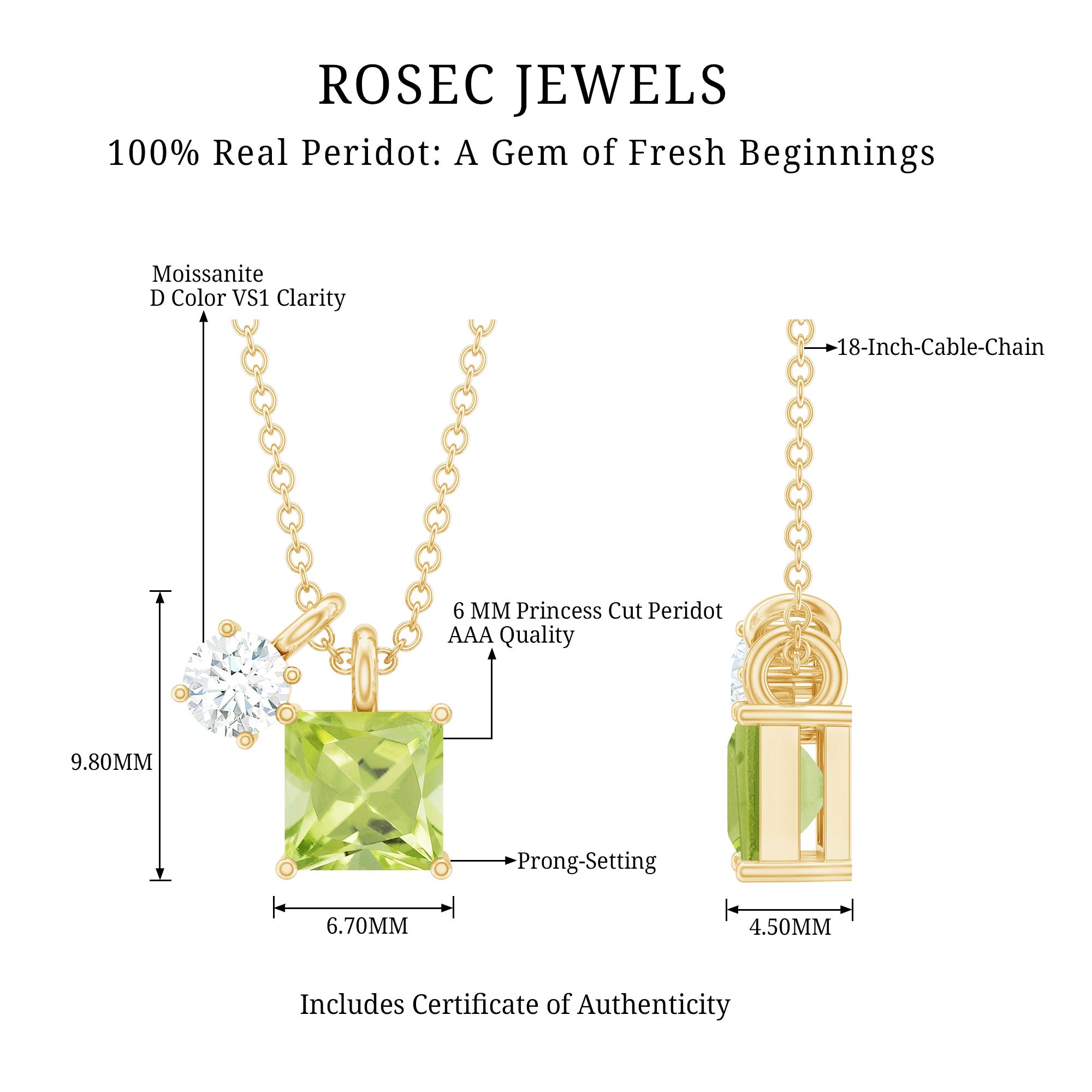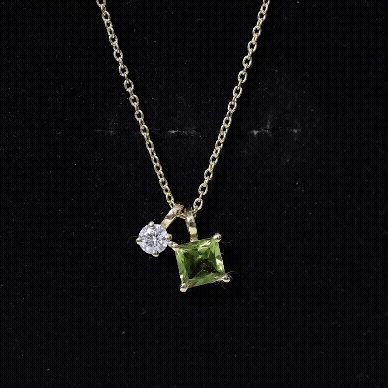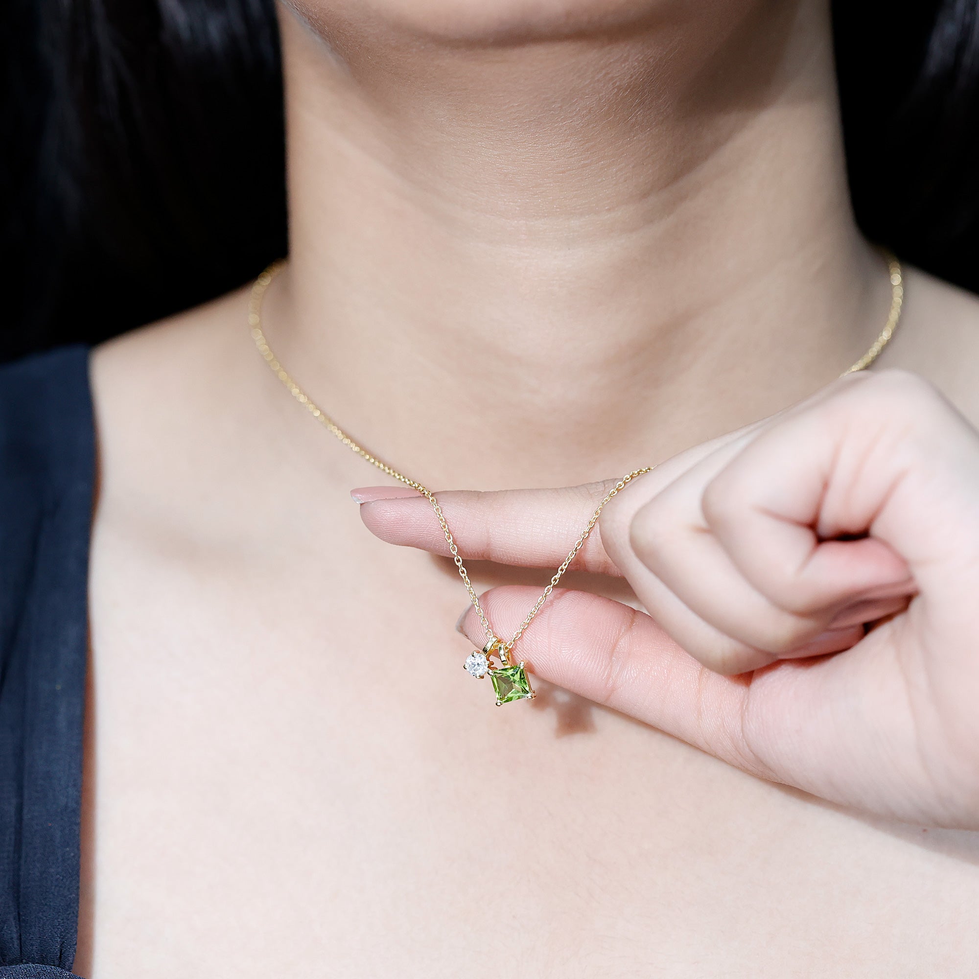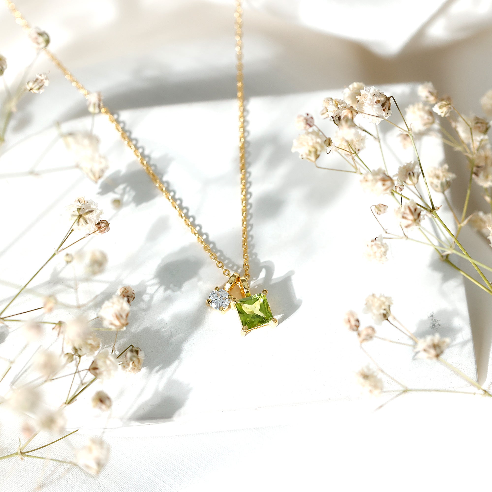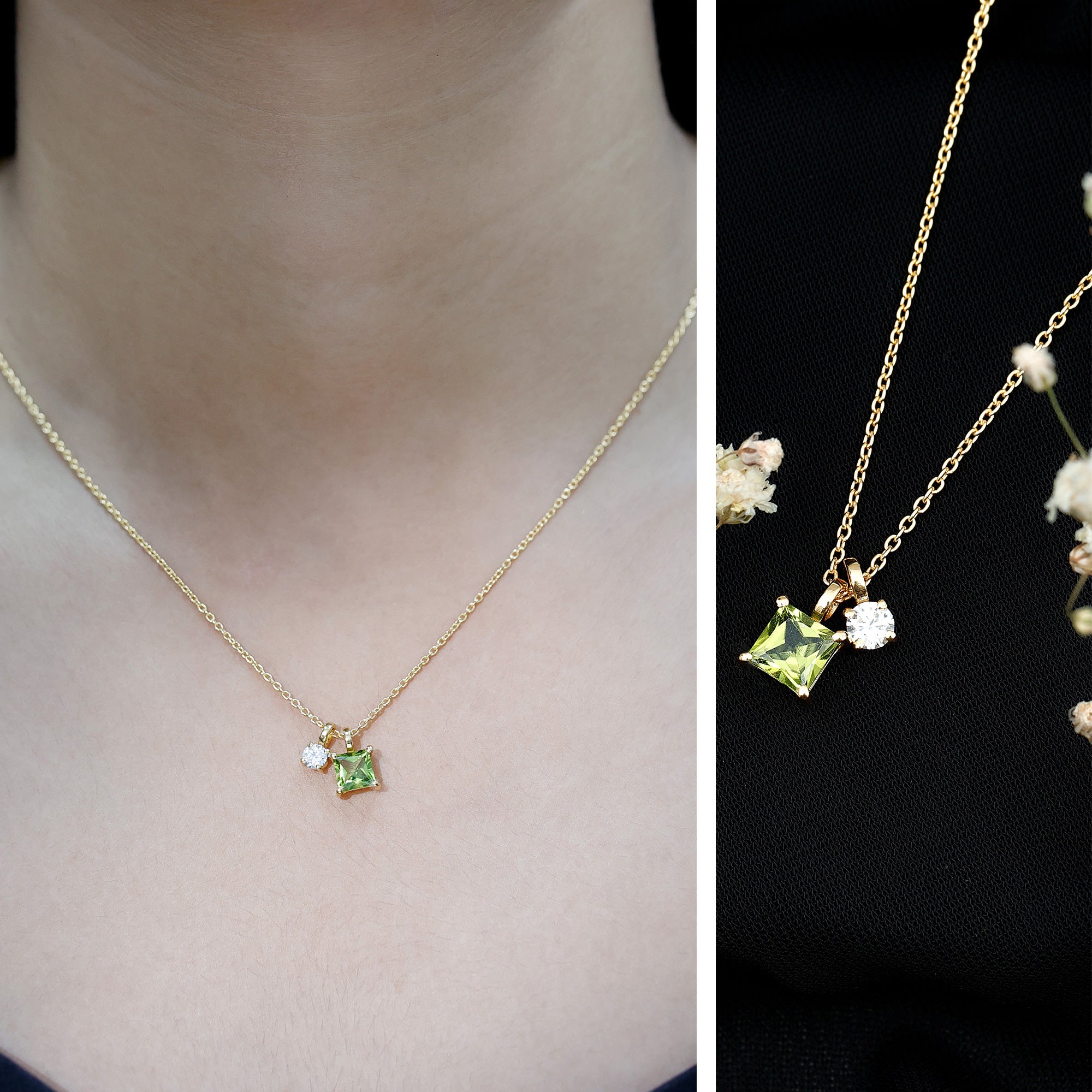 Brighten your jewelry collection with this elegant August Birthstone Necklace, thoughtfully handcrafted in 14K yellow gold plated silver. This delicate design features a 6 MM princess cut Peridot set in prong setting. The Peridot is beautifully faceted to catch the light from every angle, giving off a gentle sparkle that is both soothing and vibrant. Sitting beside it is a 4 MM round brilliant Moissanite, carefully prong set for maximum brilliance. Its dazzling white fire adds the perfect contrast to the soft green of the Peridot, creating a look that is simple yet full of charm. Together, the stones are suspended from a fine, polished cable chain that offers a clean and timeless finish. This Green Peridot Necklace not only carries the vibrant beauty of summer but also holds symbolic meaning. Peridot, the birthstone for August, is said to bring protection, strength, and positivity, making this piece a thoughtful and meaningful gift, whether for yourself or a loved one. With its clean lines, elegant shape, and balance of color and sparkle, this Peridot and Moissanite Necklace offers a modern twist on classic birthstone jewelry. Perfect for layering or wearing solo, it is a versatile everyday piece that carries both beauty and sentiment.