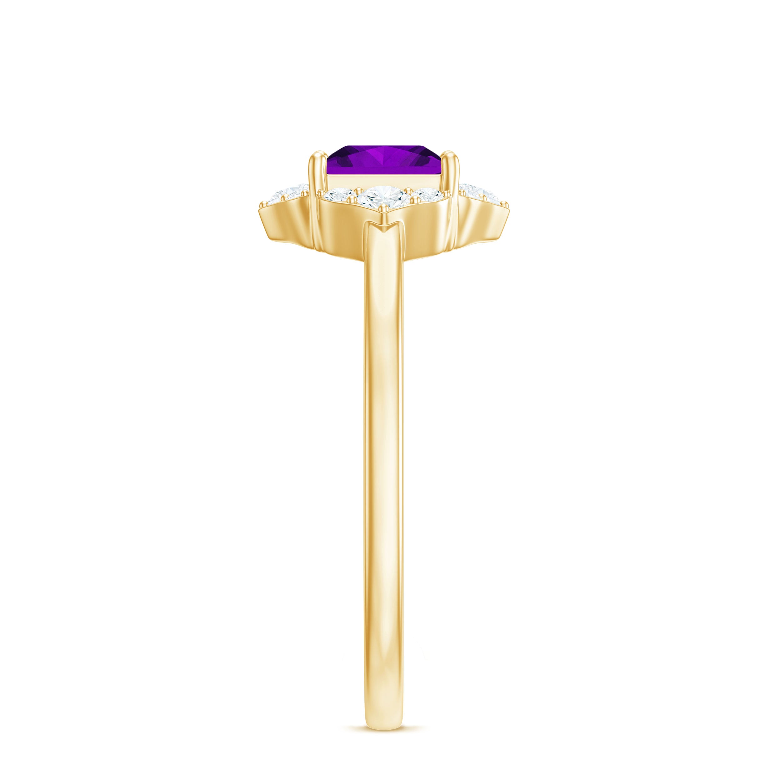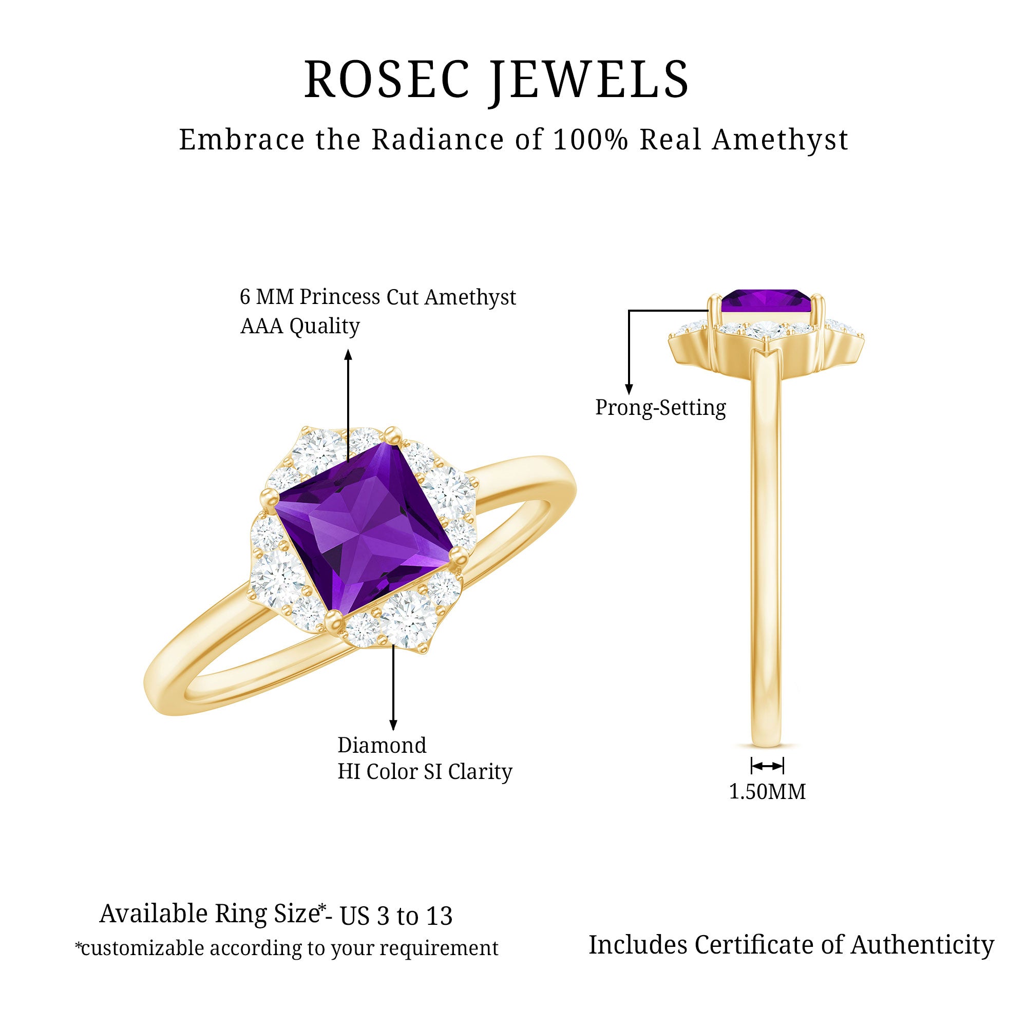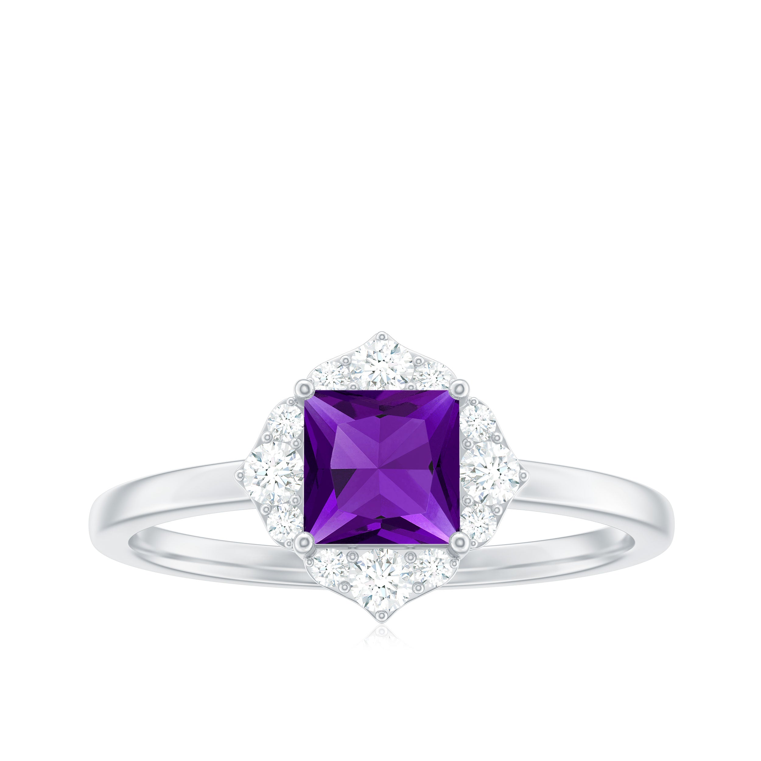 Meant to cover your desk-to-dinner looks, this Amethyst Halo Ring makes a wow-worthy statement any day! It boasts a Center Stone of 5 MM Princess Cut Amethyst that allures with its royal appeal, sheltered by Prong Setting. Taking it from ordinary to extraordinary is the dazzling flower-inspired Halo of Round Shape Diamond. Complement your pretty dresses with it to channel the feminine diva in you or team it up with your casuals for an eye-catching work that isnt too loud, this Certified Amethyst Ring is meant to up your fashion game.