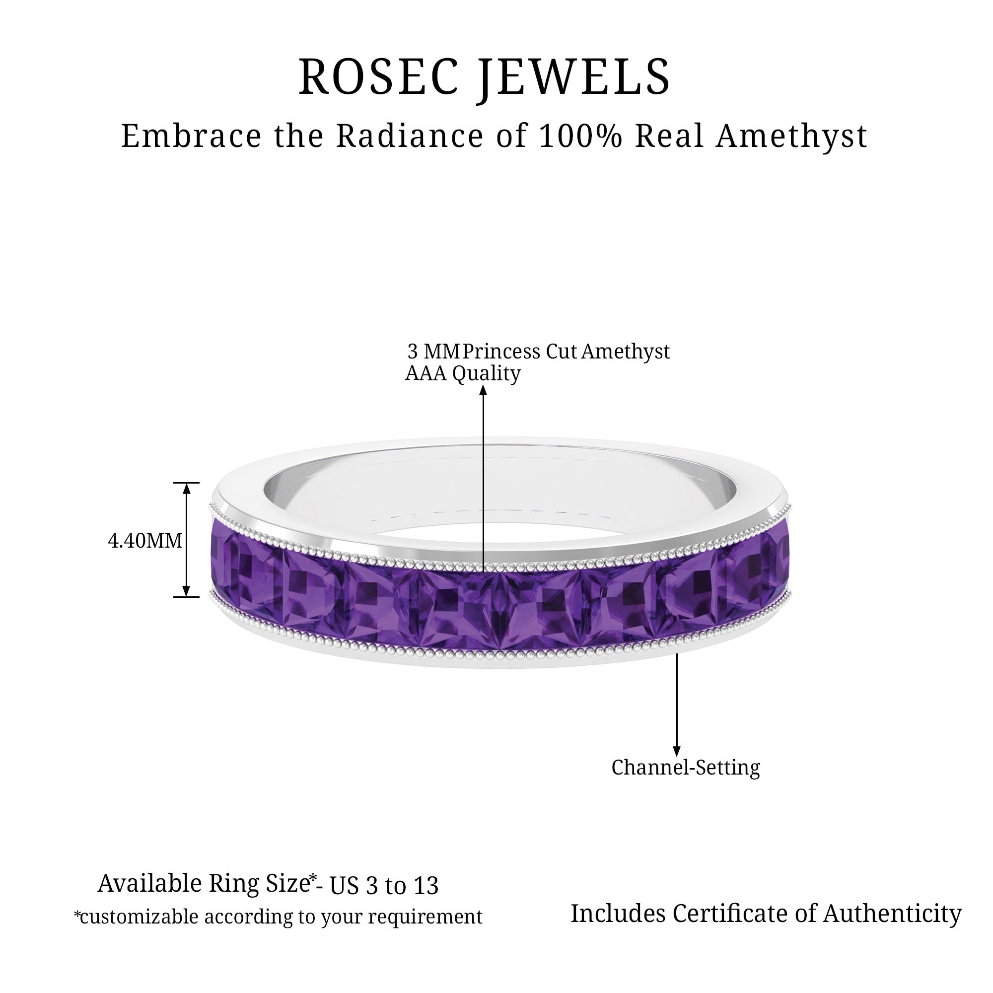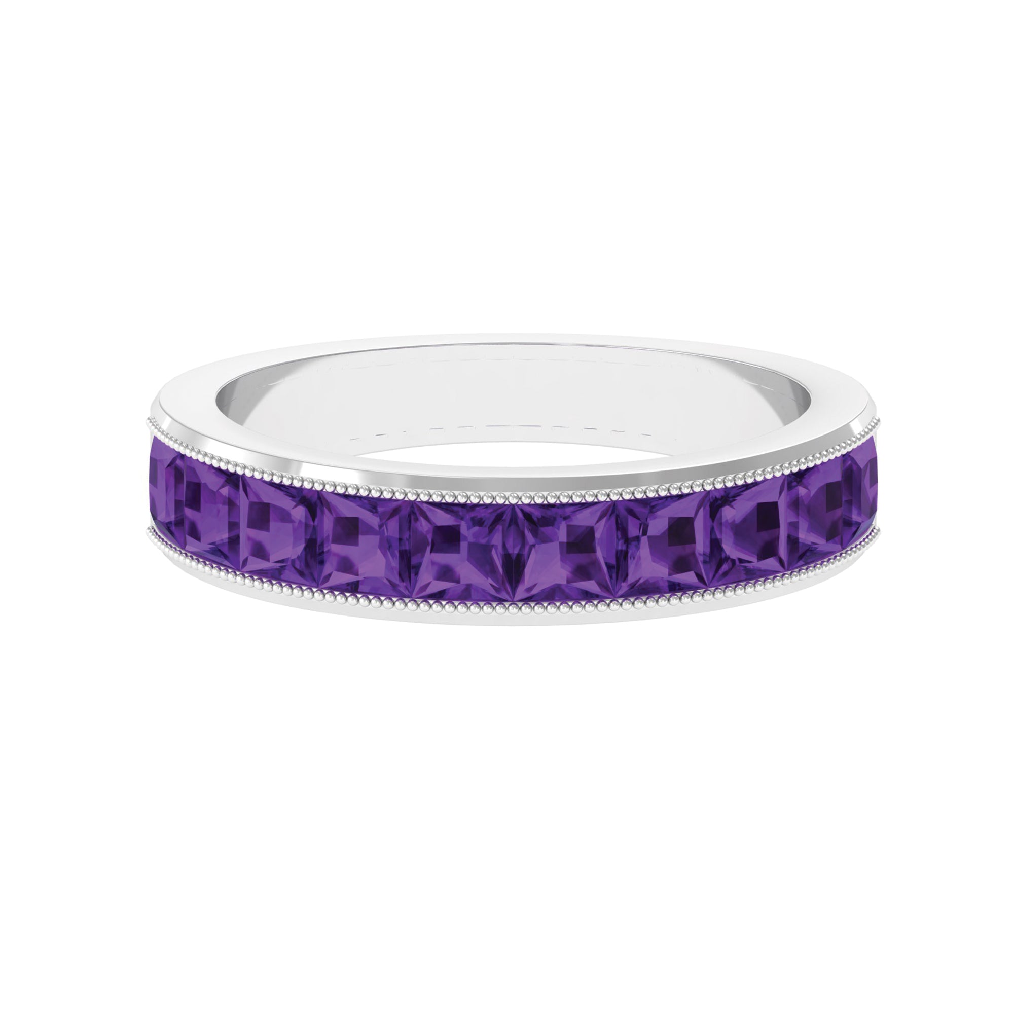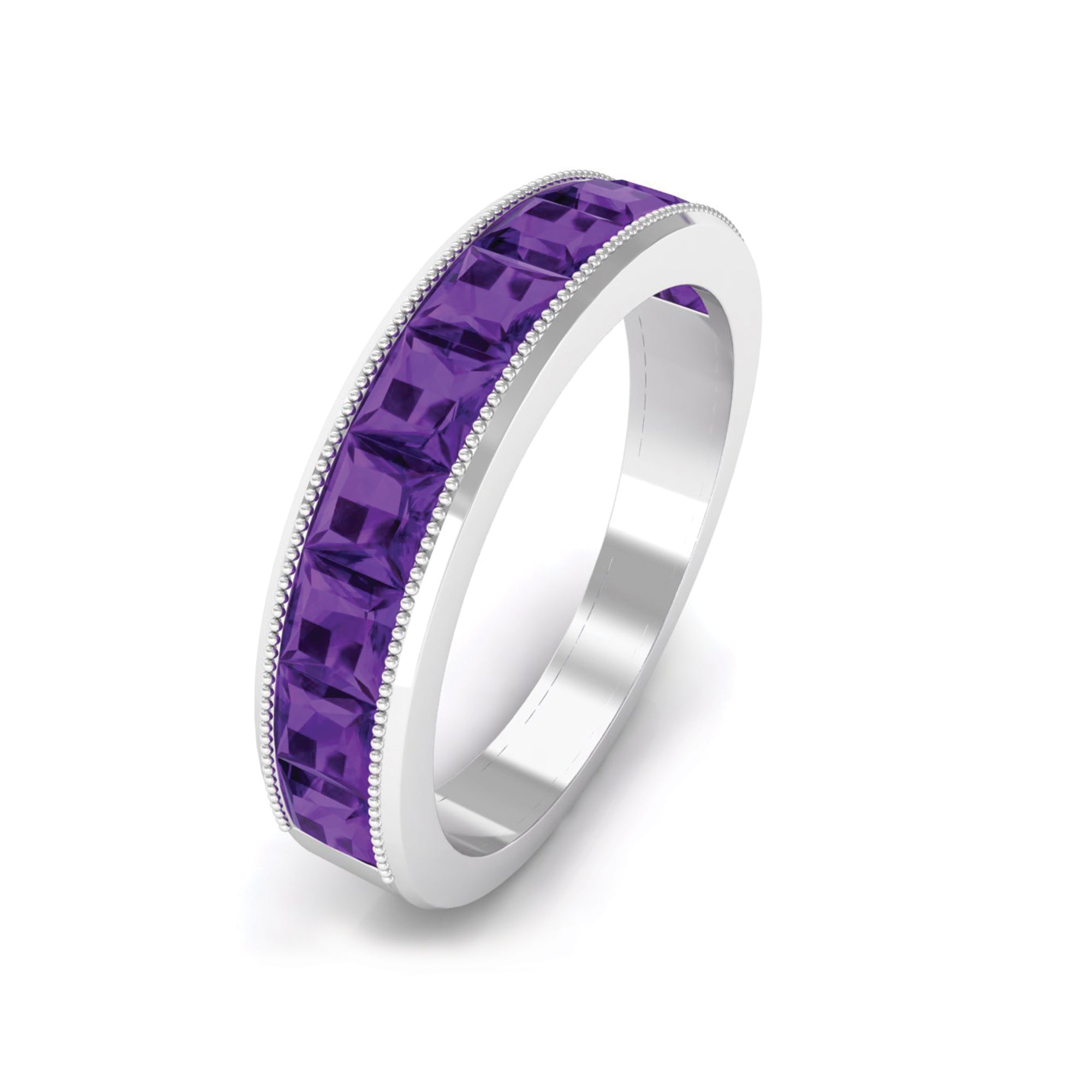 Indulge in the beauty of this Half Eternity Ring adorned with Princess Cut Amethyst gemstone set in Channel Setting with Beaded Details.