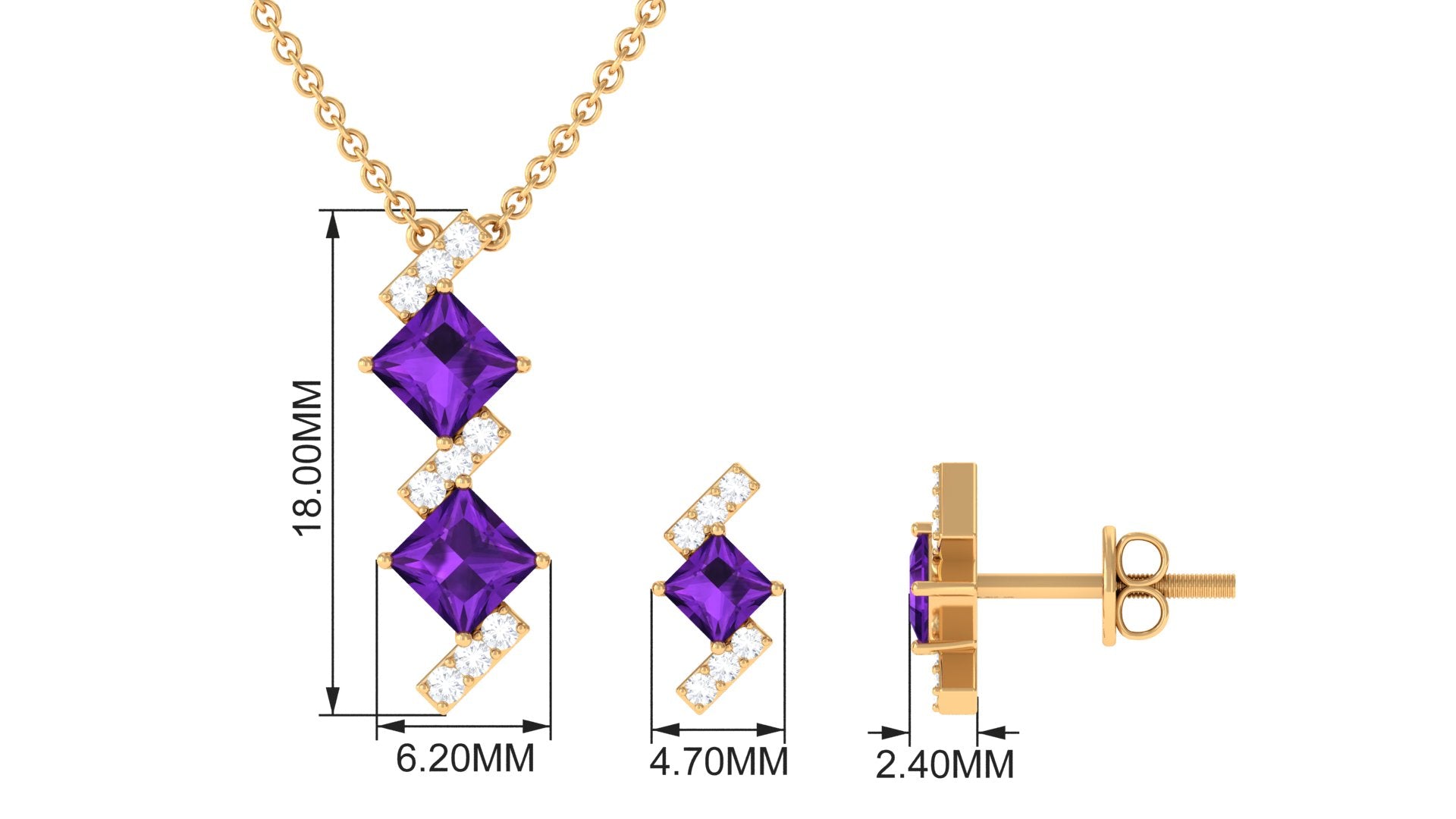 The Amethyst Jewelry Set is simply adorable, and once you lay eyes on it, you wont be able to look away. This pendant set includes a beautiful Pendant and Stud Earrings, featuring a stunning Princess Cut Amethyst stone set in a secure Prong Setting, along with sparkling Diamond accents. Treat yourself to a little pampering with this amazing Amethyst Jewelry Set. With a total weight of 1.5 Carat and AAA Quality certification, you can trust that all of the gemstones in this set have undergone strict quality checks to ensure their beauty and durability.