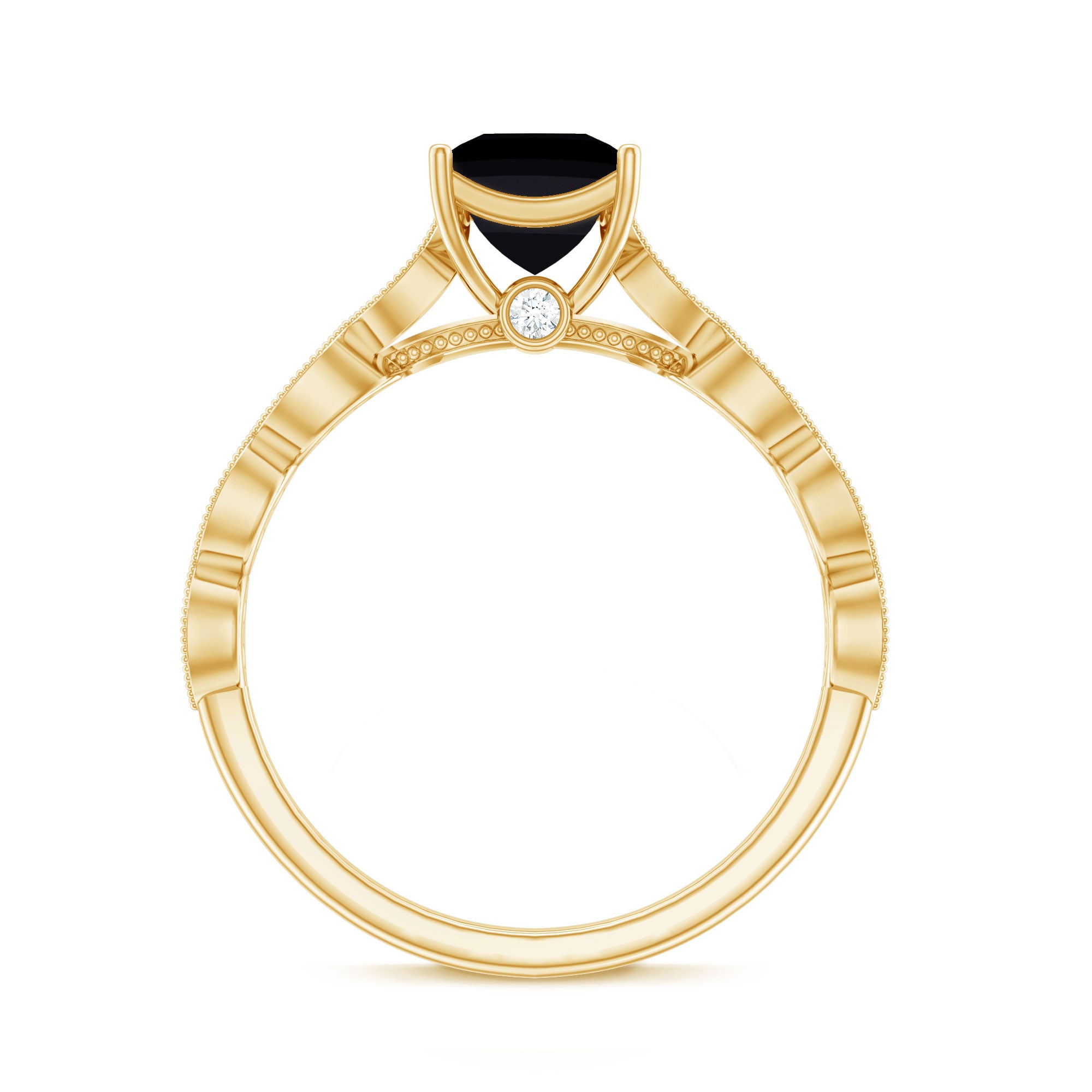 For the woman who defines her own style, this Black Onyx Engagement Ring offers a bold twist on a classic design. Designed to turn heads and steal hearts, this Princess Cut Engagement Ring brings a graceful mix of modern design and timeless beauty. It is embellished with a 5 MM princess cut black onyx, set in a secure prong setting. What makes this Onyx and Diamond Ring truly stand out is the scalloped shank. Crafted with gentle curves and delicate detailing, the band is lined with round cut diamonds that sparkle beautifully against the dark onyx. Each stone is carefully set to create a balanced and radiant look that is eye catching yet refined. Made for those who appreciate something a little different, this Designer Ring offers a wonderful mix of boldness and romance. It is perfect as an engagement ring, a meaningful gift, or a statement piece for someone who loves fine jewelry with character. The thoughtful design ensures comfort and durability, making it suitable for everyday wear or special occasions. With AAA quality black onyx and HI-SI quality diamonds, this Square Engagement Ring is crafted to last and be treasured for years to come.