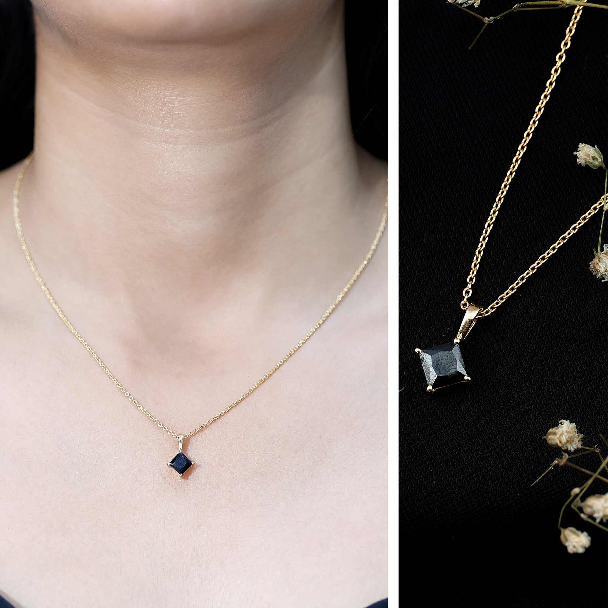 Simple enough for daily wear, yet special enough to be noticed, this Black Spinel Necklace is your new go-to. Handcrafted in 14k yellow gold plated silver, this piece features a striking 5.5 MM princess cut black spinel, held securely in prong setting. The Solitaire Pendant is attached to a smooth, polished bail that flows naturally into a simple yet durable chain, offering a comfortable fit that sits beautifully against the skin. Lightweight and easy to wear, this Princess Cut Necklace is made for daily elegance while still offering that extra bit of charm for special occasions. The AAA quality Black Spinel not only makes a bold fashion statement, but it is also an August birthstone, known to symbolize strength and protection. That makes it an especially meaningful gift for birthdays, personal milestones, or simply a thoughtful surprise for yourself. Comes with a signature jewelry box, this August Birthstone Necklace is ready to celebrate life’s everyday moments or the big ones.