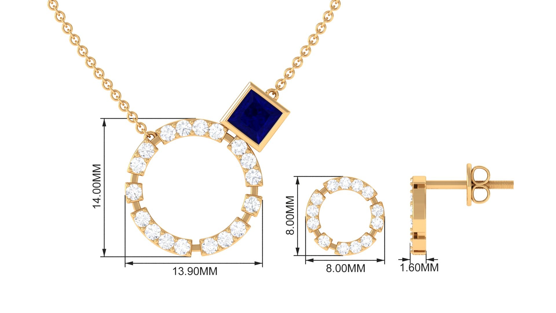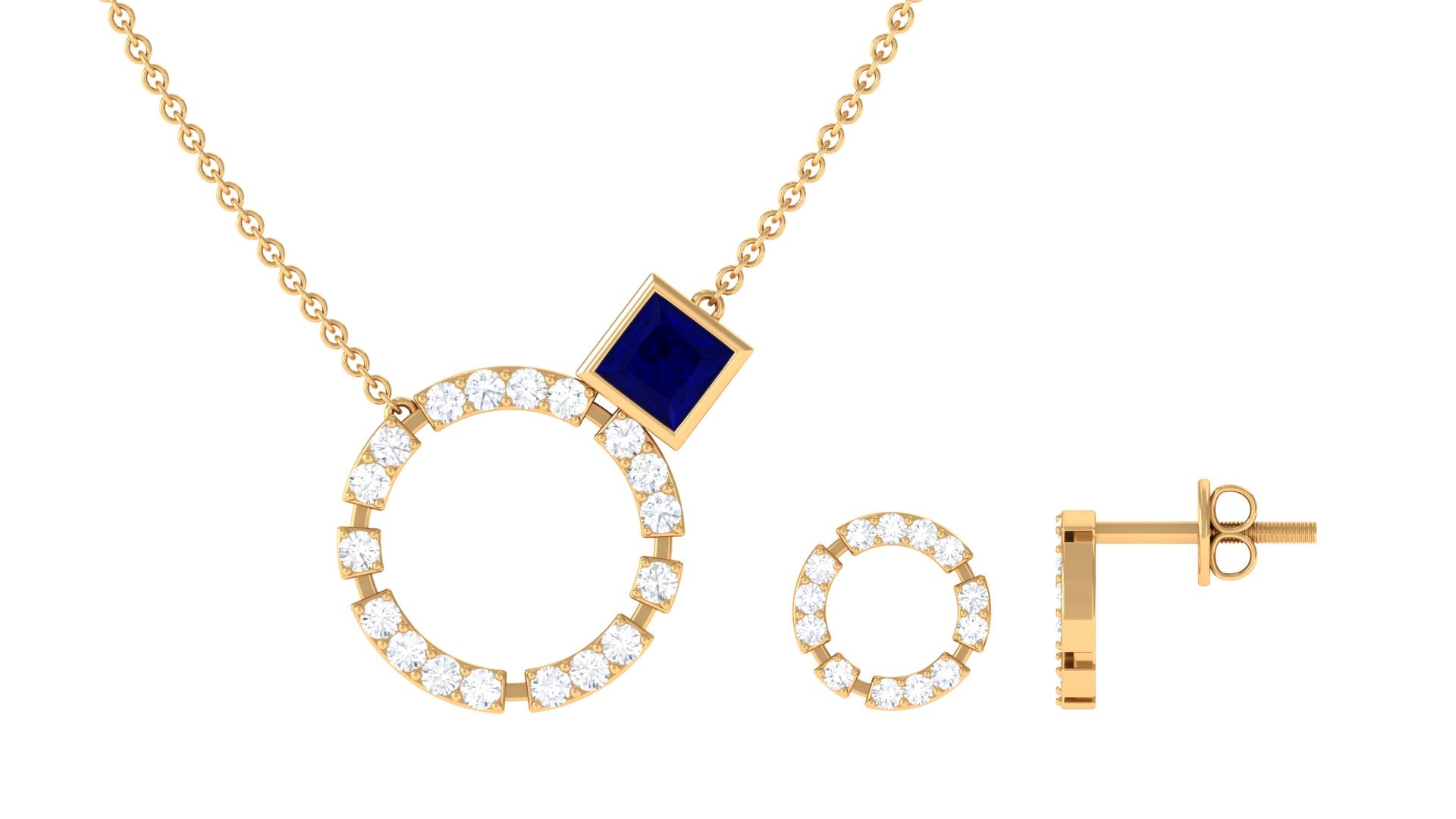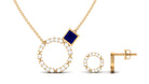 This Eternity Jewelry Set features a stunning Princess Cut Blue Sapphire in a bezel setting, paired with a Round Diamond Open Circle. The combination of the rich blue hue of the Blue Sapphire and the sparkling brilliance of the Diamond creates a captivating and timeless look. This Necklace and Earrings set is perfect for anyone who loves classic yet modern jewelry.