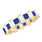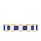 This Alternate Eternity Ring is a stunning piece of jewelry crafted in high-quality gold. The band ring features a sleek gold band with a unique alternate design of princess cut created blue sapphires and baguette cut moissanite, expertly set to create a beautiful and eye-catching look. The stones run all the way around the band, adding a continuous sparkle and shine to the design. The combination of the vibrant created blue sapphires and the brilliant moissanite makes this ring a truly special piece that is perfect for special occasions