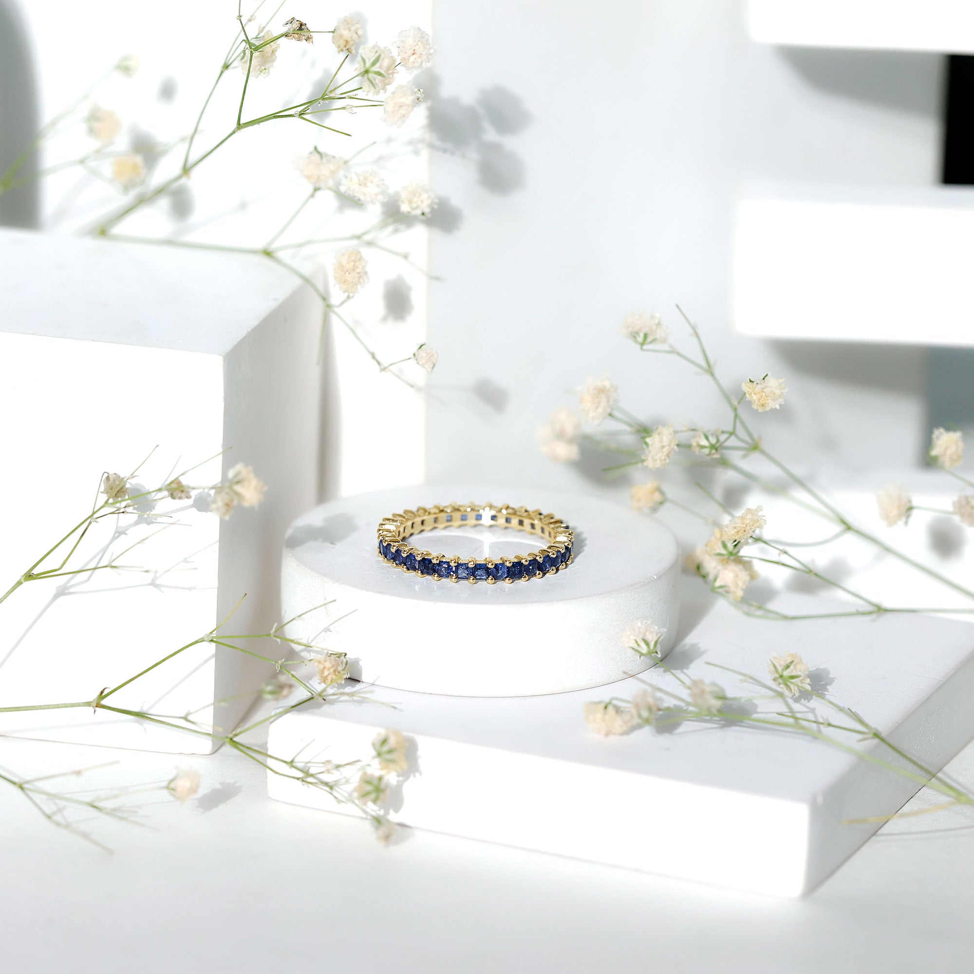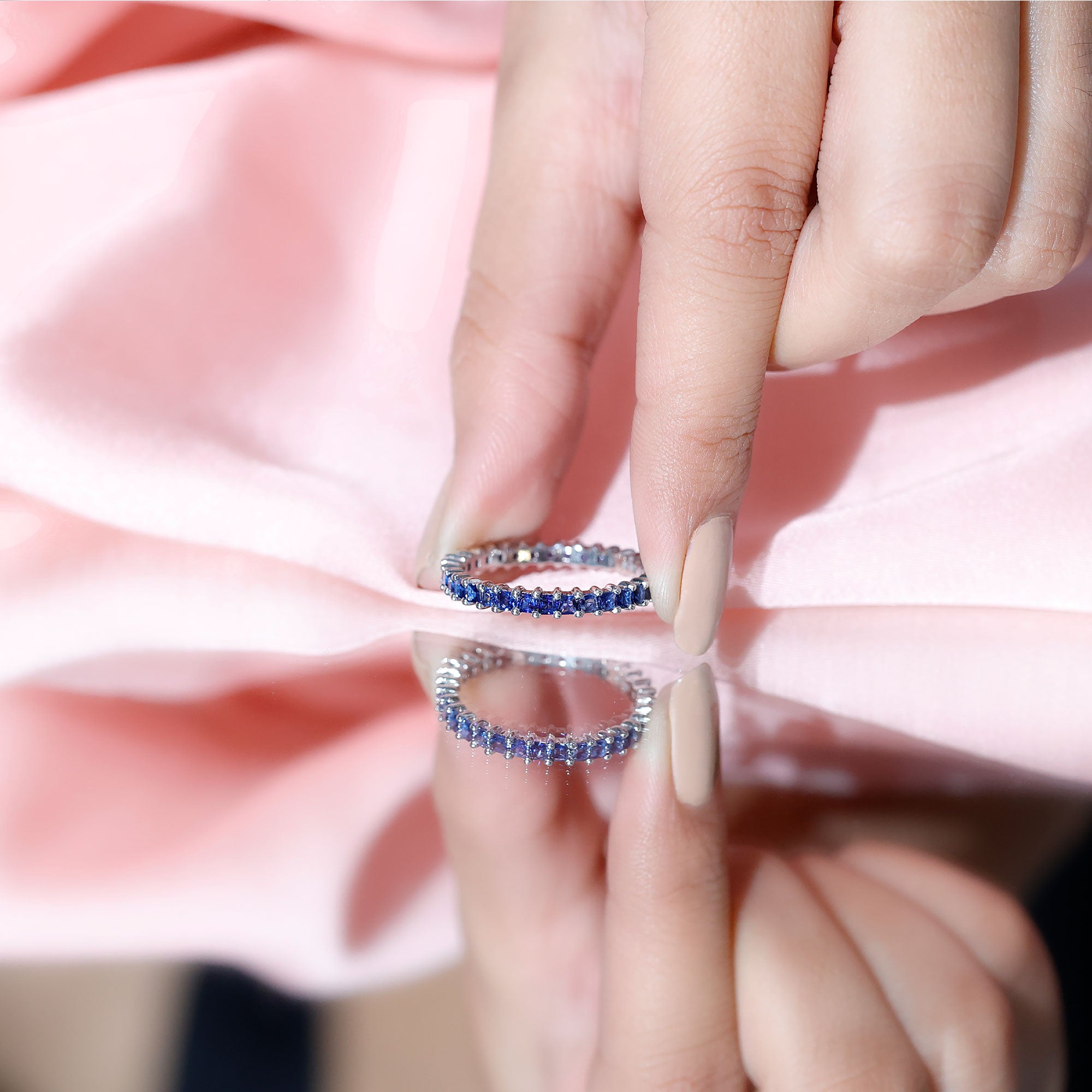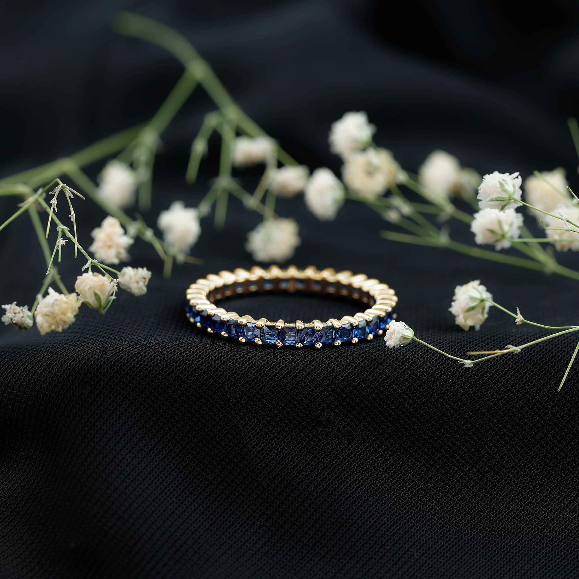 Full Eternity rings are a beautiful way to add a little sparkle to your life, and they are a popular choice to stack with engagement rings. Featuring Princess Cut Lab Created Blue Sapphire in a shared prong setting will shine brilliantly on your fingers when you layer it up with your Engagement Ring as a Wedding Band. The royal blue shade of the Lab Grown Blue Sapphire is mesmerizing, and the stones quality is AAAA. This Sapphire Wedding Band not only adds a contrast to the traditional engagement rings but will add charm in your overall look. This Wedding Eternity Band is handcrafted by skilled artisans. This Princess Cut Eternity Ring is available in a various sizes and delivered in a signature jewelry box. Weather wear it single or flaunt it with an another ring, this Sapphire Eternity Ring looks amazing in both styles.