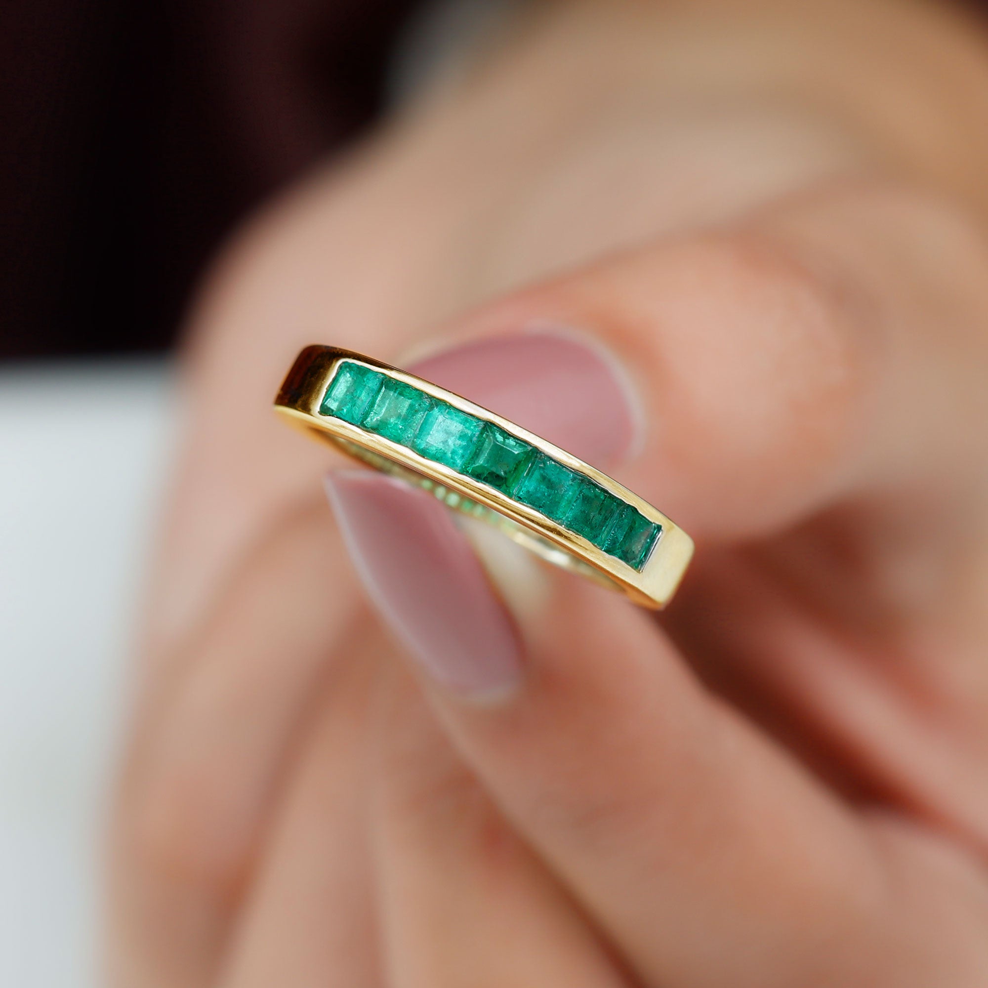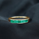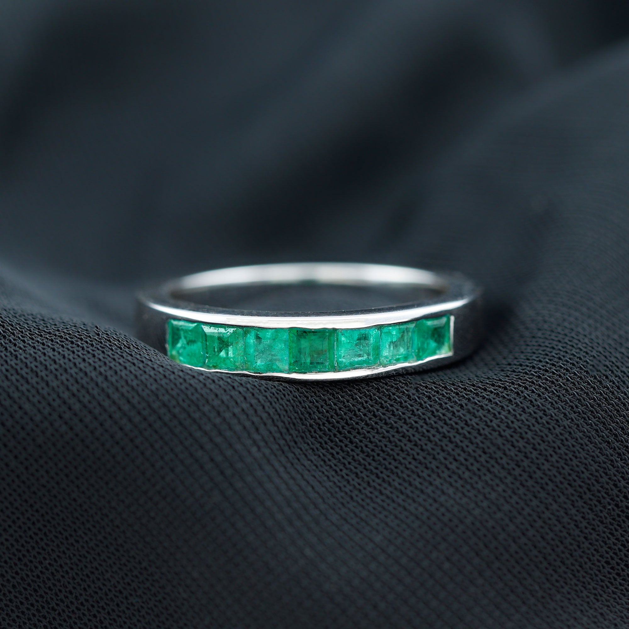 A beautiful 7 Stone Emerald Wedding Band is a classic piece of jewelry for the woman who loves to adore with a modern touch. The Princess Cut Emerald in Channel Setting facet has a positive vibrant striking impact creating a luxurious and a royal look. This Emerald Band Ring is an excellent choice for a wedding day, as a cocktail ring or even as a May Birthstone Ring. The exquisite Channel Set Emerald Ring is a one-of-a-kind ring that will leave her breathless. The ultimate symbol of eternal love this Emerald Half Eternity Ring has an elegant design with a sophisticated and charming appeal. This dazzling Wedding Band with Emerald has its glossy appearance when worn all alone or stacked with other ring to complement your engagement ring.