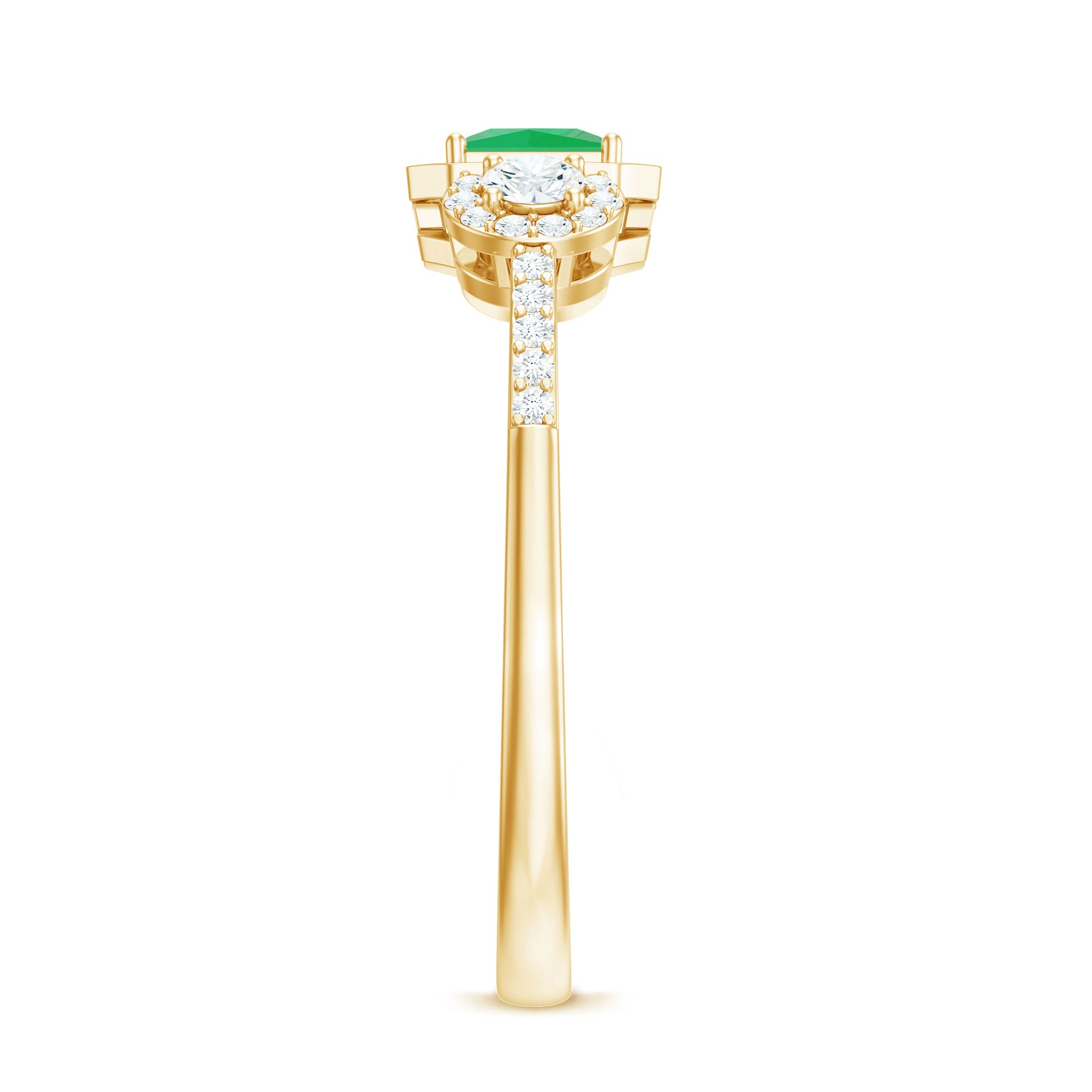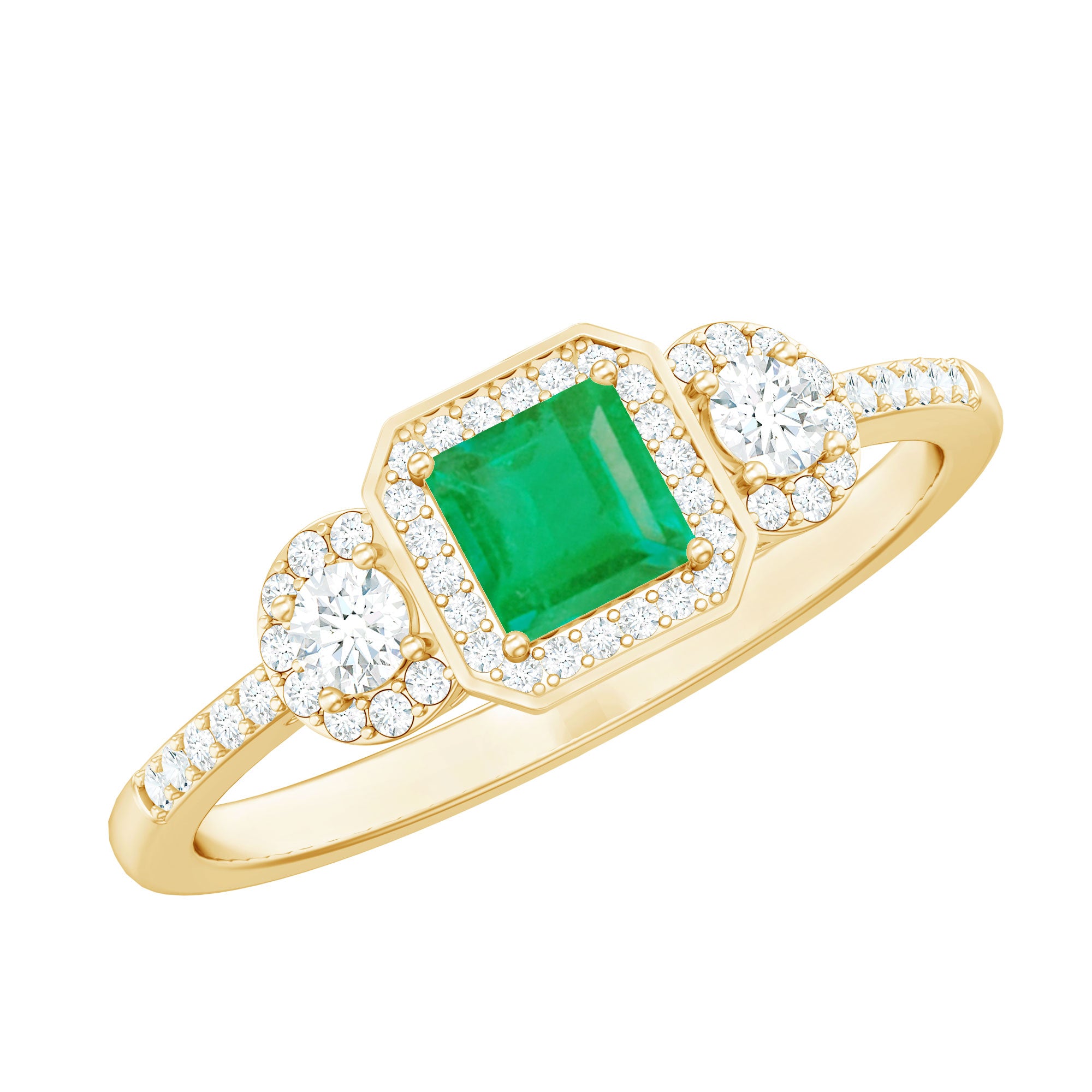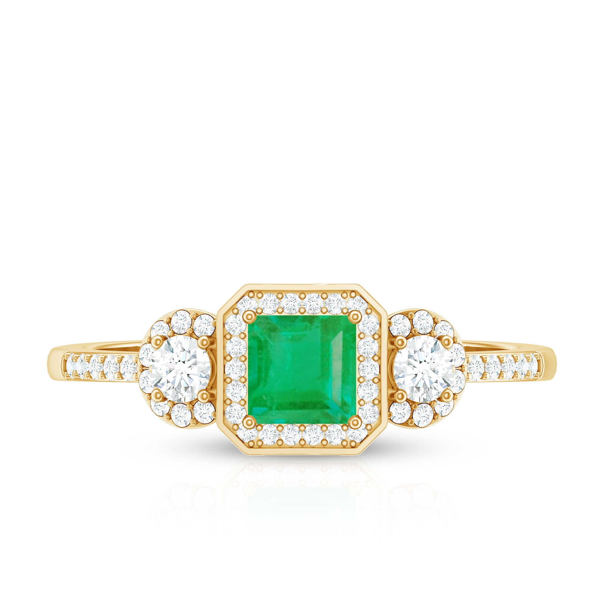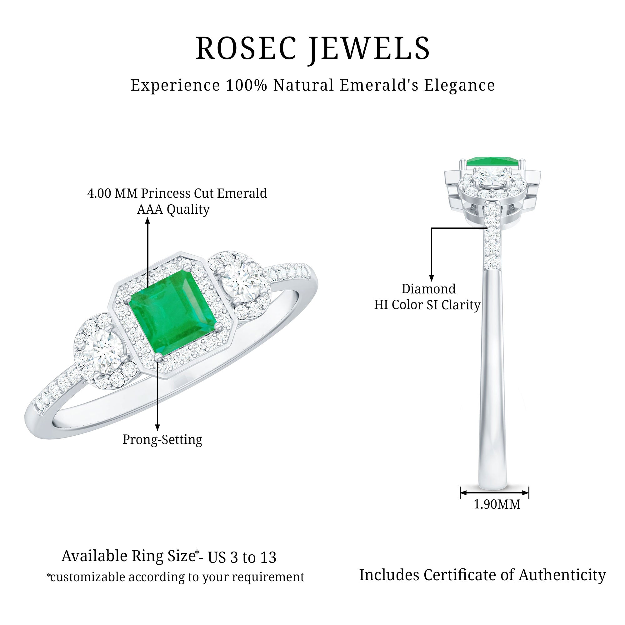 Significant moments deserve a touch of brilliance - this Emerald Engagement Ring is here to make a statement with its remarkable shine. At the heart of this Princess Cut Engagement Ring lies a 4 MM princess cut emerald, securely set in prongs and encircled by a breathtaking halo of delicate round cut diamond stones. The band, adorned with diamond, enhances the sparkle from every angle, perfectly merging simplicity with elegance. This exquisite Princess Cut Emerald Ring is crafted to ensure your moment is truly memorable. Do not overlook this Emerald Halo Ring, allowing your forever to radiate even more brilliantly. It captures the captivating charm of a Timeless Engagement Ring, meticulously designed and available in various metal choices to match your preferences. With sizes available from 3 to 13 according to US standards, we also provide a complimentary ring sizer to help you discover your perfect fit without any last-minute concerns. Packaged in a signature jewelry box ideal for gifting, this Halo Engagement Ring assures that every occasion is remarkable for your Girlfriend, Fiancée, Wife, or Mother.