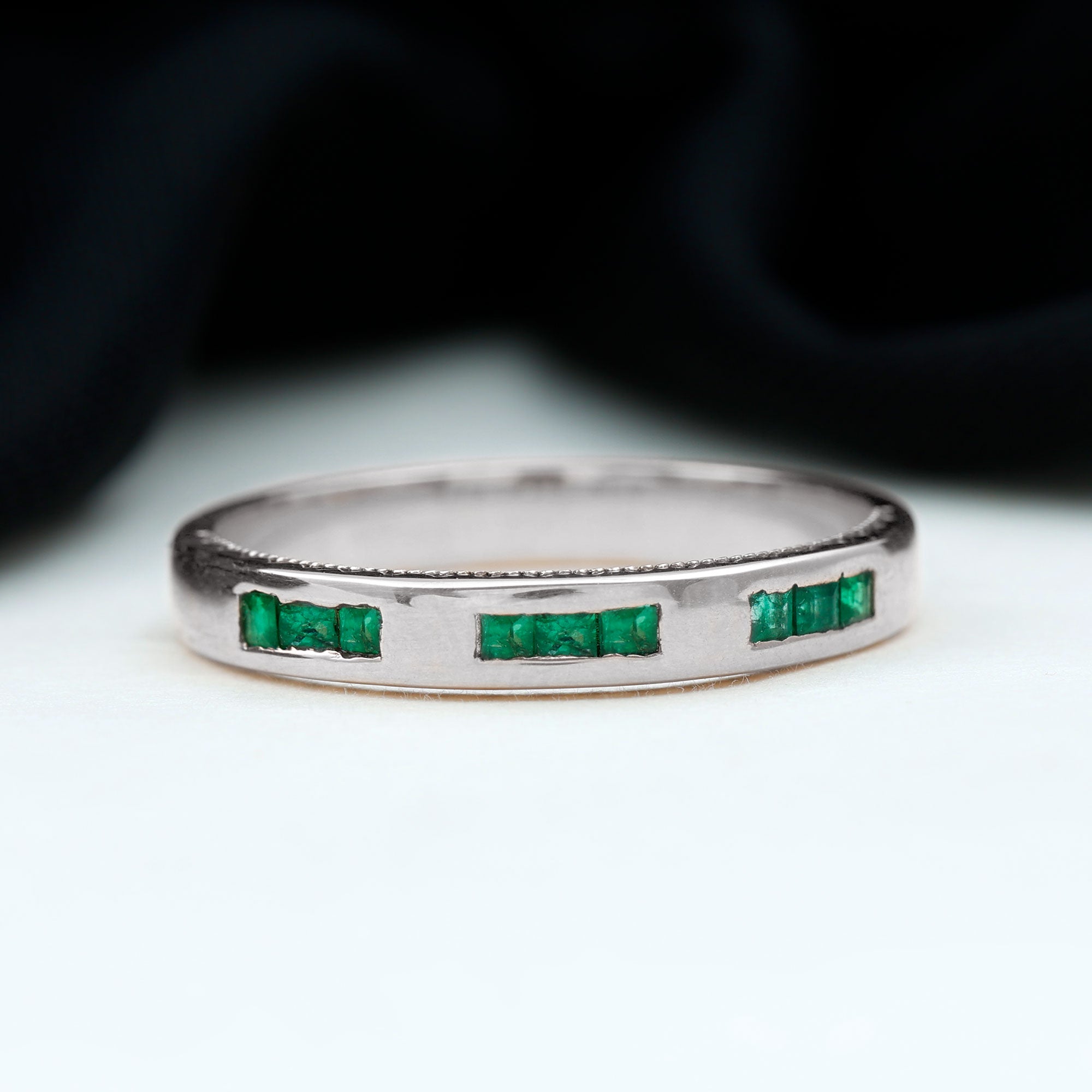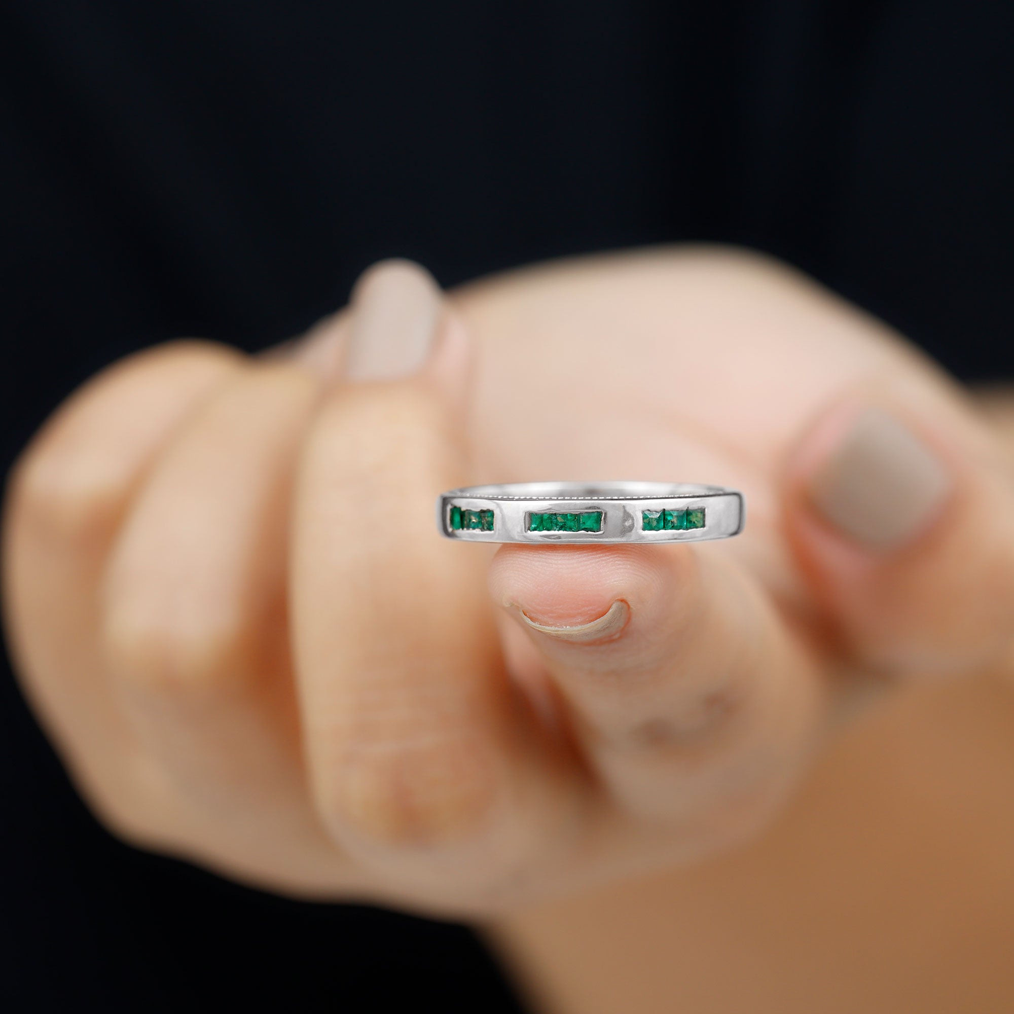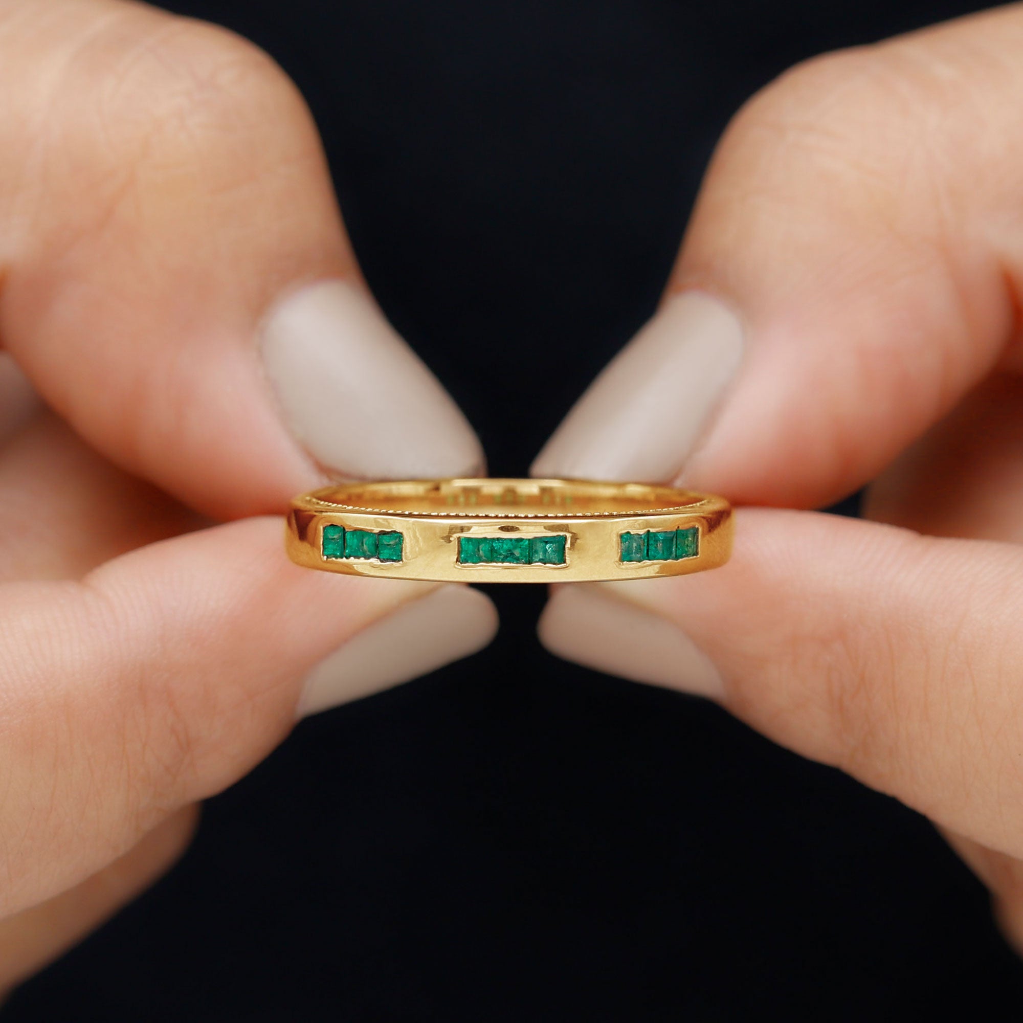 Impress your loved one with this stunning Emerald Wedding Band designed for men. It features trios of princess cut emeralds, artfully arranged in evenly spaced sections across the half band, resulting in a harmonious appearance. The natural emeralds are securely channel set to guarantee they will shine brilliantly for a lifetime. This Princess Cut Band is an ideal jewelry for him as it can be worn for any occasion and complements any outfit beautifully. Start your forever with our Channel Set Wedding Band and express your commitment in style. It offers a wide range of metal color options to choose from and is also available in various ring sizes. This band ring includes a certificate of authenticity for the gemstones and is presented in a luxurious jewelry box. The exquisite Emerald Band Ring will dazzle endlessly. So dont hesitate, and get your hands on this enchanting May Birthstone Ring and make him feel like royalty.