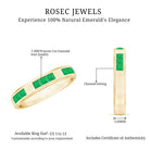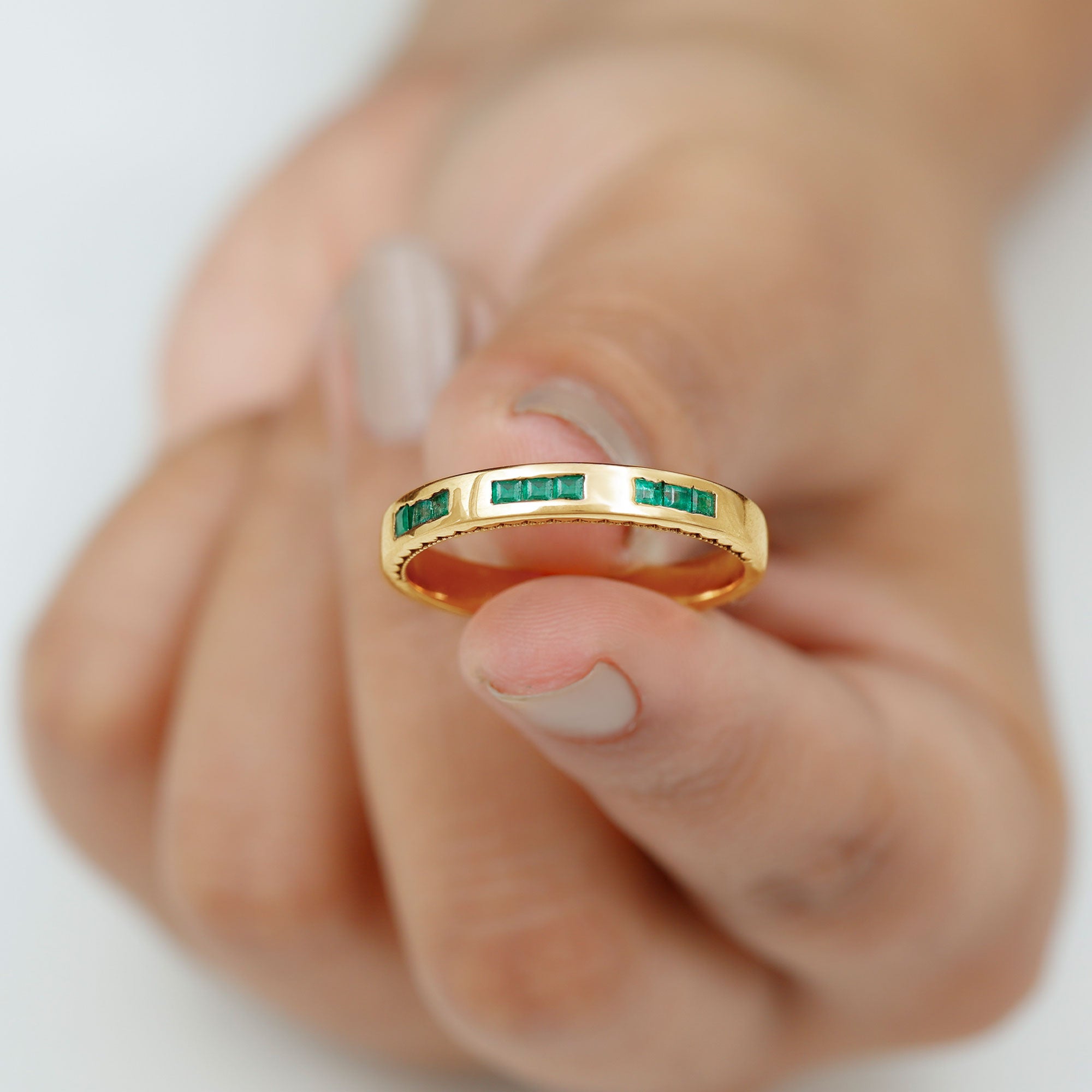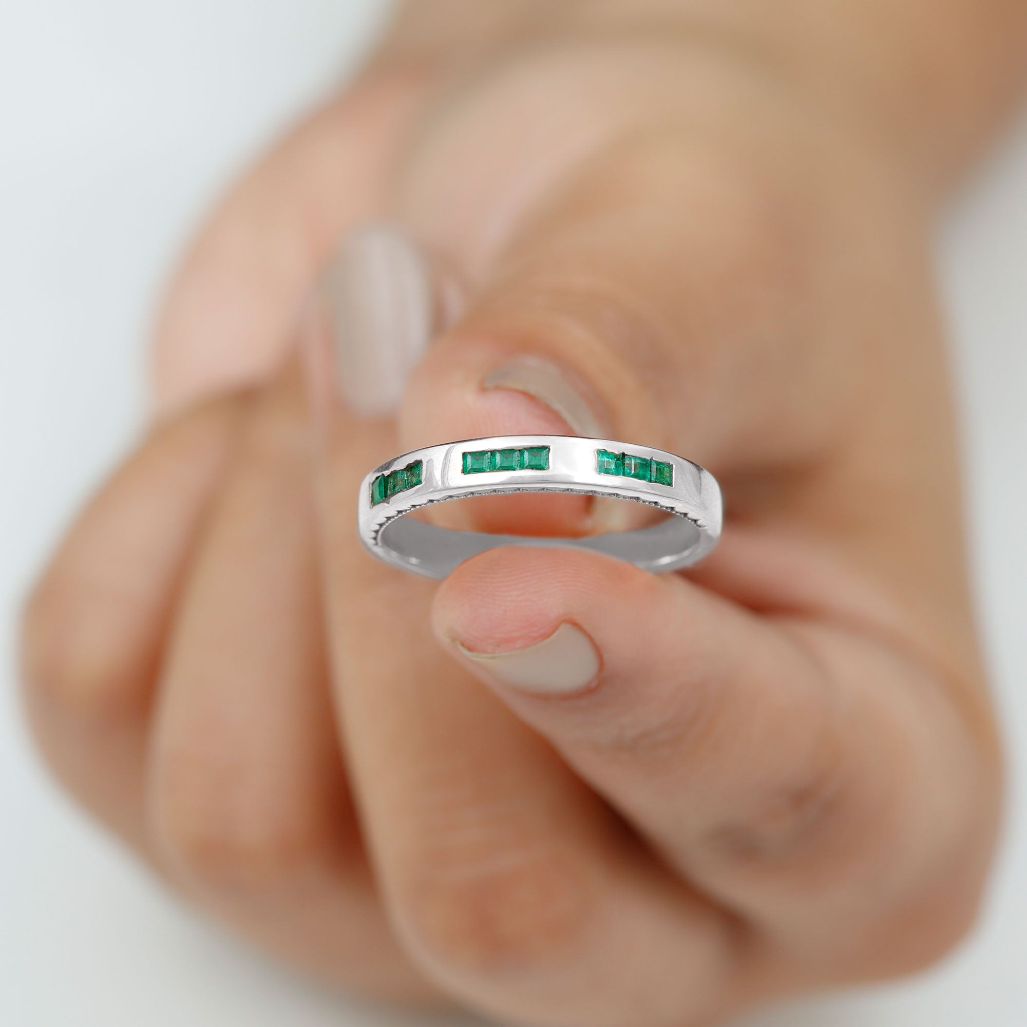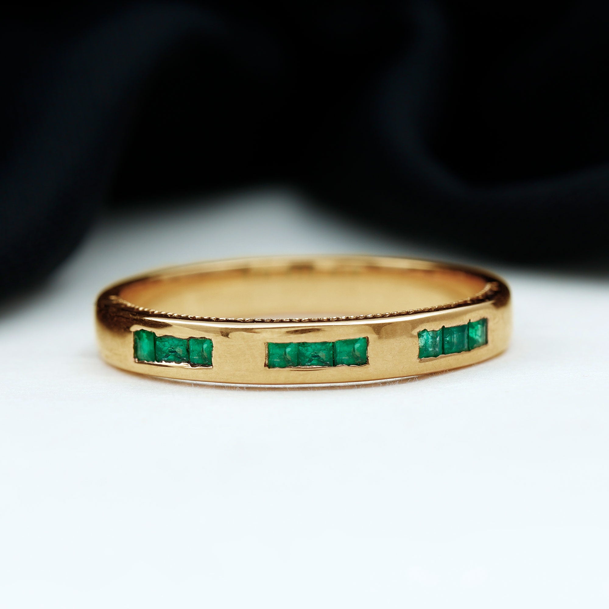 Impress your loved one with this stunning Emerald Wedding Band designed for men. It features trios of princess cut emeralds, artfully arranged in evenly spaced sections across the half band, resulting in a harmonious appearance. The natural emeralds are securely channel set to guarantee they will shine brilliantly for a lifetime. This Princess Cut Band is an ideal jewelry for him as it can be worn for any occasion and complements any outfit beautifully. Start your forever with our Channel Set Wedding Band and express your commitment in style. It offers a wide range of metal color options to choose from and is also available in various ring sizes. This band ring includes a certificate of authenticity for the gemstones and is presented in a luxurious jewelry box. The exquisite Emerald Band Ring will dazzle endlessly. So dont hesitate, and get your hands on this enchanting May Birthstone Ring and make him feel like royalty.