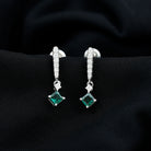 You will definitely be totally enchanted by these Lab Created Emerald Dangle Earrings, which really showcase stunning beauty and a one-of-a-kind design. Crafted with only top-notch materials, this piece features gorgeous prong set stones expertly arranged in 14k white gold plated silver. Adding to the breathtaking design are the AAAA quality lab created emeralds that create a striking contrast with the D color, VS1 clarity moissanite stones. Our special Dangle Drop Earrings come with a 4 MM princess cut lab emerald hanging from a bar adorned with round cut Moissanite stones. Perfectly crafted in the lab, their secure screw back closures beautifully enhance the elegant flow of their design. These Wedding Earrings will add a touch of elegance to your bridal look. They are guaranteed to stay put when fastened correctly, whether you are dancing the night away, enjoying activities, or simply stealing the spotlight at a gathering.