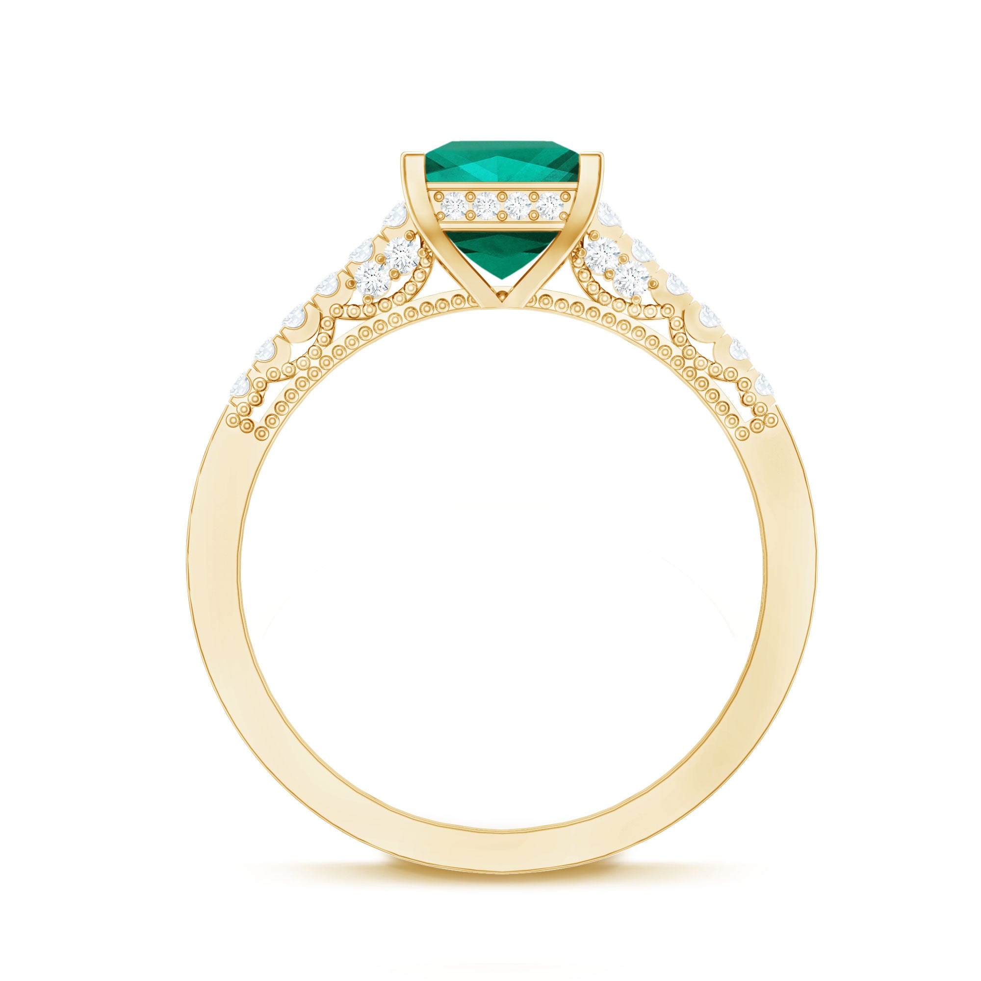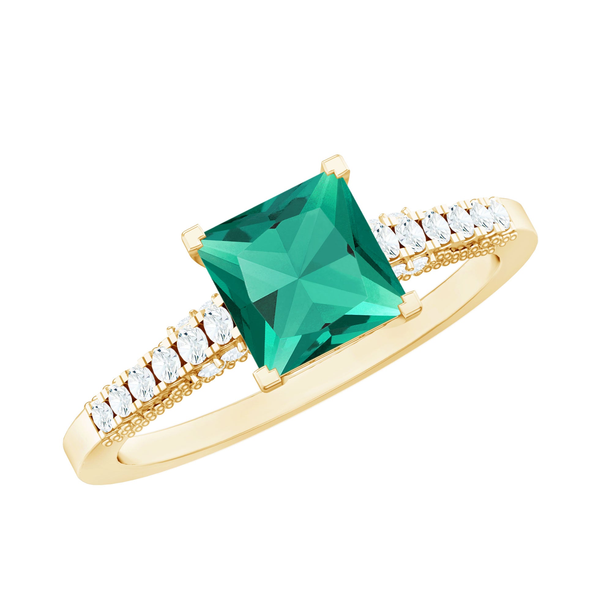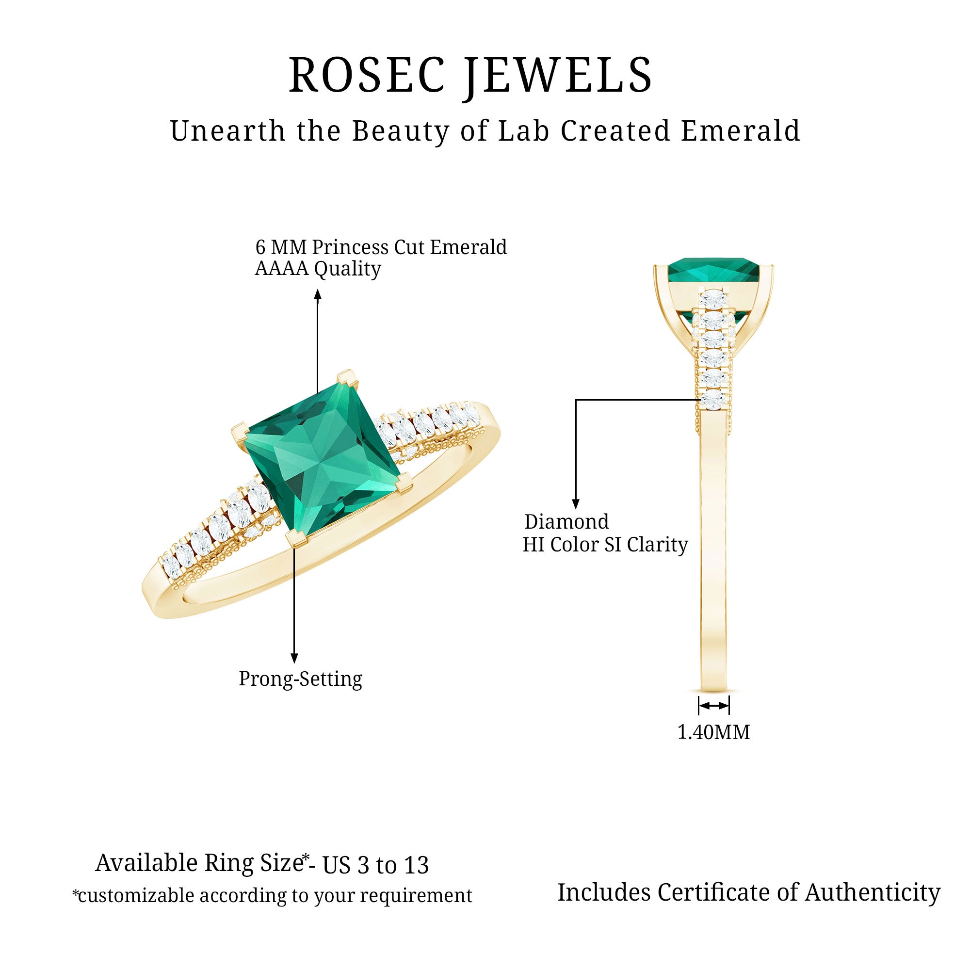 Celebrate your special moments by presenting our Emerald Solitaire Ring to your beloved. Embellished with princess-cut lab-created emerald meticulously set in prong setting while the shank sparkles with the radiant brilliance of round-shaped diamonds. The captivating hue of green emerald and diamond is sure to make her day memorable. Crafted to attention, the emerald ring is the ultimate choice for her, an elegant symbol of your commitment.