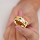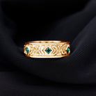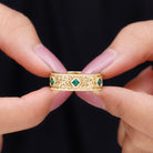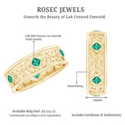 This Vintage Band Ring is a celebration of detail, artistry, and radiant beauty. Designed with a creative, eye-catching pattern, it features princess cut lab created emerald stones set in a bezel setting that circles the finger in a eternity style. The intricate engraving design gives the ring a classy charm along with vintage-inspired feel with a touch of romantic flair. Each AAAA quality lab created emerald is precisely bezel set to maximize brilliance, capturing light with every movement. The continuous pattern symbolizes everlasting love, making this Vintage Band Ring an ideal choice for weddings, anniversaries, or milestone celebrations. This is not just a typical wide band, it is for someone who appreciates thoughtful design and wants something a little more unique. Whether worn on its own or paired with other jewelry pieces, this Wedding Anniversary Band adds charm and sophistication to any look. Its wide band ensures a comfortable fit while making a bold style statement. The craftsmanship is evident in every detail, from the smooth finish to the secure setting of each stone. This Vintage Emerald Band Ring blends vintage allure with modern shine, perfect for those who love jewelry that tells a story and feels special every time its worn.