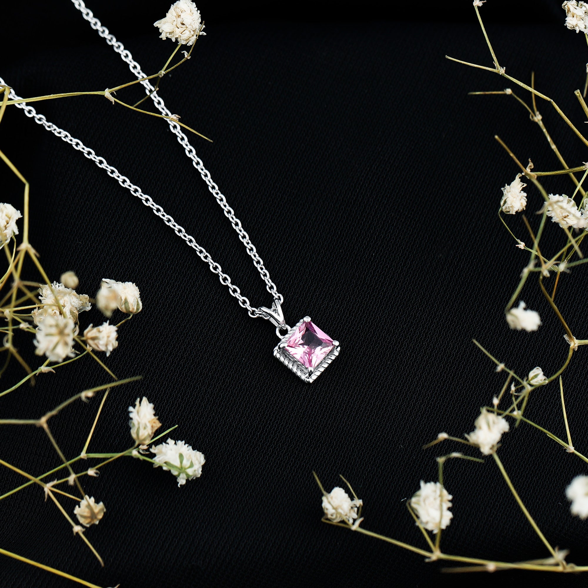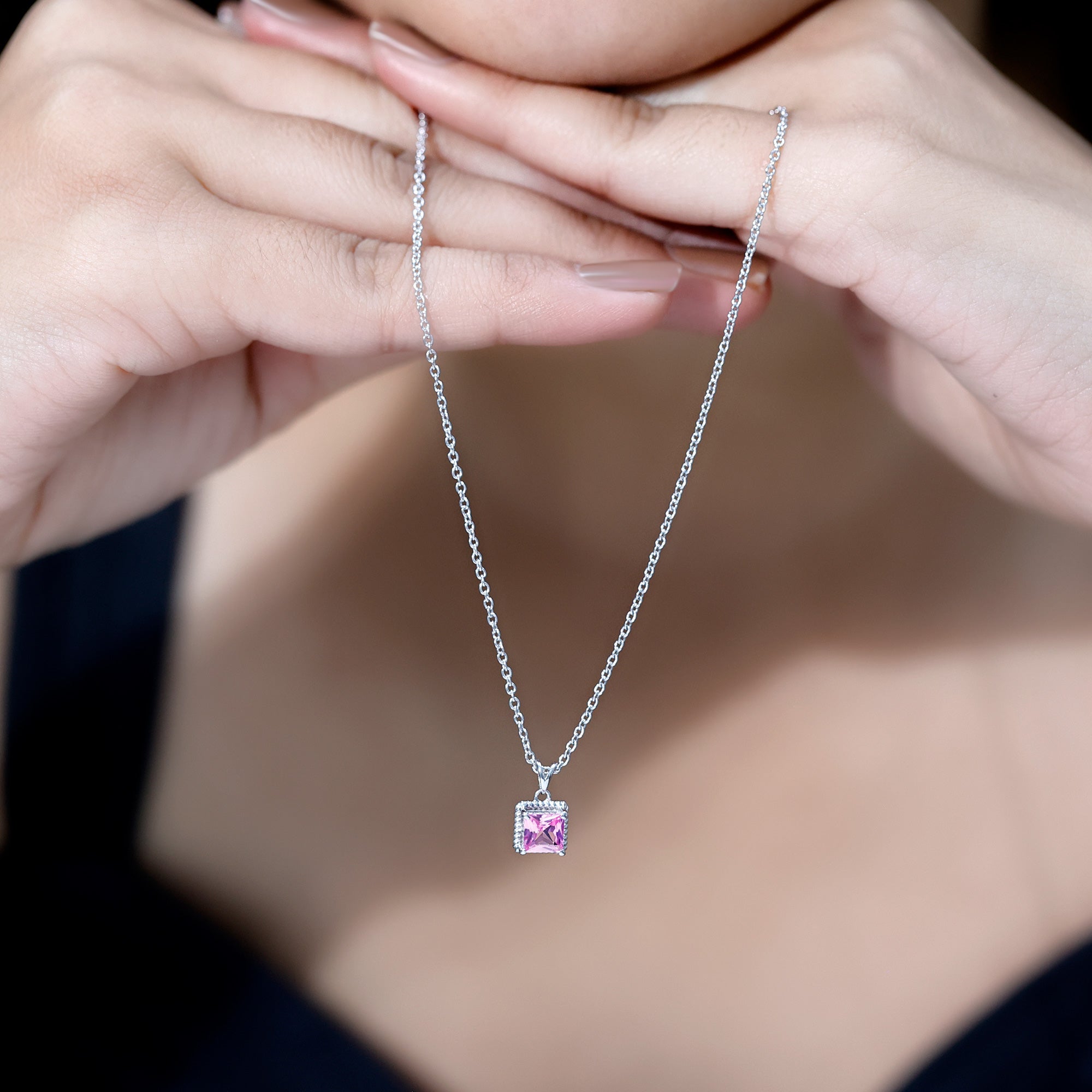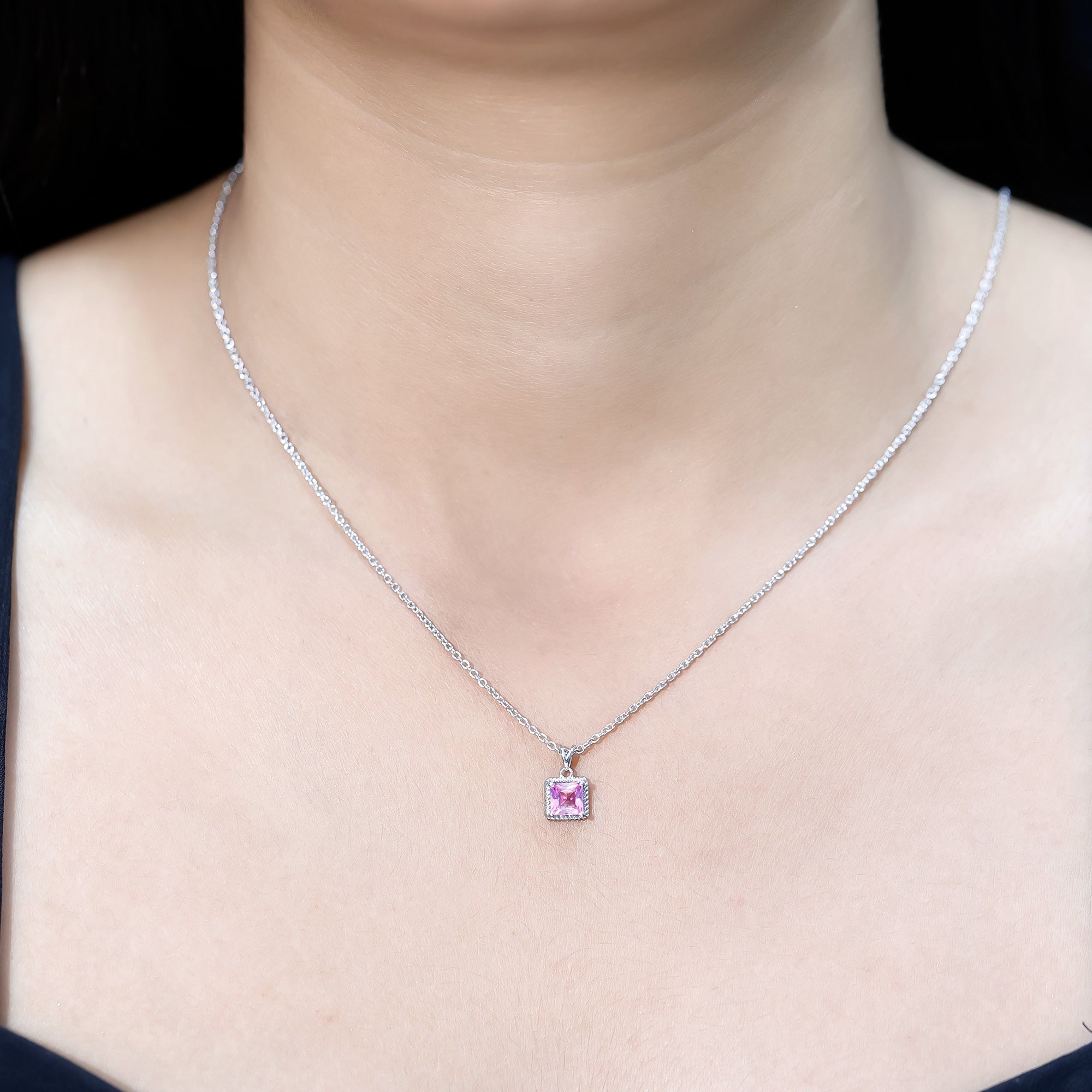 Your girl’s favorite pink stone in a stunning necklace - the kind of gift she will truly love to receive. This Lab Created Pink Sapphire Necklace is designed to capture hearts with its soft sparkle and elegant charm. Crafted in white gold plated sterling silver, the Solitaire Pendant features a stunning 5 MM princess cut lab grown pink sapphire, carefully set in secure prong setting. A delicate twisted rope design frames the gemstone, adding subtle texture and interest without taking away from the stone’s natural beauty. The Princess Cut Necklace hangs from a sleek chain, allowing it to move gracefully and catch the light with every step. Its simple yet striking design makes it perfect for both everyday wear and special occasions, an ideal choice for adding a hint of elegance to work outfits or casual looks. What makes this piece even more special is its AAAA quality lab created pink sapphire, offering the same beauty and durability as a natural stone, but in a way that is ethical and environmentally friendly. It is a thoughtful option for those who want to make a mindful jewelry choice without compromising on style or quality. Elegant, feminine, and meaningful, this Solitaire Sapphire Necklace is a timeless piece that speaks to the heart.