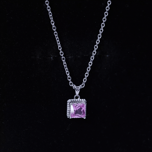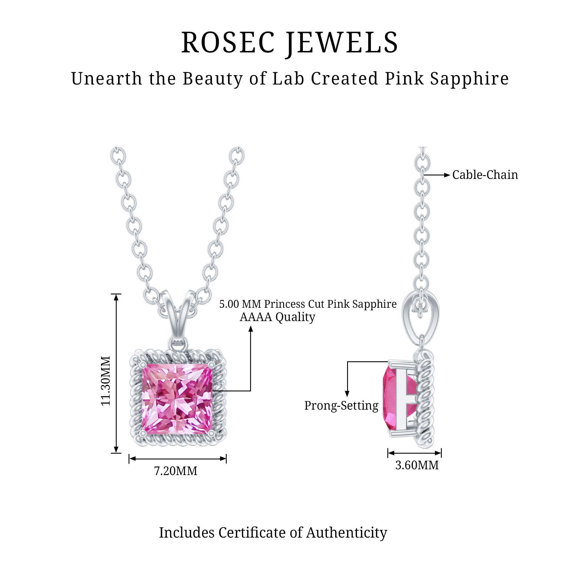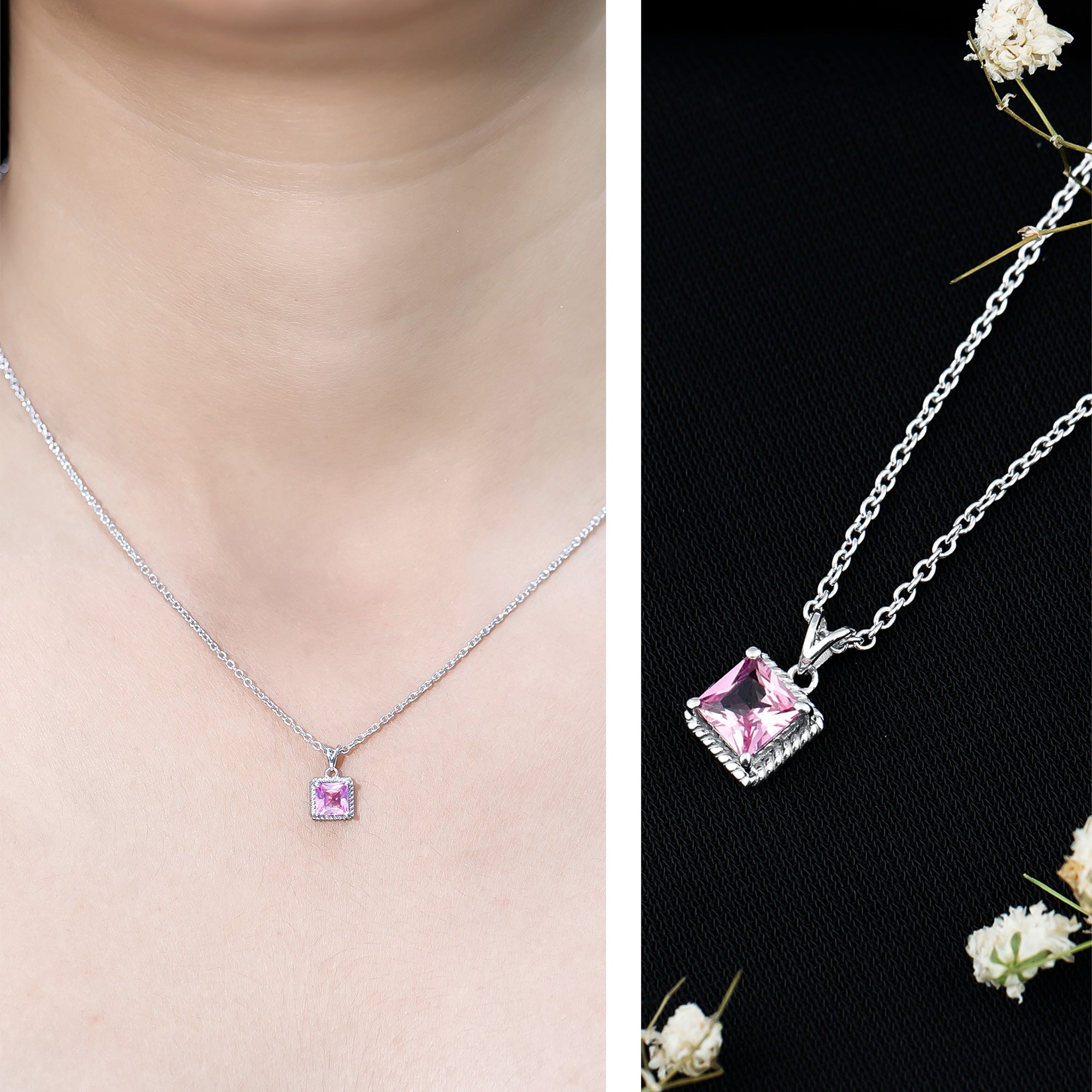 Your girl’s favorite pink stone in a stunning necklace - the kind of gift she will truly love to receive. This Lab Created Pink Sapphire Necklace is designed to capture hearts with its soft sparkle and elegant charm. Crafted in white gold plated sterling silver, the Solitaire Pendant features a stunning 5 MM princess cut lab grown pink sapphire, carefully set in secure prong setting. A delicate twisted rope design frames the gemstone, adding subtle texture and interest without taking away from the stone’s natural beauty. The Princess Cut Necklace hangs from a sleek chain, allowing it to move gracefully and catch the light with every step. Its simple yet striking design makes it perfect for both everyday wear and special occasions, an ideal choice for adding a hint of elegance to work outfits or casual looks. What makes this piece even more special is its AAAA quality lab created pink sapphire, offering the same beauty and durability as a natural stone, but in a way that is ethical and environmentally friendly. It is a thoughtful option for those who want to make a mindful jewelry choice without compromising on style or quality. Elegant, feminine, and meaningful, this Solitaire Sapphire Necklace is a timeless piece that speaks to the heart.