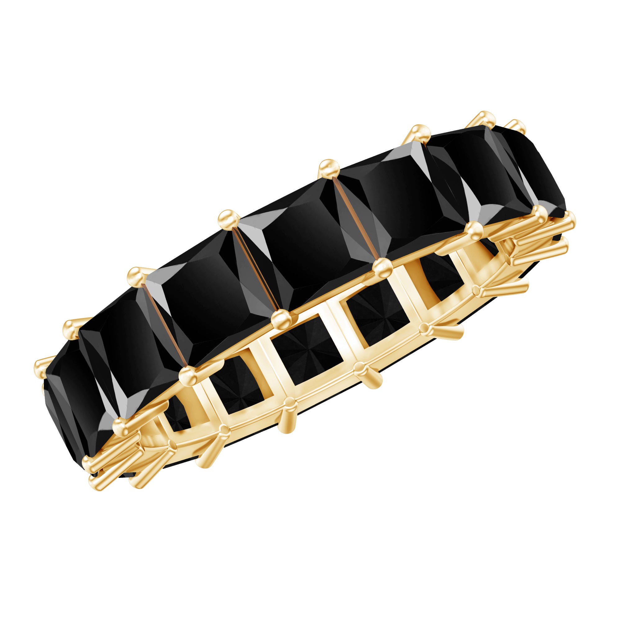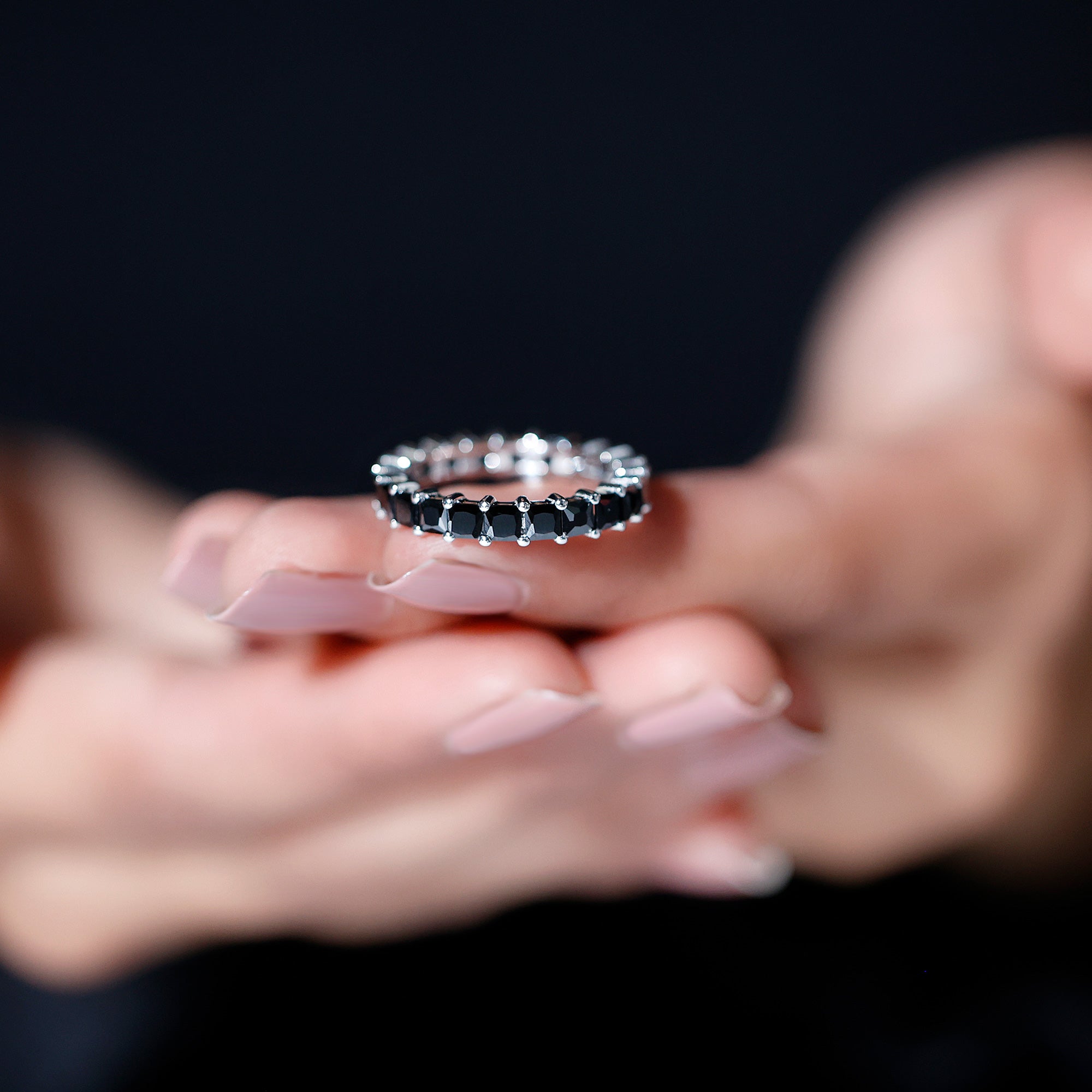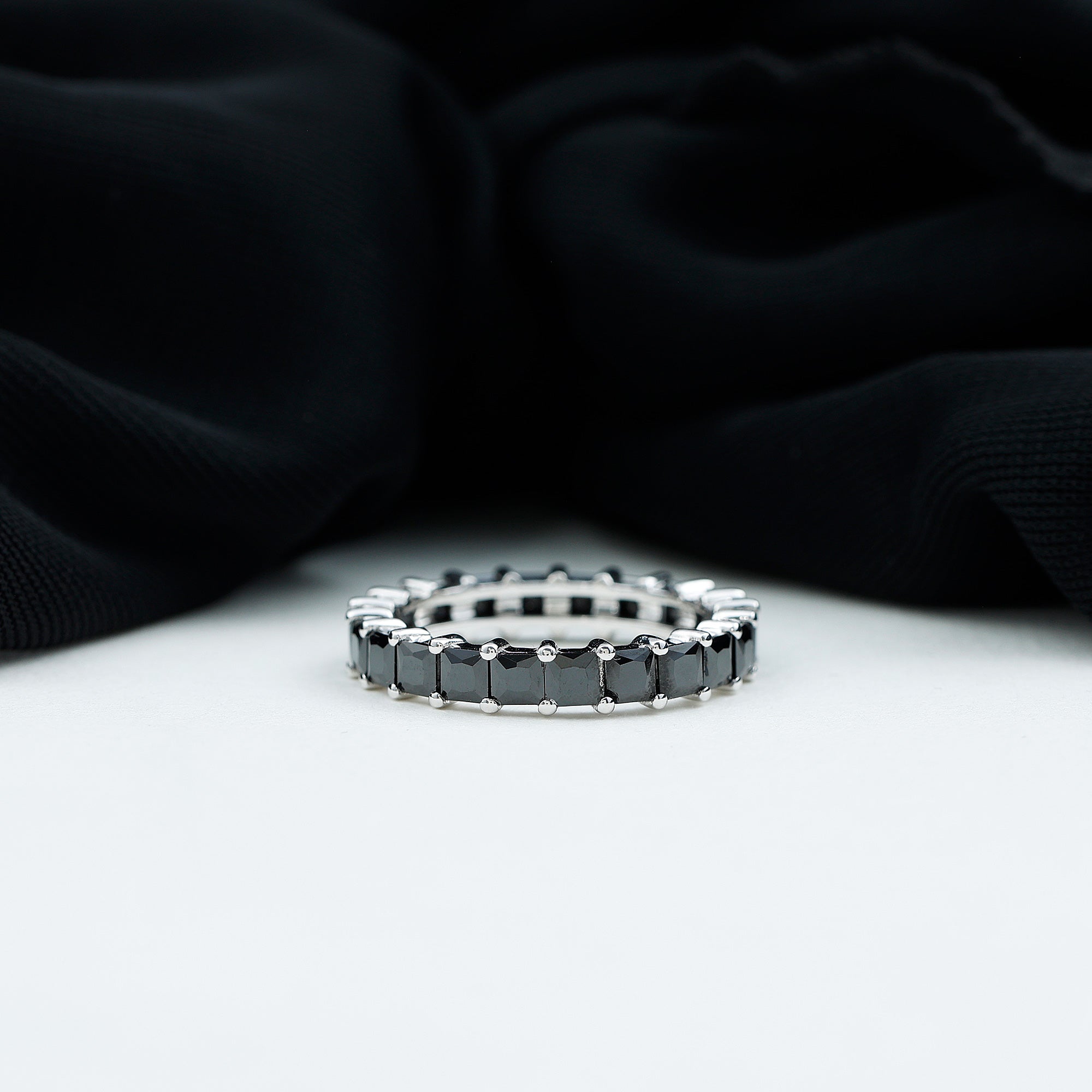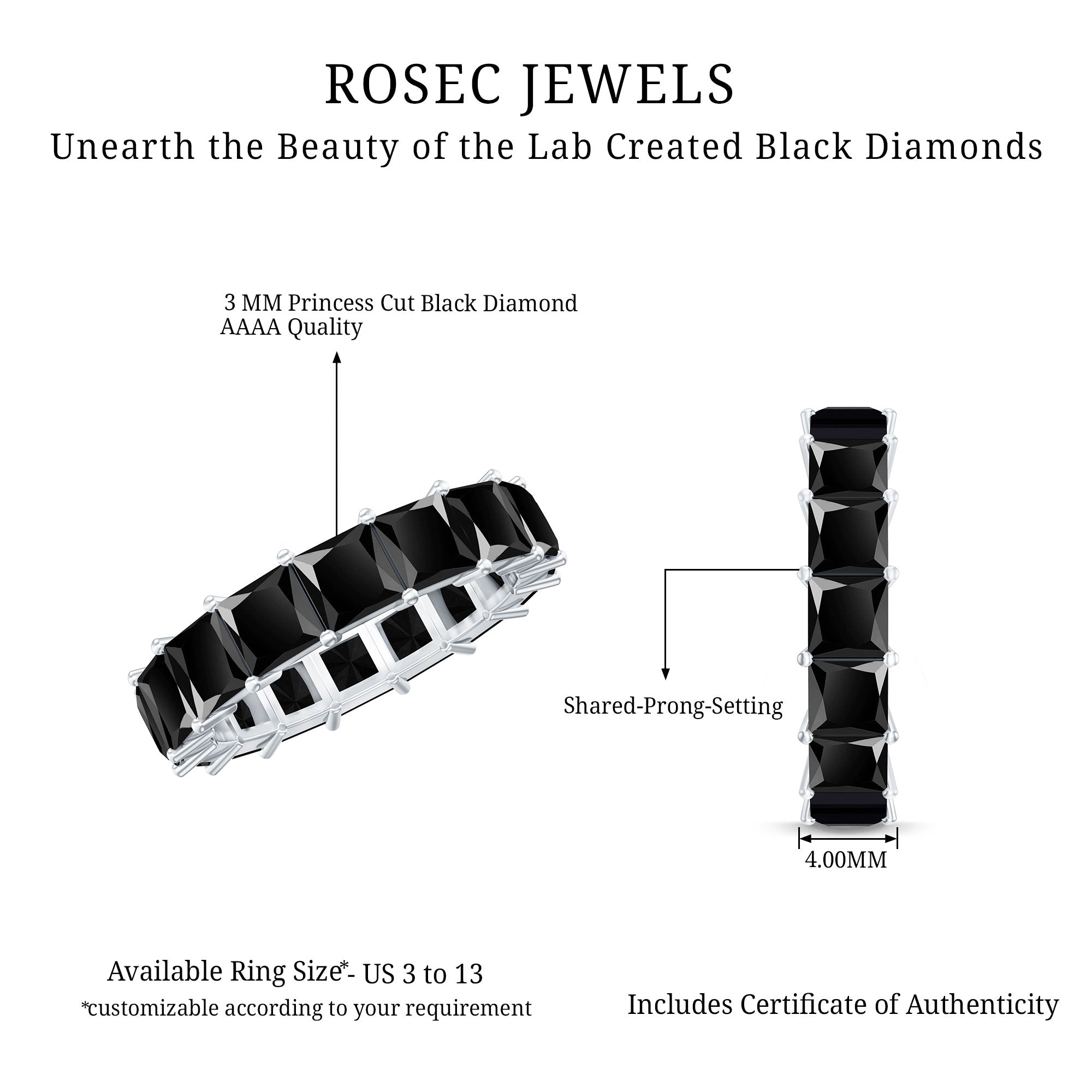 Celebrate the extraordinary person in your life with this remarkable Eternity Band Ring. This ring features a distinctive Princess Cut Created Black Diamond, expertly placed in a Shared Prong Setting on a Full Eternity Ring.