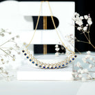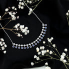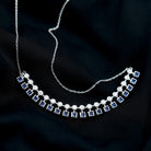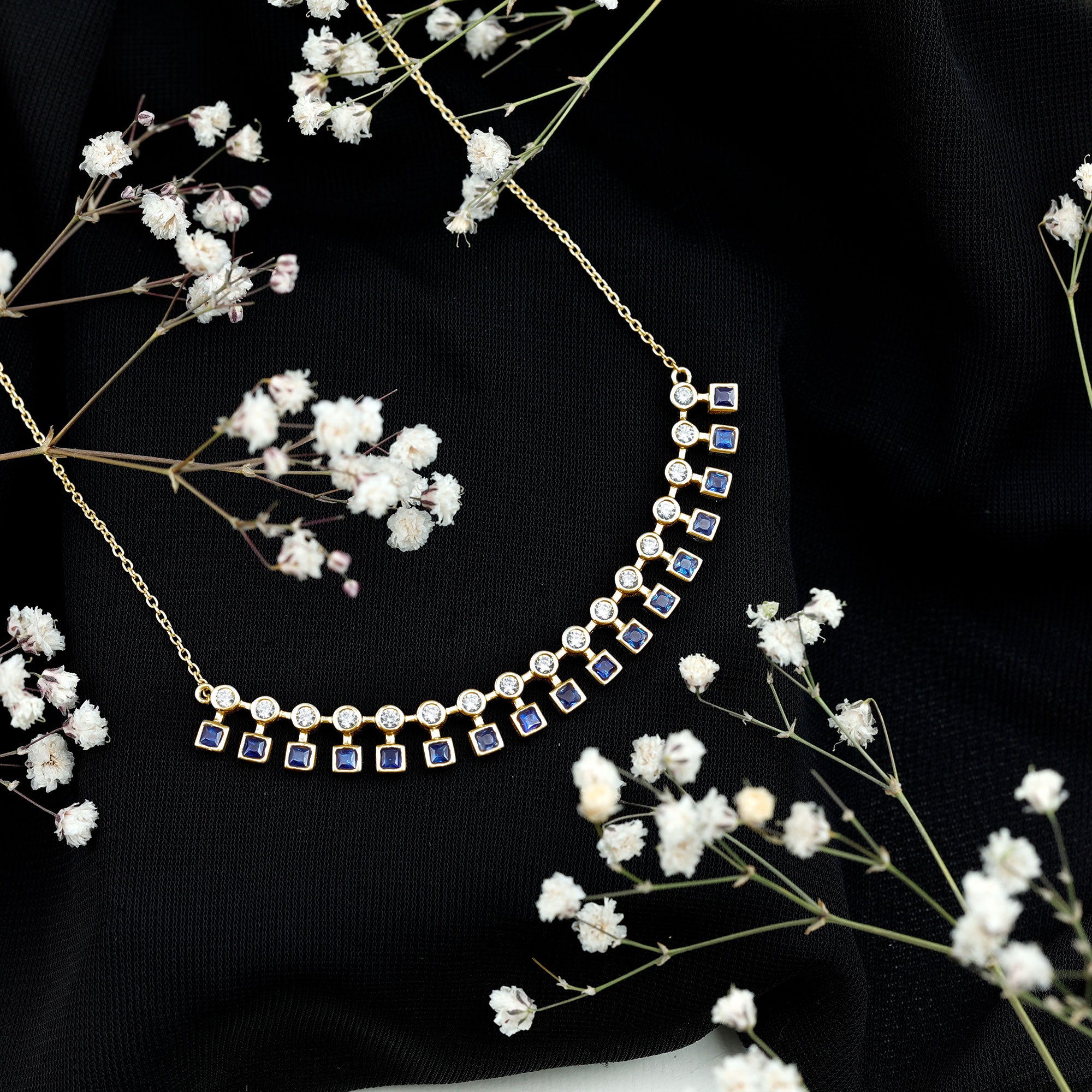 A touch of quiet beauty can turn an ordinary moment into something special, and this Curved Bar Necklace is designed to do exactly that. The Statement Necklace features two rows of sparkling stones, each one chosen to add its own kind of charm. One row holds lab created blue sapphires cut in a princess shape, giving off a rich and vibrant color. The other row displays round moissanite stones that bring a bright sparkle, creating a lovely balance between color and shine. Each stone is placed in bezel setting, adding a modern touch while keeping the stones safely secured. Crafted with care, the Sapphire and Moissanite Necklace uses AAAA quality lab created blue sapphires and D-VS1 quality moissanite stones that mimic the clarity and shine of fine gems. The curved bar connects smoothly to a simple cable chain, giving the Cocktail Necklace a light and delicate feel that makes it perfect for everyday wear or special occasions. This design works well with many different outfits, from casual tops to dressy evening wear. It can be worn alone for a minimal style or layered with other necklaces for a more personalized look.