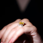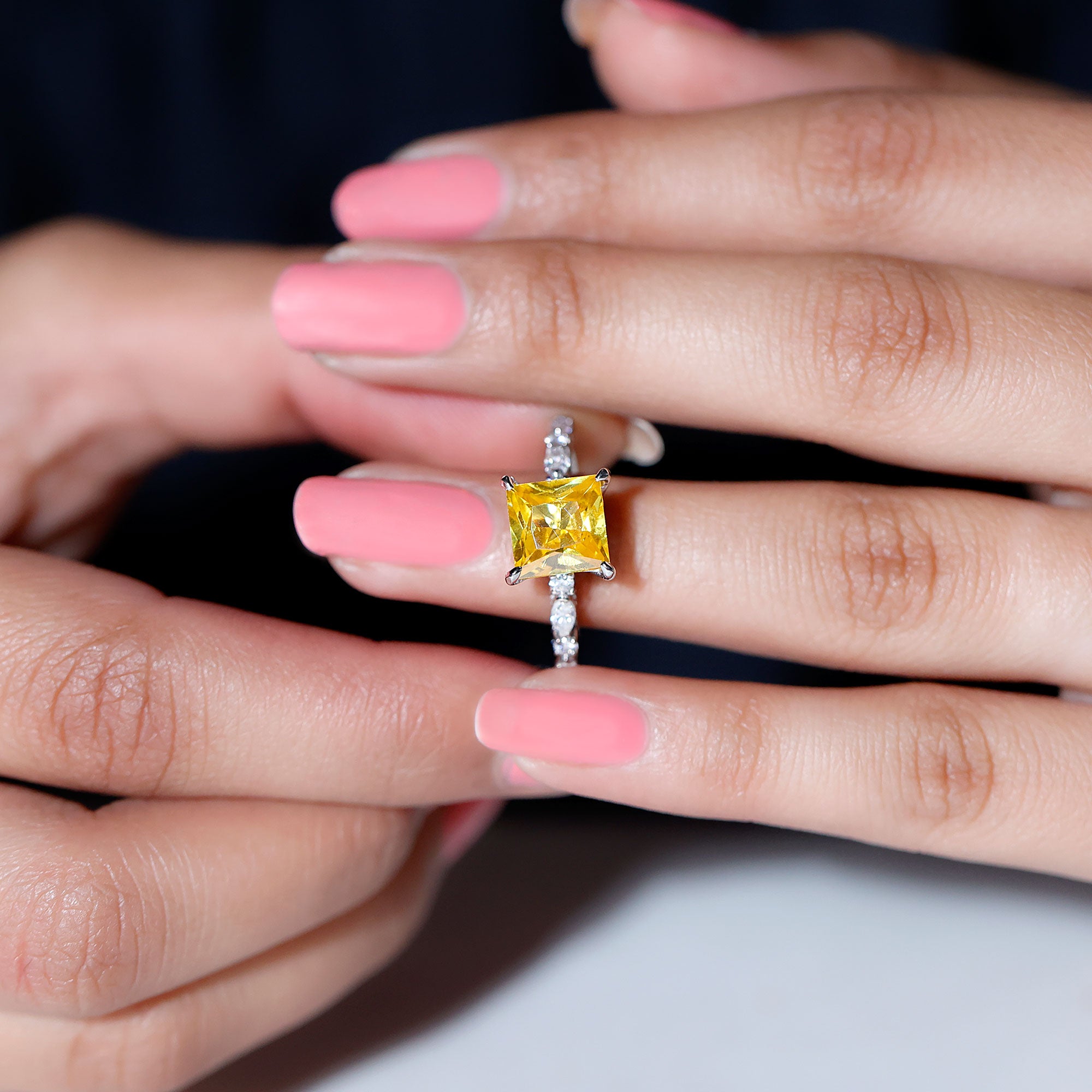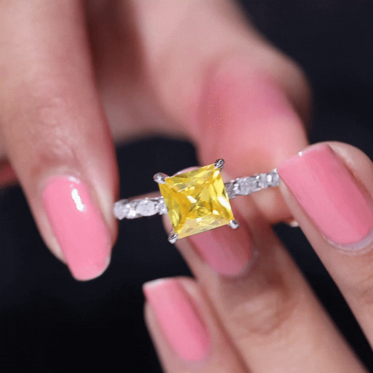 Shell love this Solitaire Engagement Ring for a lifetime! Featuring Princess Cut Lab Grown Yellow Sapphire as the center stone secured by Claw Setting, additional Round Moissanite sparkles across the bridge for extra allure. While two rows of Marquise and Round Moissanite line each side of the band. The Solitaire Ring comes in our ready-to-gift Signature Jewelry Box, it is a perfect choice for Birthday Gift, Anniversary Gift, and Valentines Day Gift for your special one.