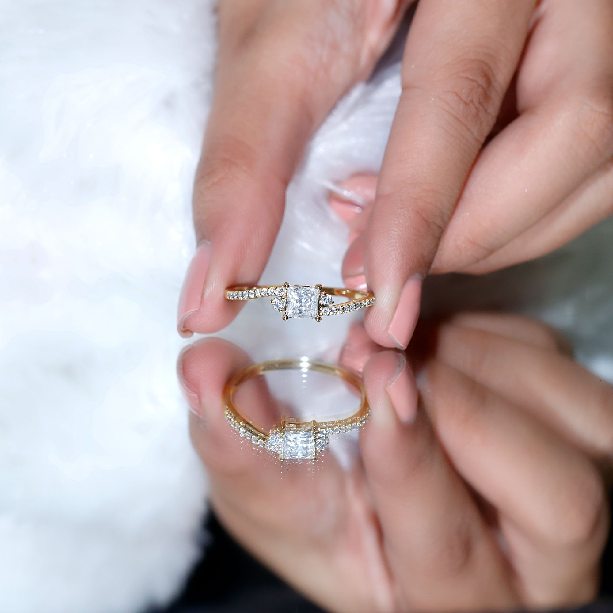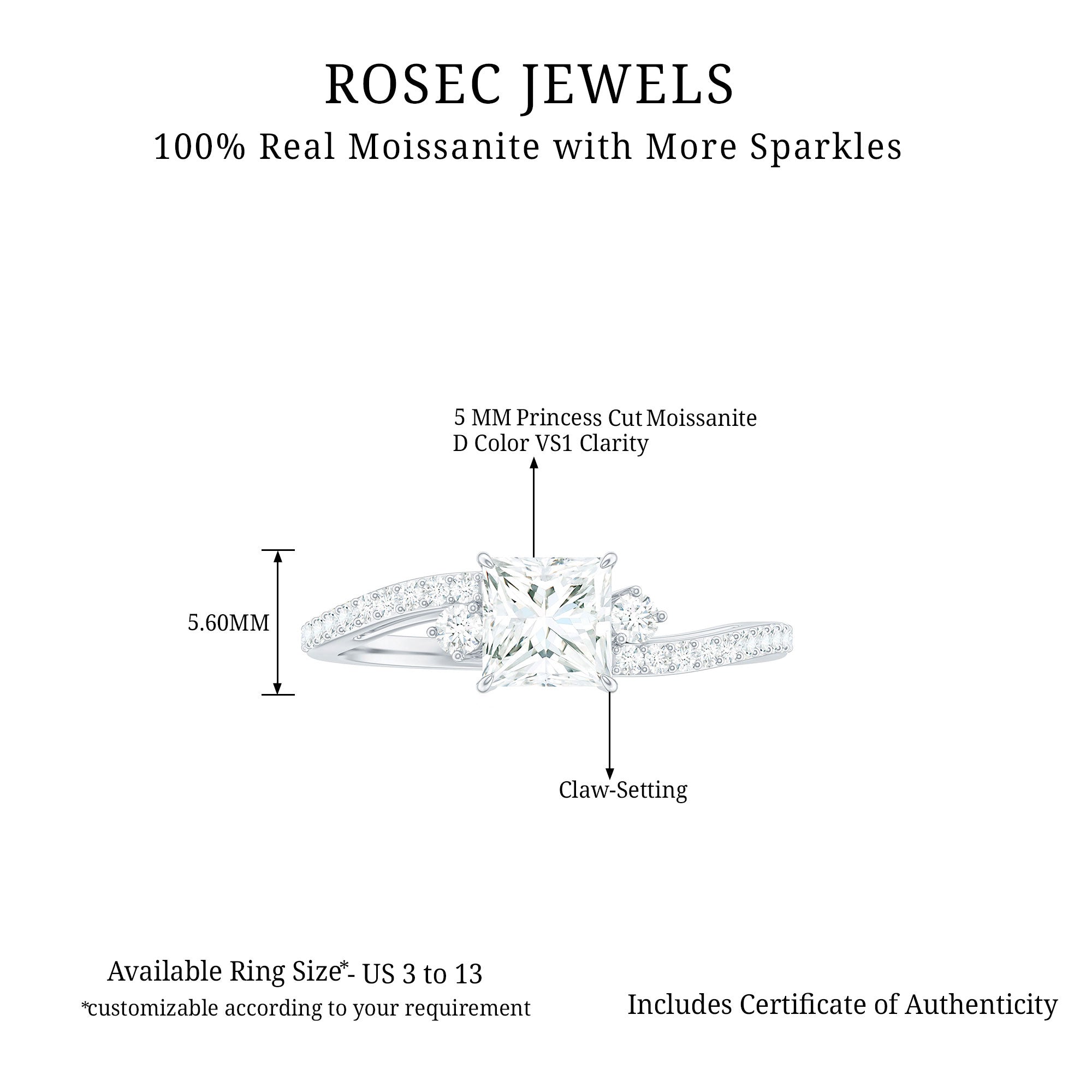 Want to make the moment special with a hint of shine, here is a Moissanite Engagement Ring, perfect for your special day. The heart of the ring is decorated with 5 MM Princess Cut Moissanite delicately placed in Prong Setting. The center stone is adorned with round petite moissanite shank. This Bypass Ring is the perfect choice to celebrate your everlasting love story. The Square Engagement Ring reflects the shine of D-VS1 quality Moissanites making it the perfect dazzler for the occasion. Present this princess cut engagement ring to her and witness her priceless expression.