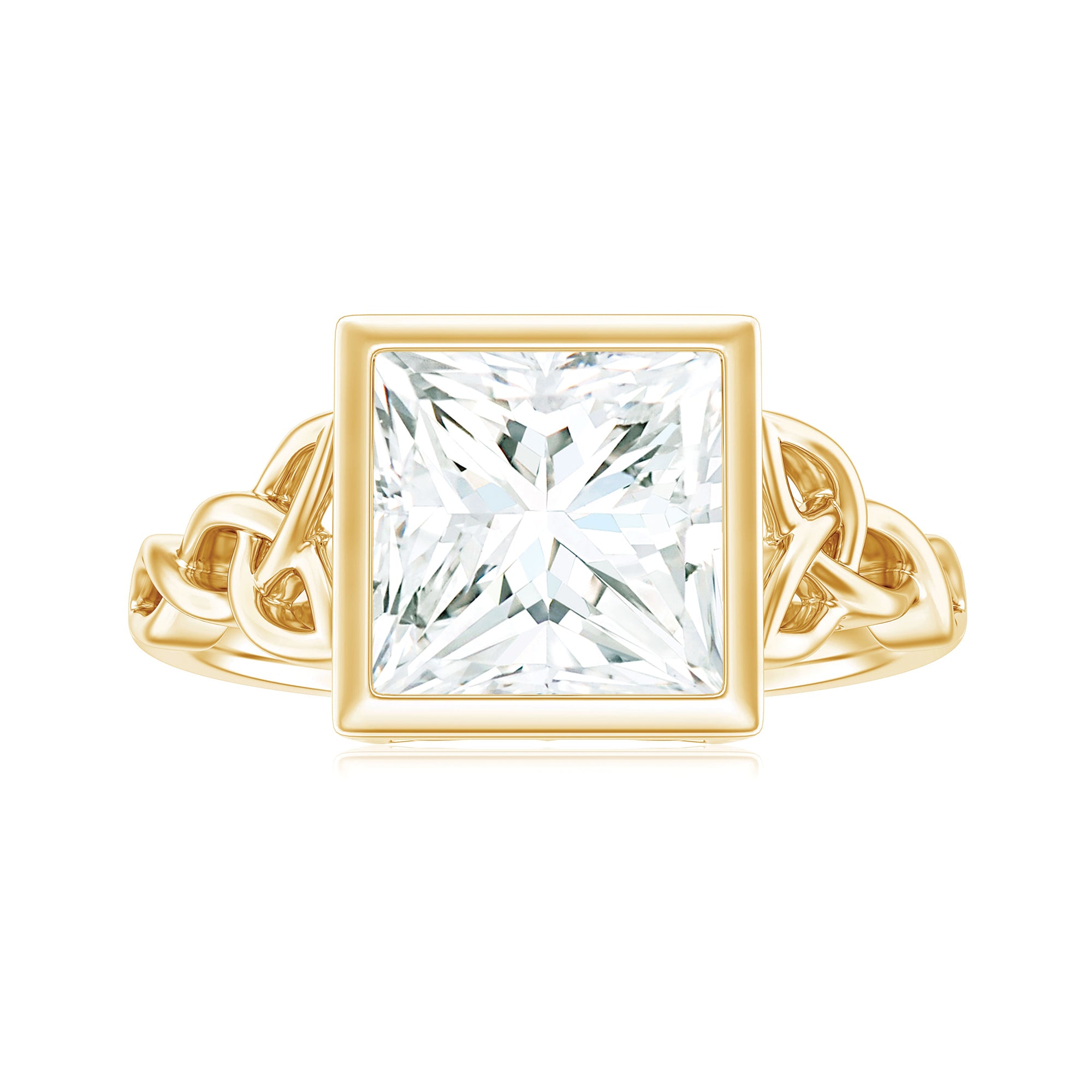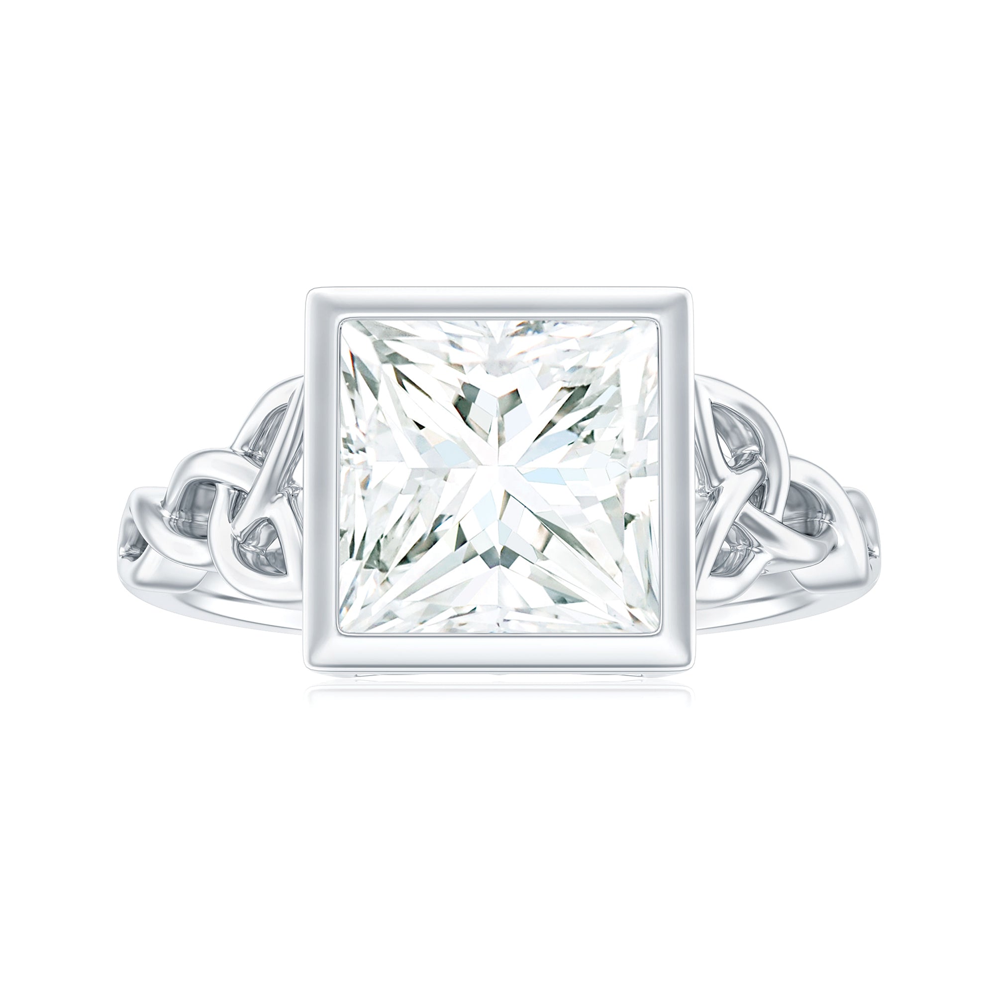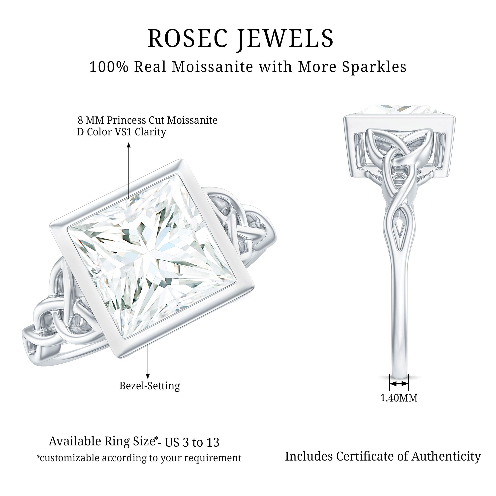 As a classic homage to love, this Princess Cut Moissanite Engagement Ring features a celtic twist that represents an unbreakable connection. Radiating elegance and charm, this beautifully designed Celtic Knot Engagement Ring highlights a stunning centerpiece for a lifelong promise. This Square Engagement Ring showcases an 8 MM princess cut Moissanite set in bezel setting, with celtic knots gracefully reflected on both sides of the main stone. With its intricate and delicate design, this Moissanite Solitaire Engagement Ring symbolizes eternal love. The D Color VS1 Clarity Moissanite sparkles with brilliance, embodying subtle elegance. As a symbol of everlasting affection, this 3 Carat Moissanite Ring features a solitaire style with a trinity band that signifies the unity of two people, while holding profound meaning in a relationship. Rosec Jewels also provides a free ring sizer to ensure the perfect fit, available upon request before the final product is shipped. Simple yet striking, this Princess Cut Engagement Ring offers a wide range of metal choices to choose from.
