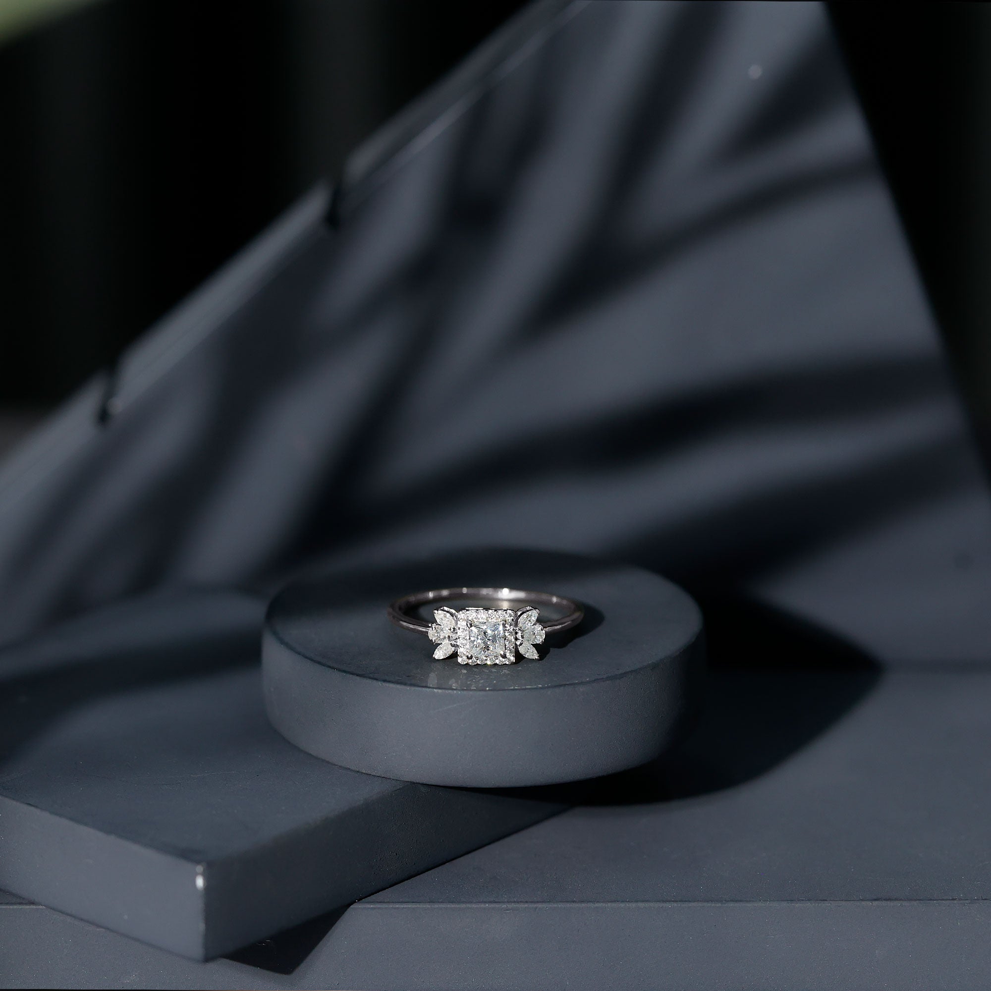 Charming and elegant, this Moissanite Engagement Ring embodies timeless beauty with a contemporary, radiant flair. At its heart, a stunning 4 MM princess cut moissanite shines brightly, encircled by round stones in a halo, all securely held in prong setting. With D-VS1 quality, this dazzling gem reflects light exquisitely, representing pure and enduring love. To enhance its brilliance, a trio of petite marquise and pear-shaped moissanite stones are gracefully positioned on either side of the center stone, forming a harmonious and striking design. These delicate accents amplify the ring’s overall sparkle while maintaining its understated elegance. Each stone in this Moissanite Halo Ring is meticulously arranged, offering an ethical and budget-friendly choice compared to traditional diamonds without compromising on brilliance. The sleek band is crafted for daily comfort, while the trio adds a gentle, refined touch. Beautifully packaged in a chic jewelry box, this Princess Cut Engagement Ring transcends mere adornment, it symbolizes love, commitment, and cherished memories. Whether you are beginning your journey together or commemorating your connection, this sophisticated Square Engagement Ring is designed to shine every day, just like your love.