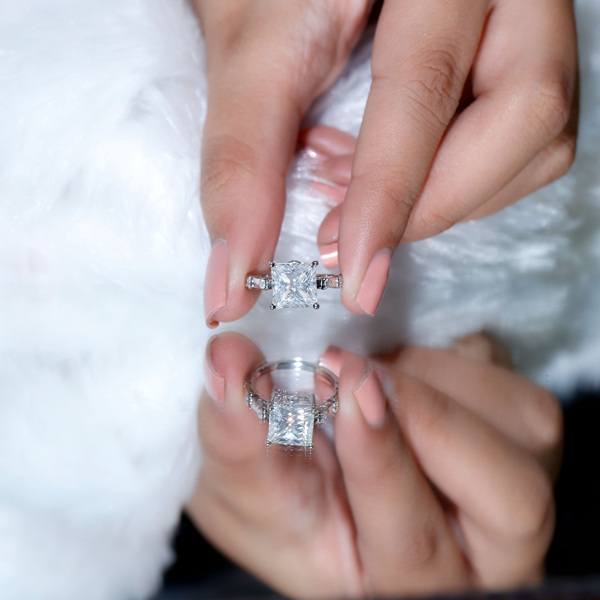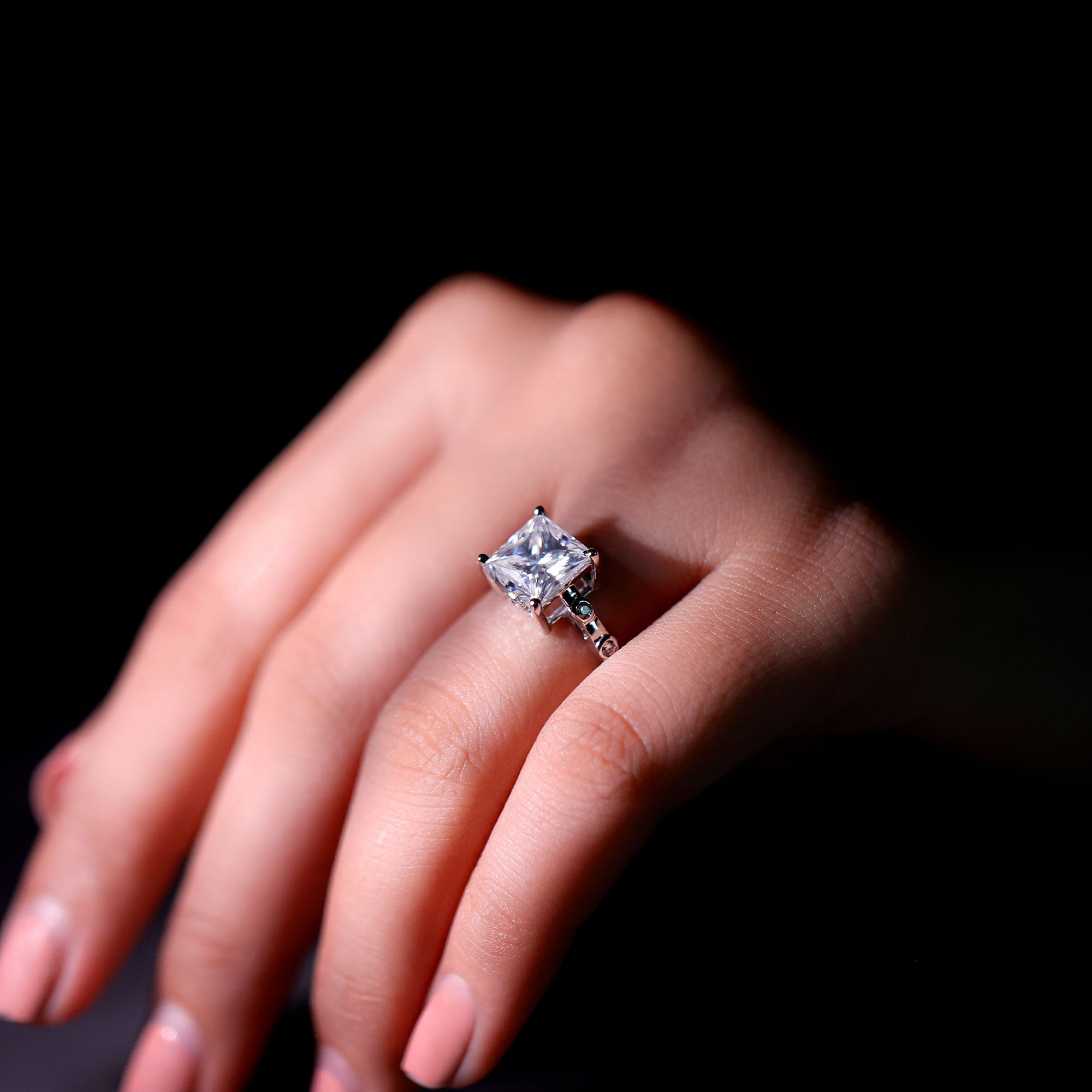 Step into elegance with this Moissanite Engagement Ring, designed to catch the eye with its sleek and stylish look. At its core is a stunning 8 MM Princess Cut Moissanite set in Prong Setting, known for its beautiful sparkle. To enhance its shine, the 3 Carat Moissanite Ring features Bezel Set Side Stones arranged in a spaced accent style along with a Hidden Moissanite for that charming twist, adding a modern touch to the classic design. The gentle balance between the bold center stone and the subtle shine of the side stones creates a look that is both timeless and unique. This Princess Cut Engagement Ring is a perfect symbol of love and commitment, crafted to shine as brightly as the relationship it represents. Elegantly presented in a jewelry box, this Square Engagement Ring is ready to be gifted or treasured as a keepsake. With its contemporary elements and lasting brilliance, this Solitaire Moissanite Ring for Women provides a fresh take on classic romance, ideal for someone who values tradition with a dash of individuality.