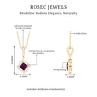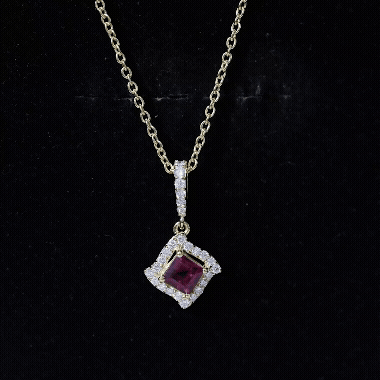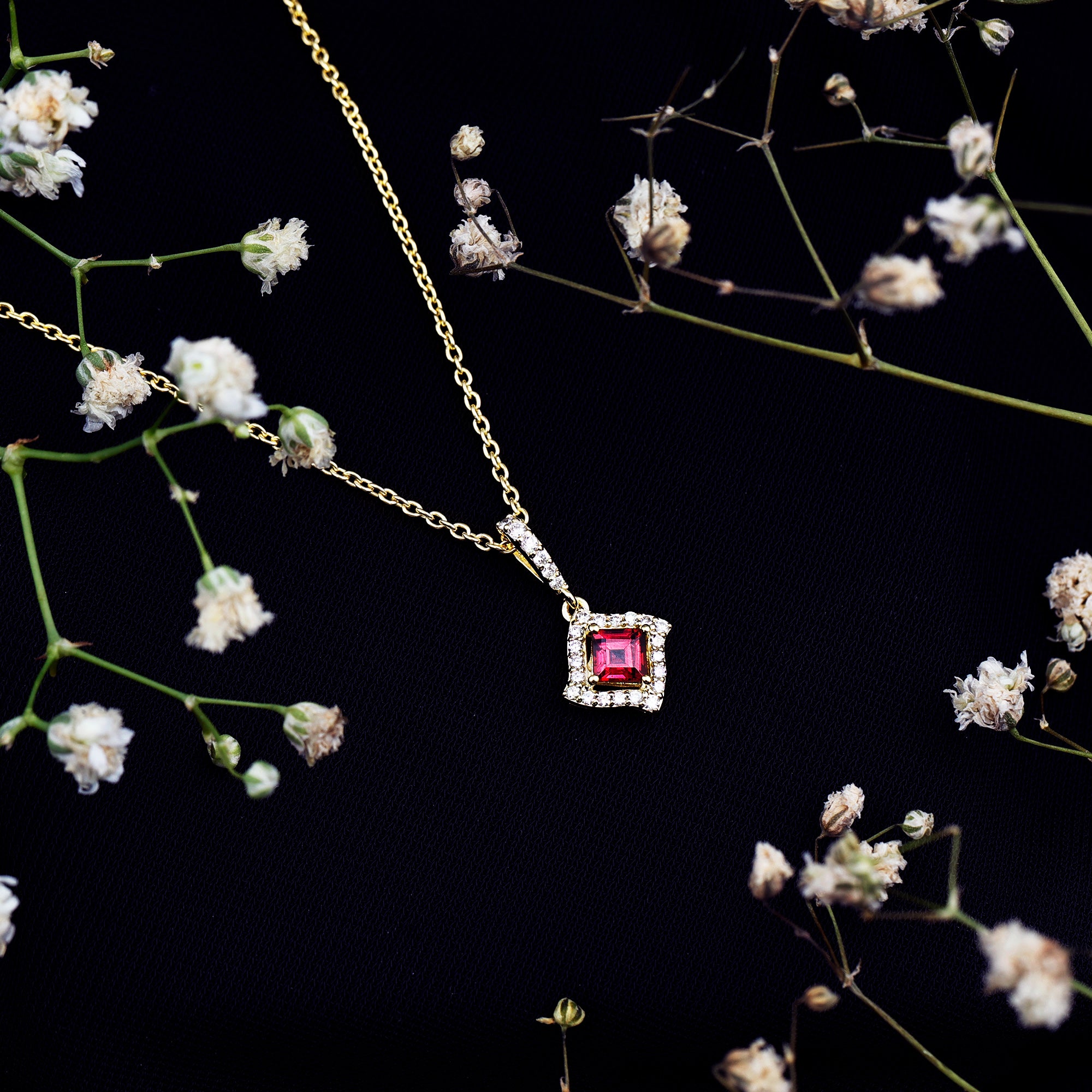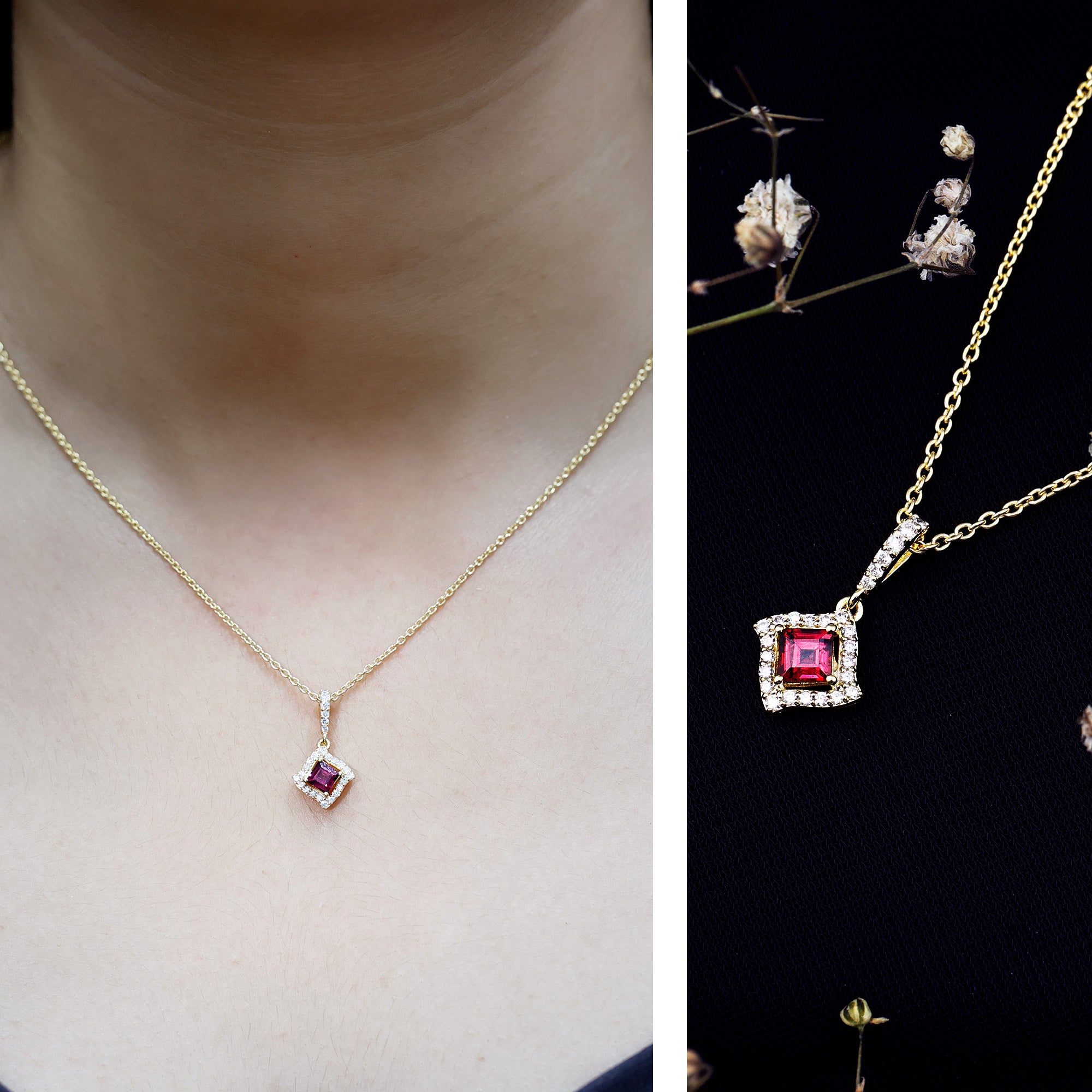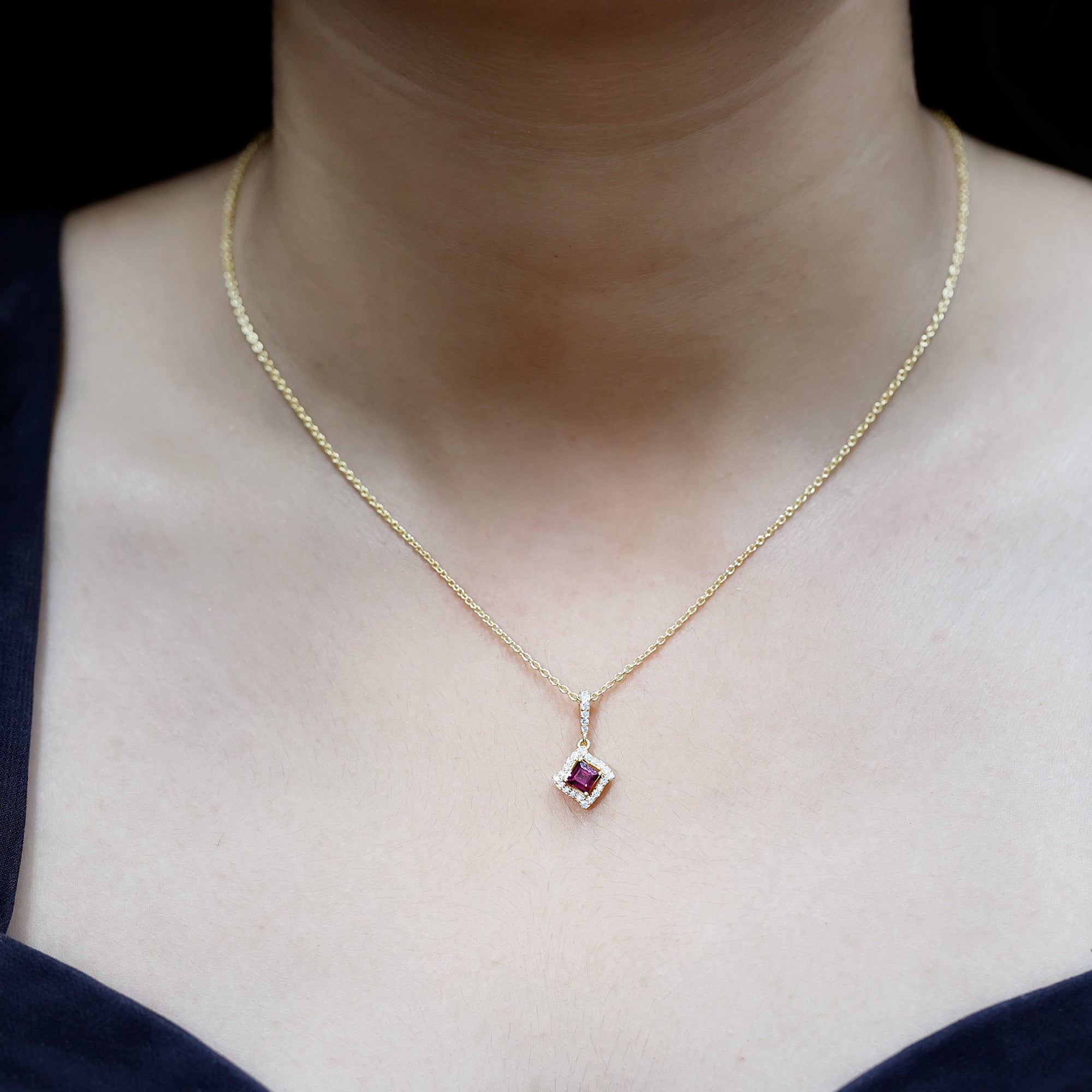 Add a pop of rich color and timeless charm to your jewelry collection with this elegant Rhodolite Pendant Necklace. Handcrafted in yellow gold plated silver, this piece is designed to turn heads with its beautiful balance of bold color and subtle sparkle. At the center of the pendant is a 4 MM princess cut natural Rhodolite gemstone, securely held in prong setting. The gemstone is framed by a delicate round lab grown white diamond halo, adding just the right amount of shimmer without overpowering the design. To make the Princess Cut Necklace even more special, the bail is also adorned with sparkling round lab grown diamonds in graduated pattern, creating a seamless flow from the pendant to the chain. The lab created diamonds pair beautifully with the natural glow of the Rhodolite, giving the Halo Pendant Necklace a modern yet timeless feel. It is a thoughtful gift, or a perfect self-love piece, that comes beautifully packaged with a gemstone certificate.