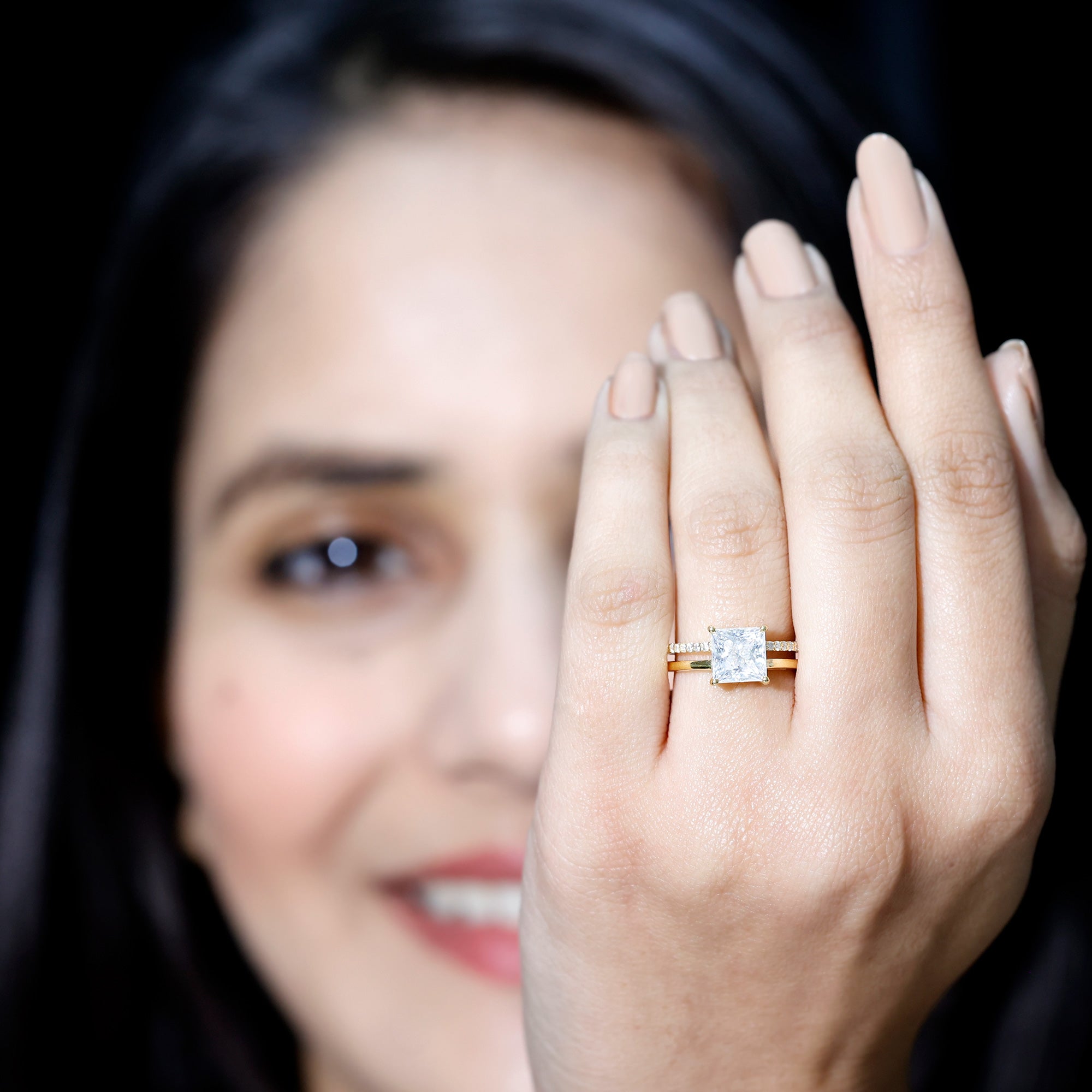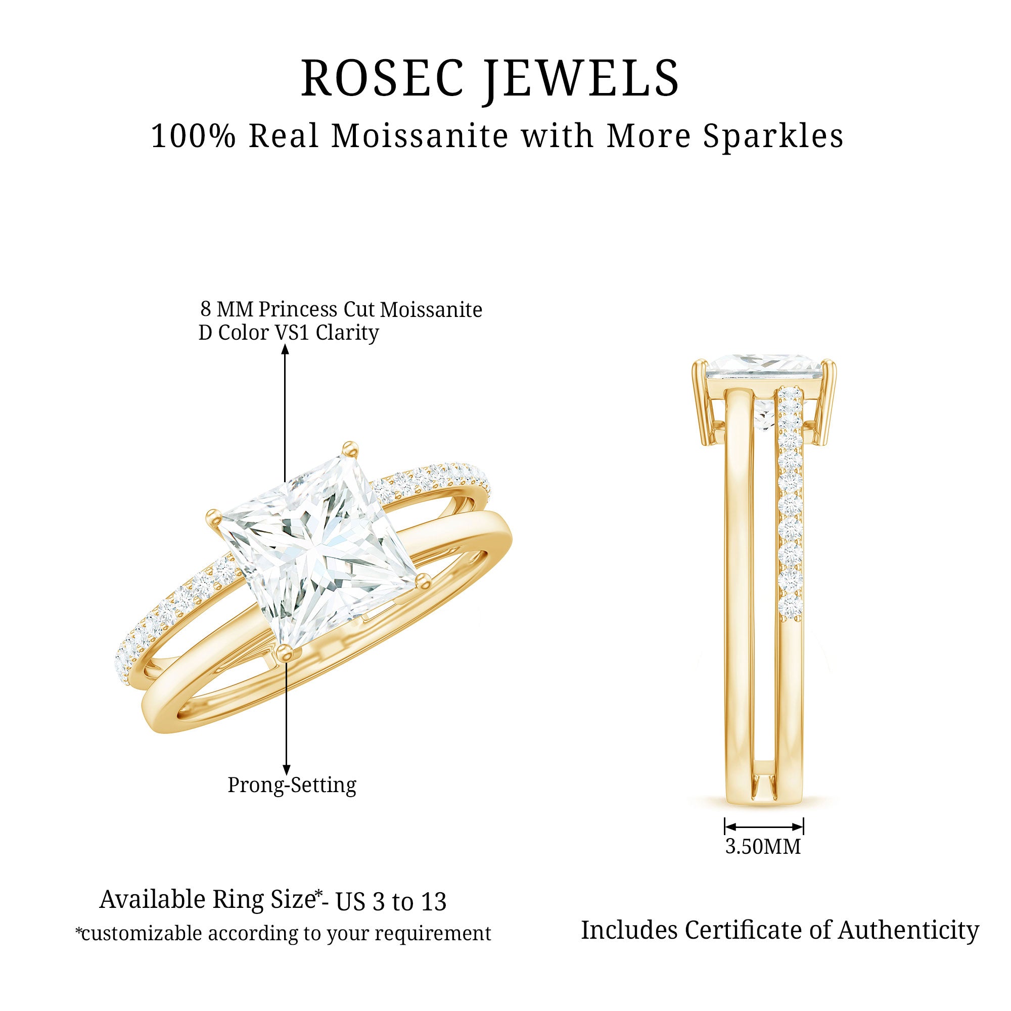 Indulge in luxurious elegance with this stunning Moissanite Double Band Ring, a jewelry piece that sets you apart from the crowd. The Engagement Ring features a dazzling Princess Cut Moissanite in a Prong Setting, accompanied by Round Moissanite stones.