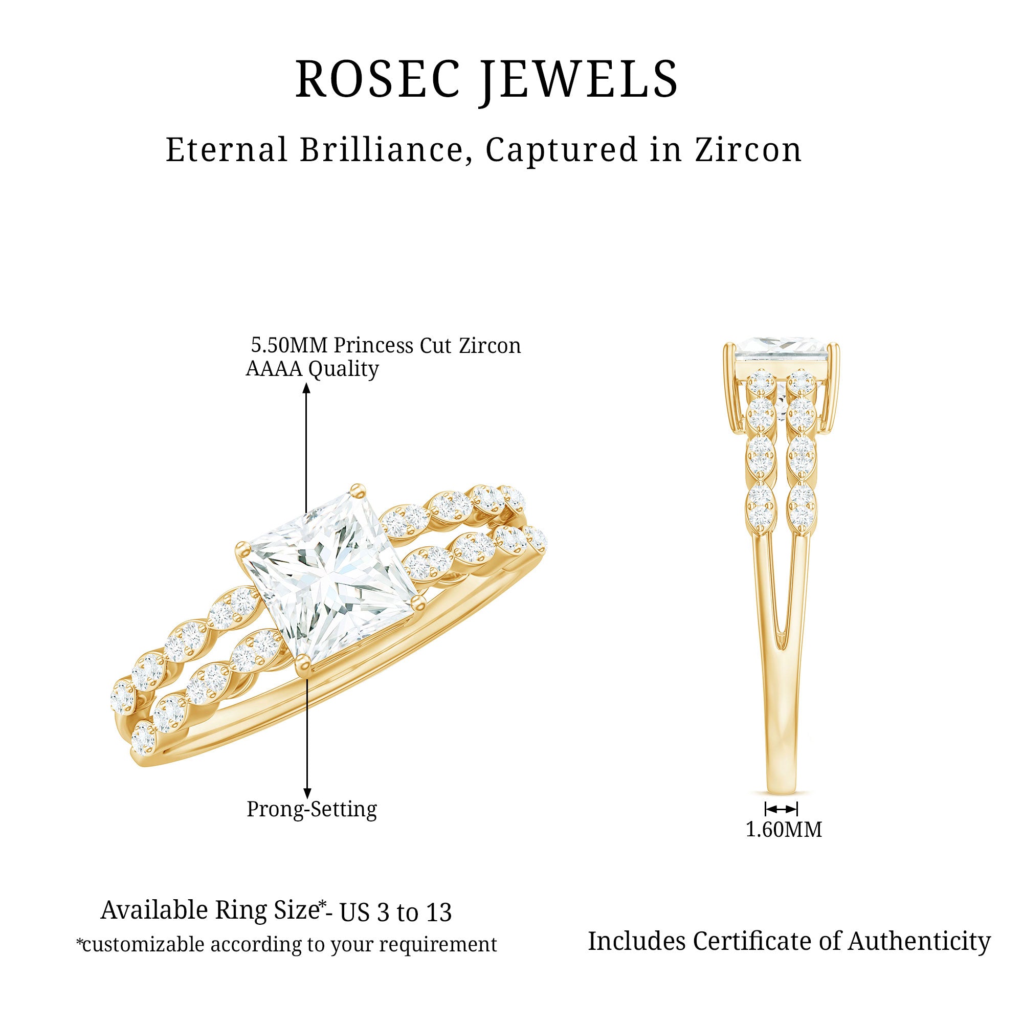 The elegant Princess Cut Cubic Zirconia is held in 4 Prong Setting. It is gorgeously flanked by Zircon Double Band, creating a minimal charm of this ring. This Simulated Diamond Engagement Ring is crafted in Gold for luxurious touch. The sparkle of this Cubic Zirconia Engagement Ring is what captivates people.