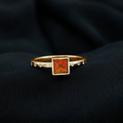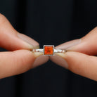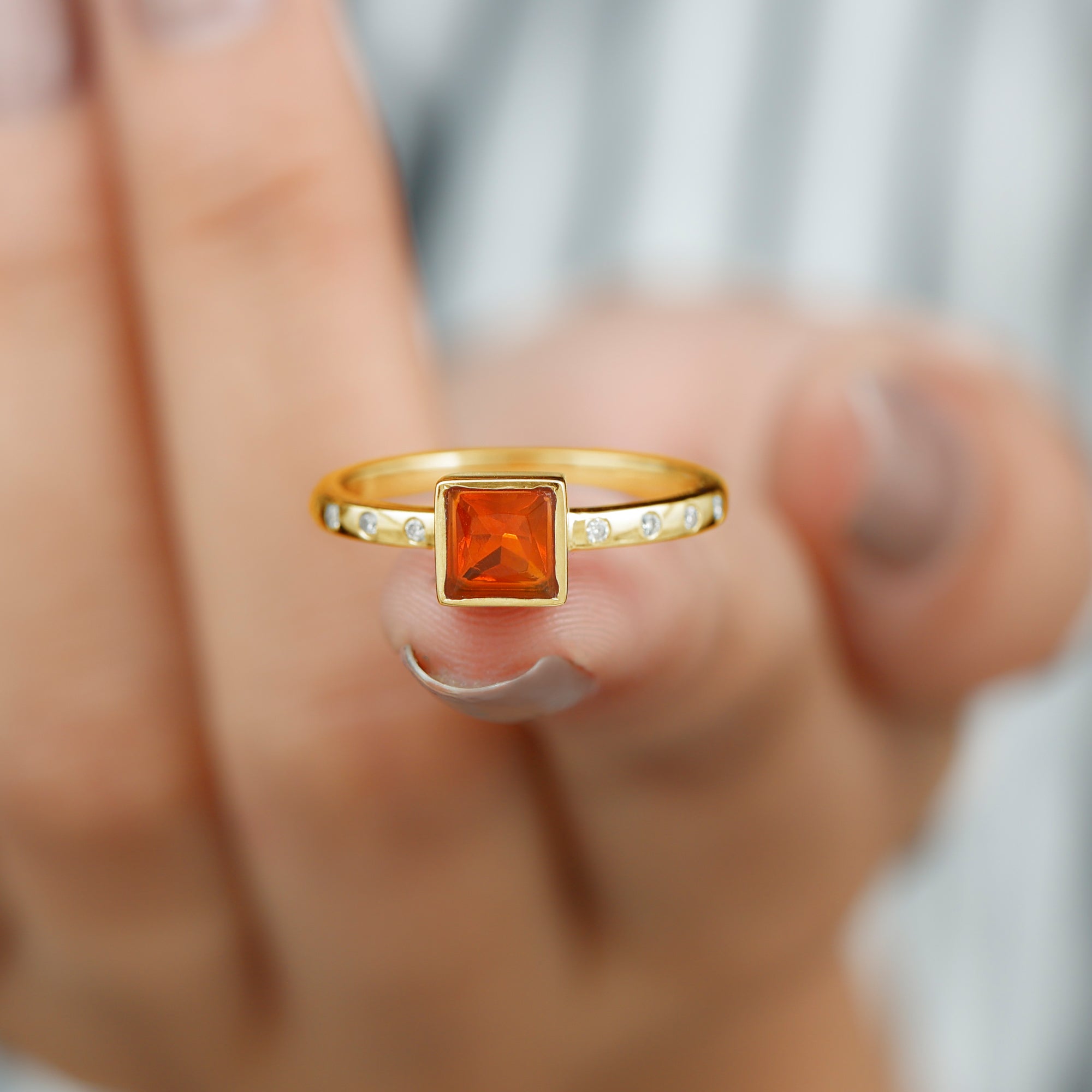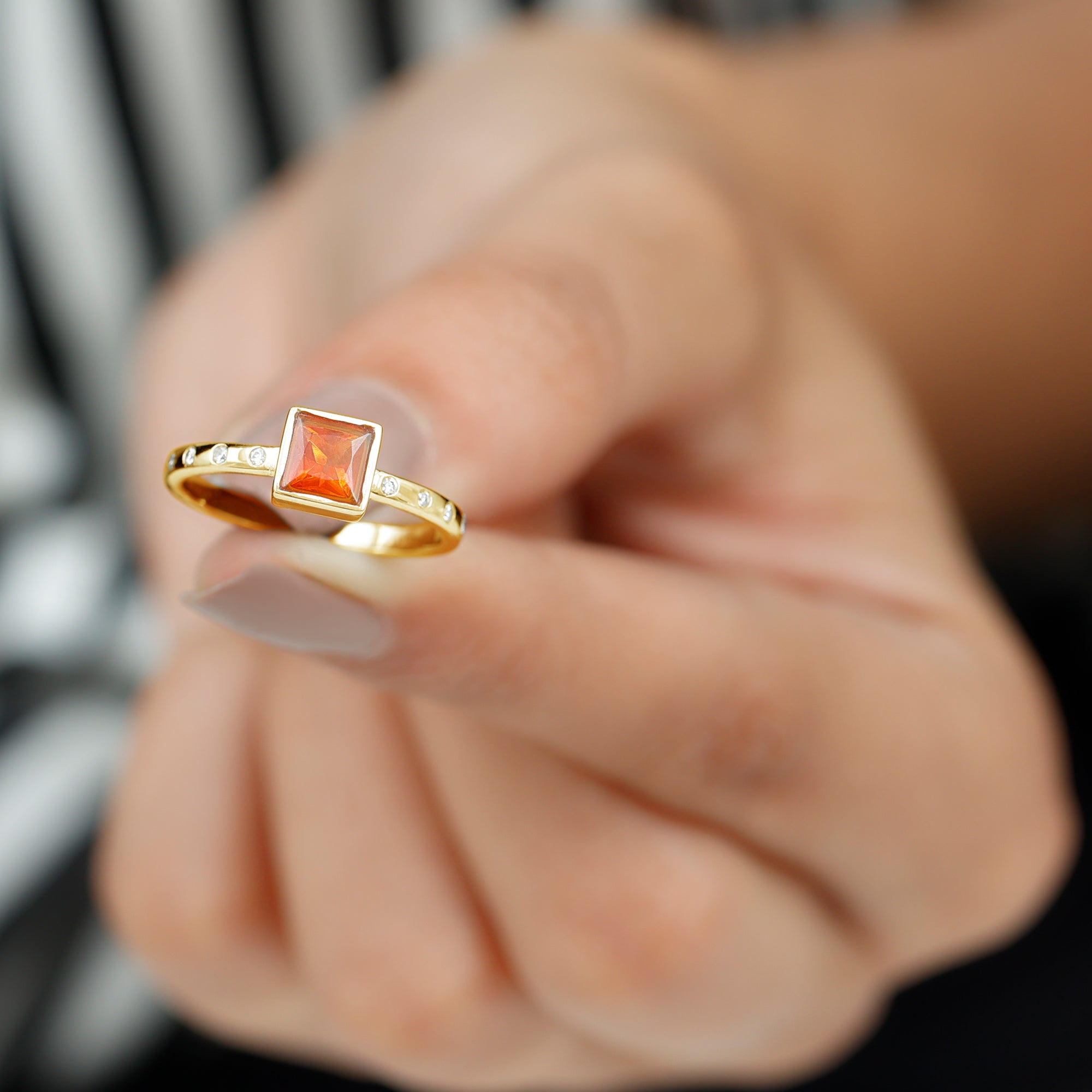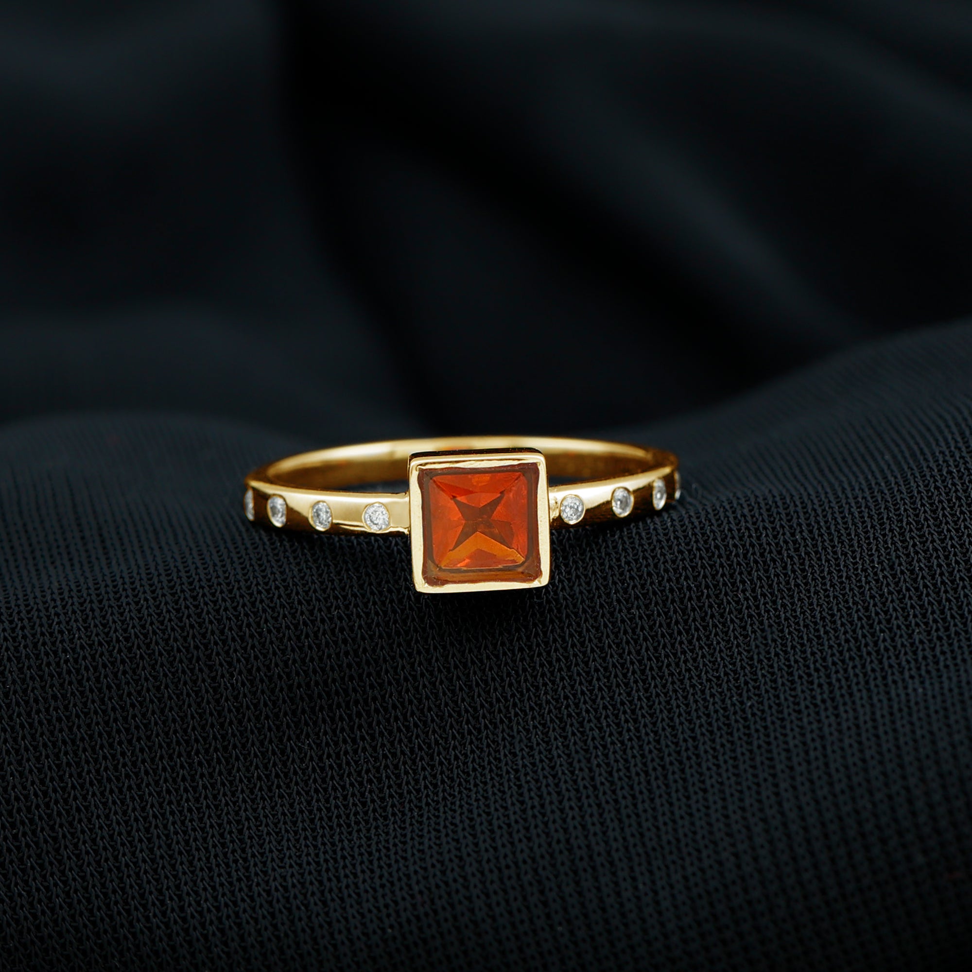 Explore our stunning Solitaire Promise Ring is adorned with Princess Cut Fire Opal as a solitaire in a bezel setting with Round Shape Diamond in a Sleek Accent.