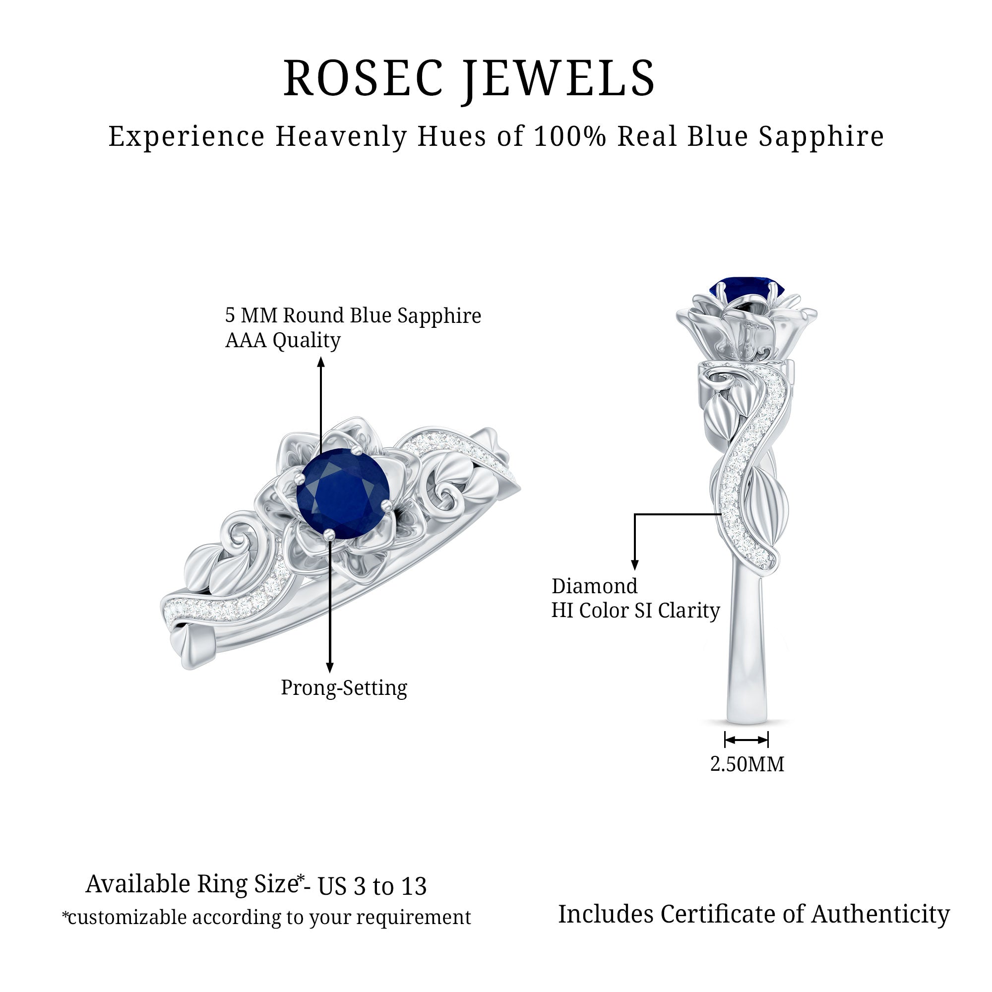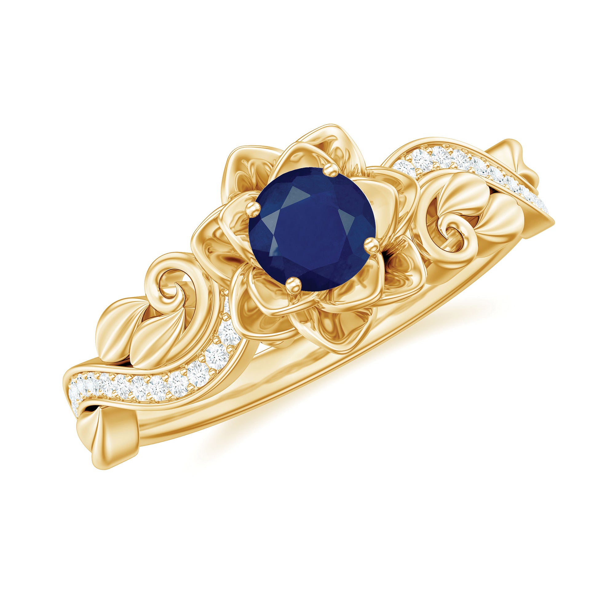 Add a touch of sophistication to your style with this stunning Floral Blue Sapphire Ring. The ring features a Round Shape Blue Sapphire in a prong setting surrounded by sparkling Diamond accents, all set on a solid gold band for a luxurious appeal.