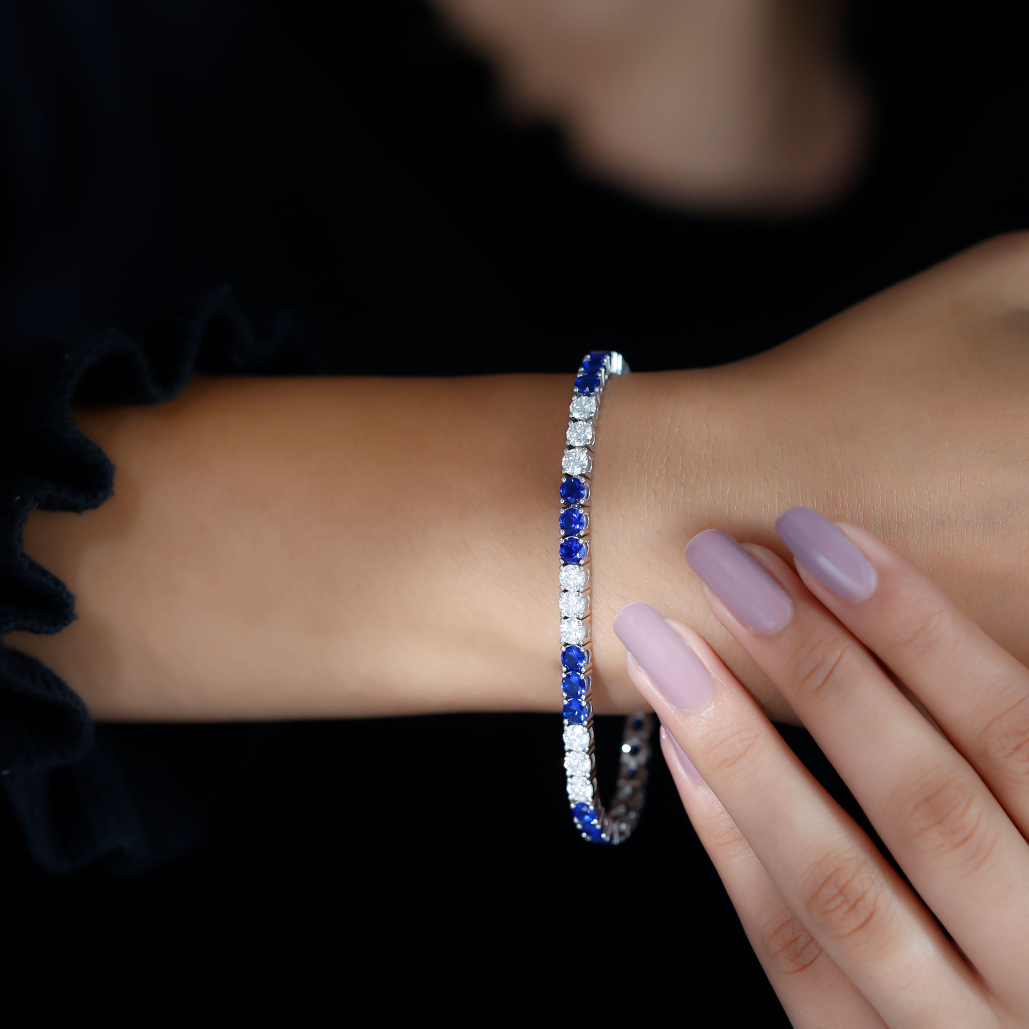 This Lab Grown Diamond Bracelet is a luxurious and charming accessory to adorn your wrist. Indicating love and commitment, this Bracelet is beautifully adorned with Round Shape Lab Grown Diamond and Lab Blue Sapphire in Prong Setting, giving a subtle appearance. Celebrate the enduring beauty with the stunning Bracelet as a symbol of timeless glamor, and is also a classic addition to the jewelry collection. Encapsulating affection and elegance, this Lab Diamond Sapphire Bracelet is a tangible symbol of continuous and everlasting affection. Offering brilliance and a vogue appearance, this Lab Diamond Stackable Bracelet displays a parallel look. Designed to elevate outfits, this bracelet is perfect for everyday styling, giving an eye-catching sparkle. The EF-VS Quality Lab Grown Diamond and AAAA Quality Lab Blue Sapphire have an understated and classic accessory, which is an exceptionally versatile piece of jewelry for your collection. Either style it as a minimalist or as a bold statement piece, this bracelet is sure to draw attention.