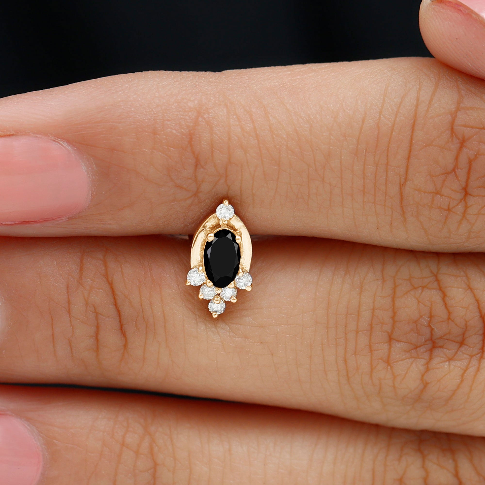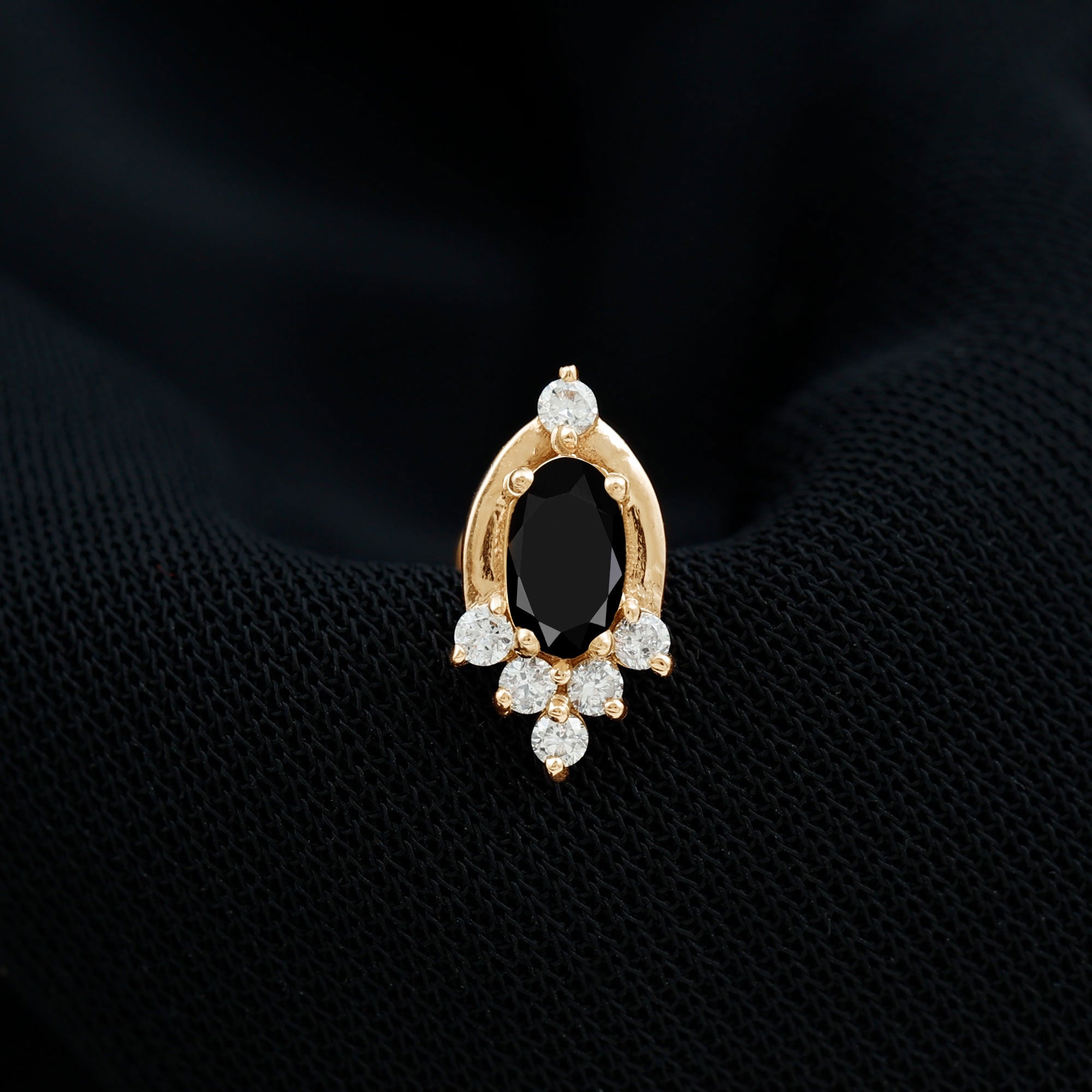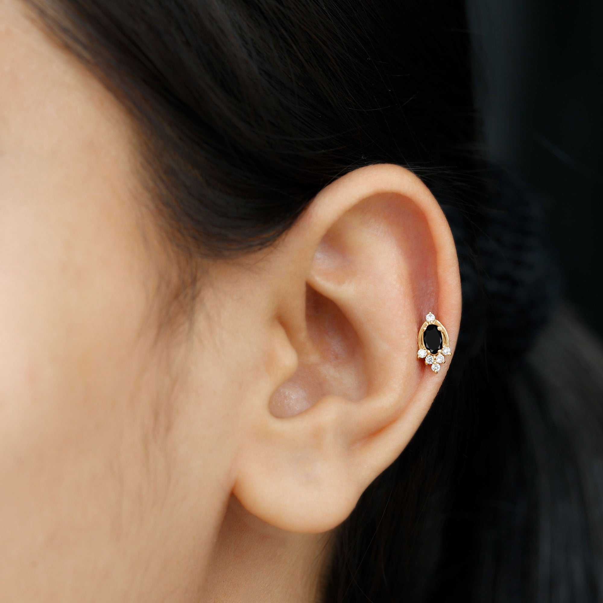 Add a touch of elegance to your look with this exquisite Helix Earring featuring a sparkling Oval Cut Black Onyx and Round Cut Moissanites in Prong Setting, set in a unique and eye-catching design. Crafted from Gold Metal, this Body Jewelry is perfect for elevating your casual and special attire. The Simple Flat Back Closure ensures a secure and comfortable fit, making it perfect for wearing on your Conch, Tragus, Upper Lobe, Cartilage, or Helix piercing. Whether youre attending a special occasion or just want to add some extra sparkle to your everyday look, this Onyx Earring is sure to fascinate everyone around you. Surprise your special someone with this lovely graduation gift and watch their eyes light up with joy.
