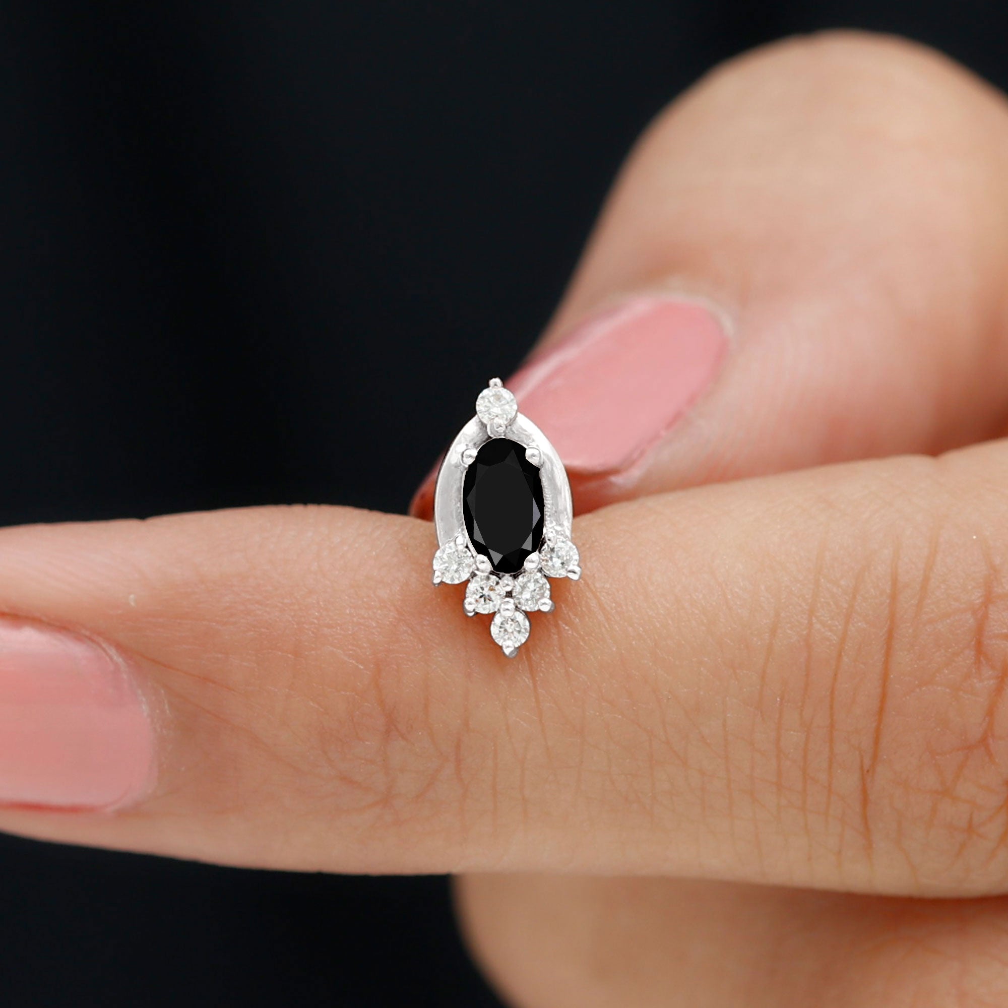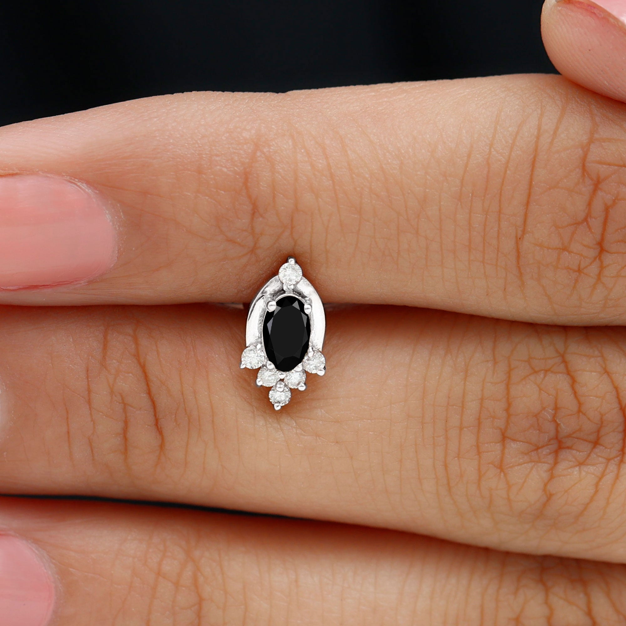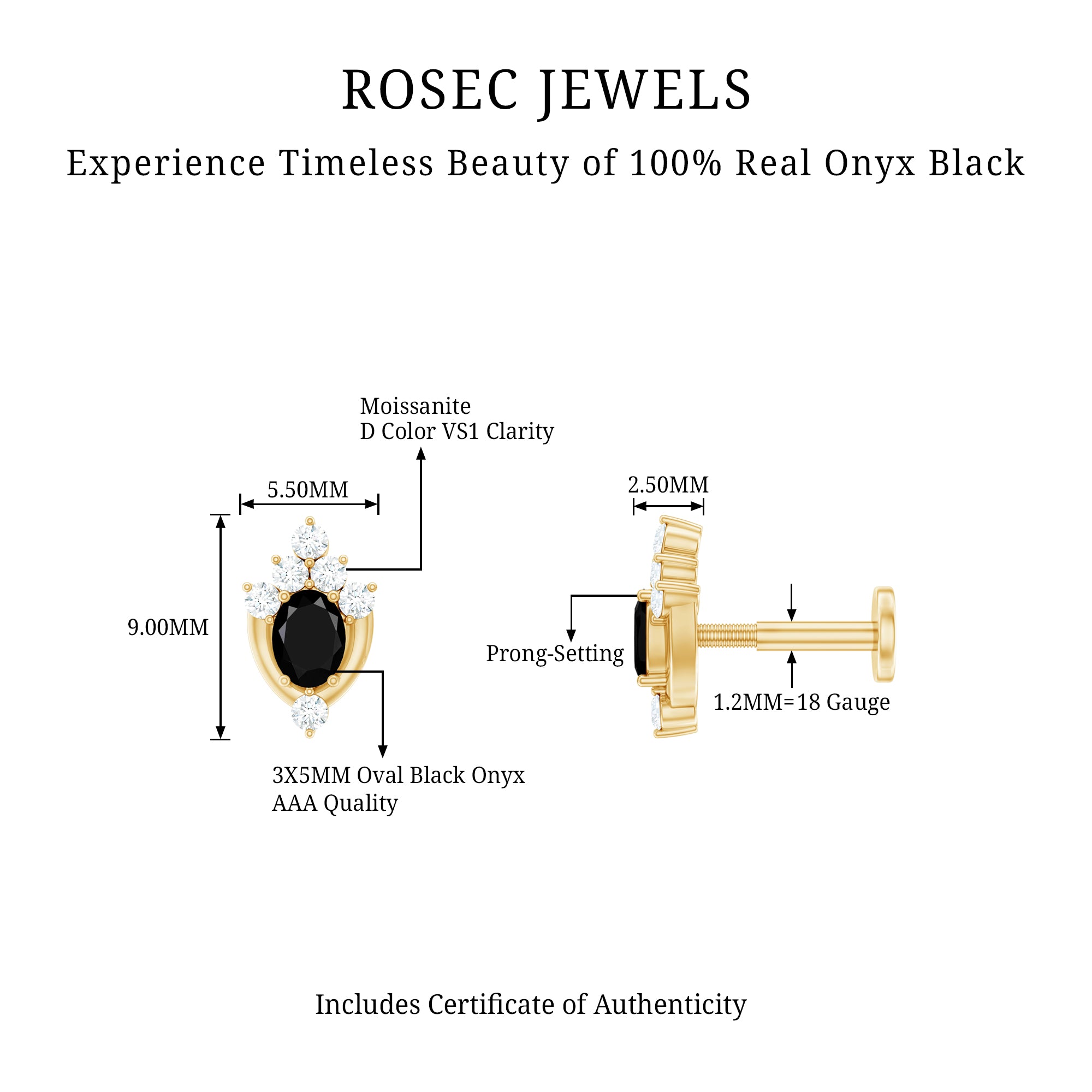 Add a touch of elegance to your look with this exquisite Helix Earring featuring a sparkling Oval Cut Black Onyx and Round Cut Moissanites in Prong Setting, set in a unique and eye-catching design. Crafted from Gold Metal, this Body Jewelry is perfect for elevating your casual and special attire. The Simple Flat Back Closure ensures a secure and comfortable fit, making it perfect for wearing on your Conch, Tragus, Upper Lobe, Cartilage, or Helix piercing. Whether youre attending a special occasion or just want to add some extra sparkle to your everyday look, this Onyx Earring is sure to fascinate everyone around you. Surprise your special someone with this lovely graduation gift and watch their eyes light up with joy.