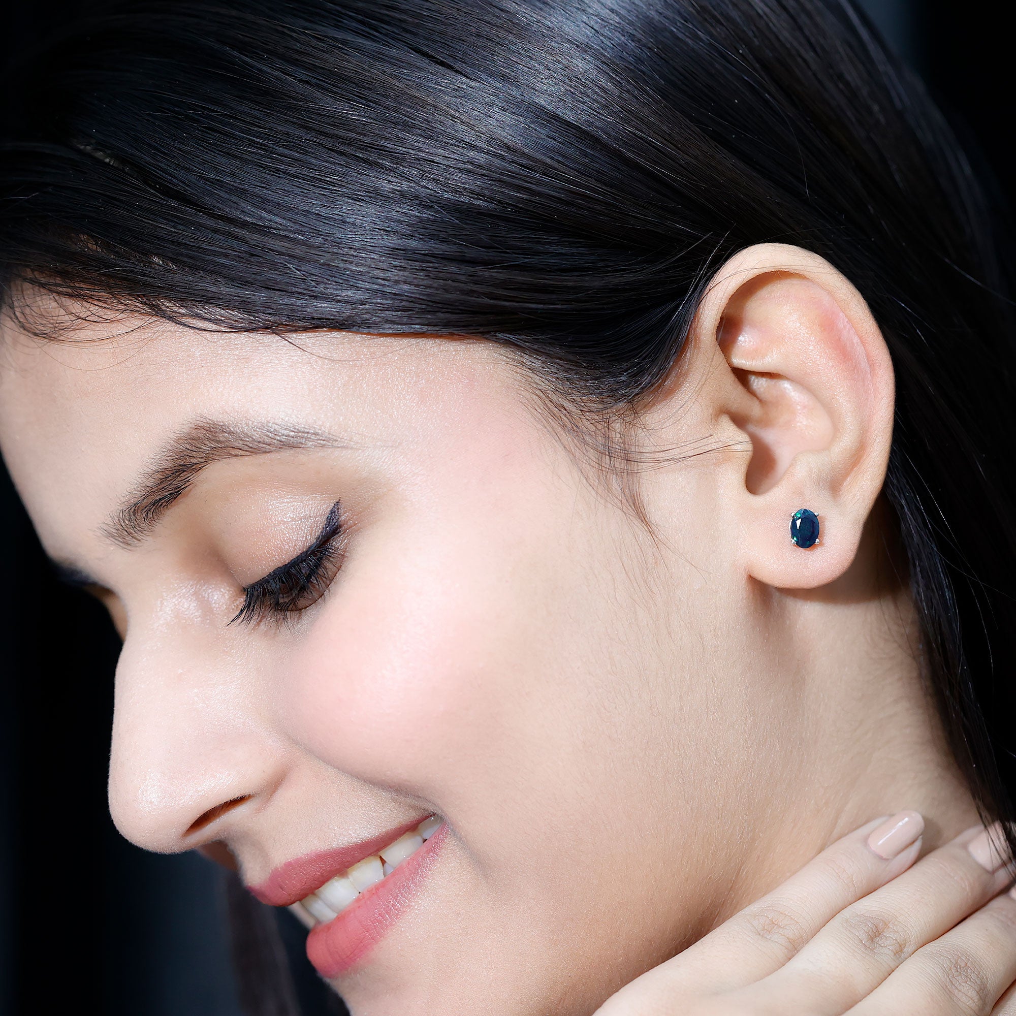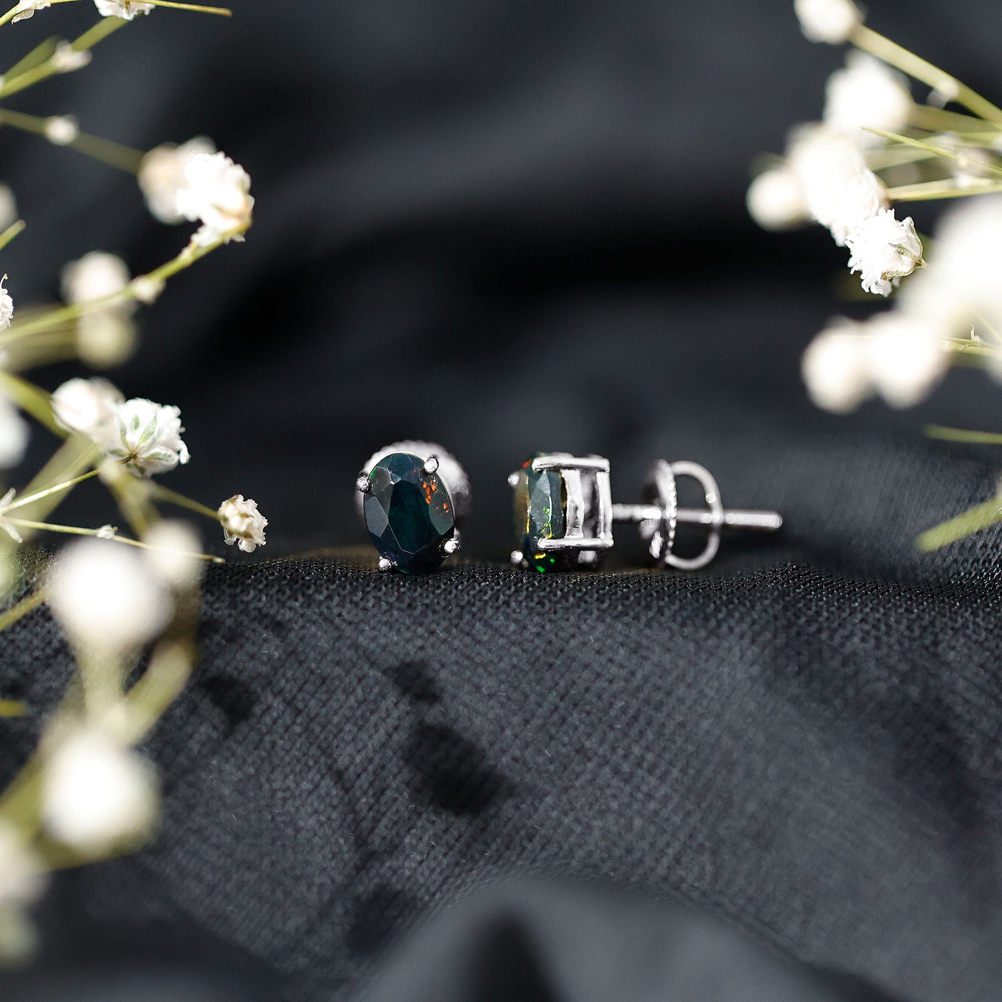 Enhance your style with a hint of elegance and sophistication using these Black Opal Stud Earrings. Each earring showcases a 5X7 MM oval cut black opal, securely set in 4-prong setting. The Solitaire Earrings come with screw back closures, ensuring they remain comfortably in place all day long. They are lightweight and easy to wear, making them ideal for daily wear as well as special events. The sleek design ensures comfort, allowing you to wear them for hours without any irritation. Black opal carries significant meaning, often linked to strength, creativity, and protection. Thus, these October Birthstone Earrings serve not only as a lovely accessory but also as a meaningful symbol. They make a perfect gift for birthdays, anniversaries, or simply to express your affection. These Oval Stud Earrings blend timeless elegance with a contemporary touch, adding a splash of color and sophistication to any outfit, whether it is casual or formal.