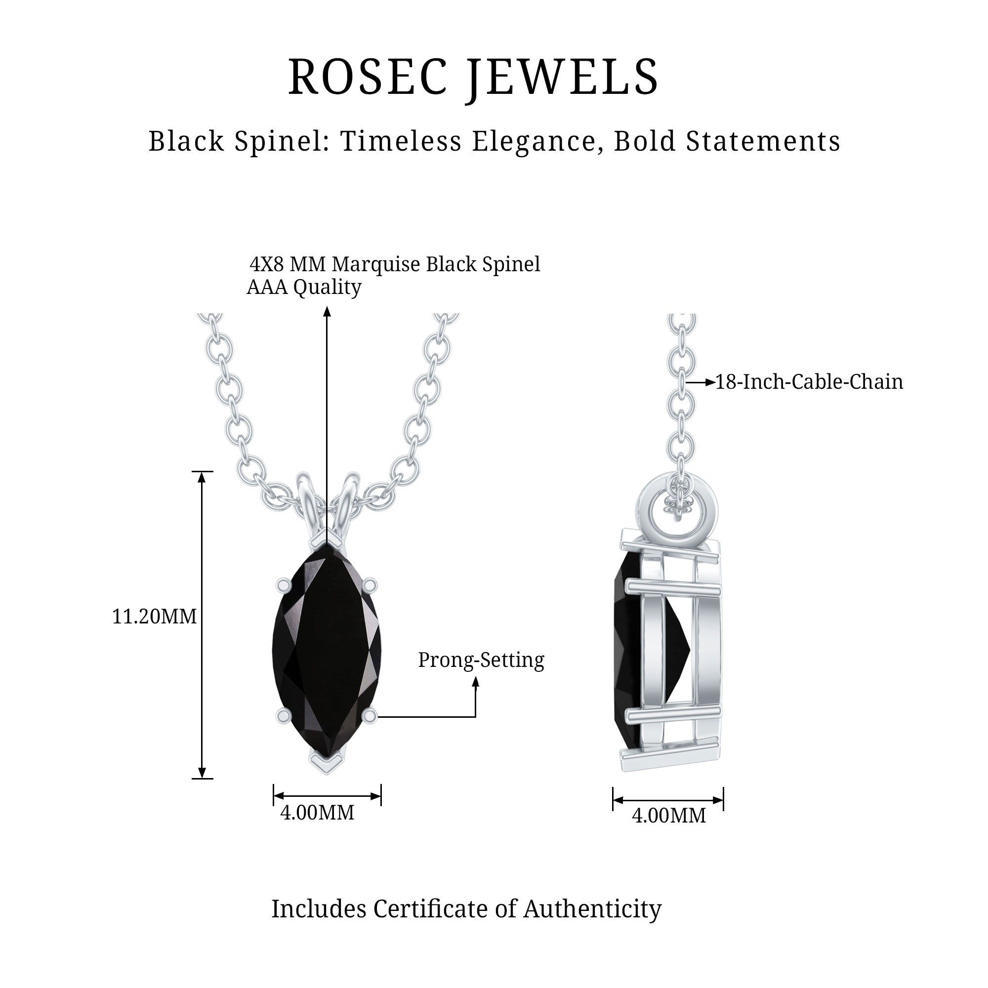 This Black Spinel Pendant beholds an intense hue that decorates the neckline, precisely crafted with 14K White Gold Plated Silver. The pendant features a 4X8 MM Marquise Shape Black Spinel securely placed in Prong Setting. This Solitaire Pendant dazzles with AAA quality Black Spinel and dangles with a sturdy cable chain that allows you to adjust it as per your style. The healing properties of Black Spinel make this pendant a thoughtful gift for your lady that will strengthen her immune system, improves the sleep and detox her body. This single stone pendant can be styled either solely or can be layered with other necklaces to achieve a statement look. This Marquise Necklace will be sent to you in a velvet pouch with the certificate of authenticity.