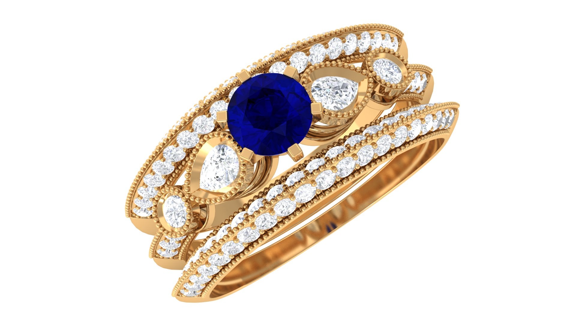This beautiful Bridal Ring Set is adorned with Blue Sapphire and Diamond to make for a gorgeous choice for special occasions. Milgrain beaded details on the Band give a vintage appeal to this Wedding Ring Set.