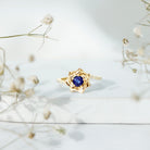 This Floral Engagement Ring is both glamorous and captivating. It showcases a Round Shape Blue Sapphire set in a Prong Setting, accented by sparkling Diamond Side Stones.