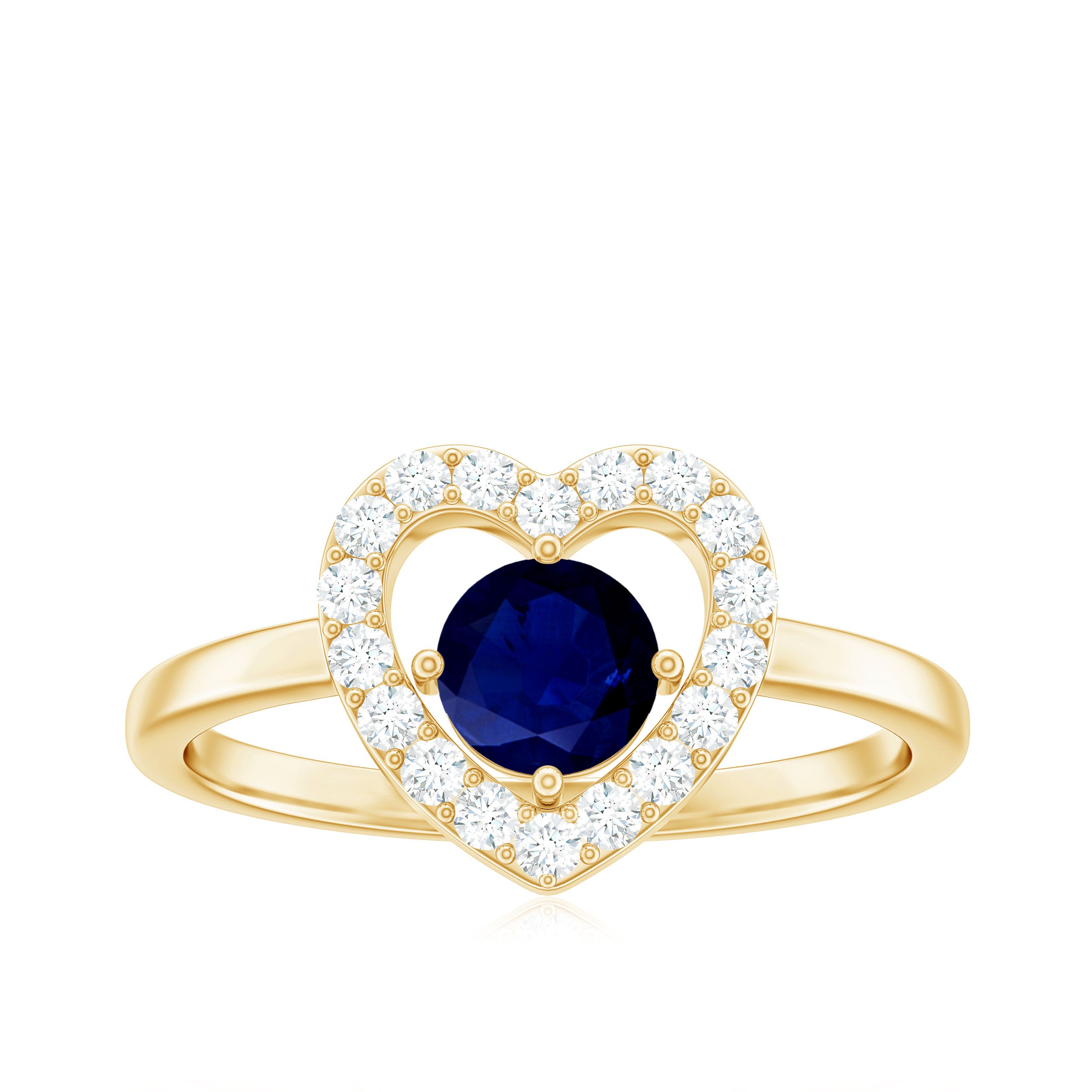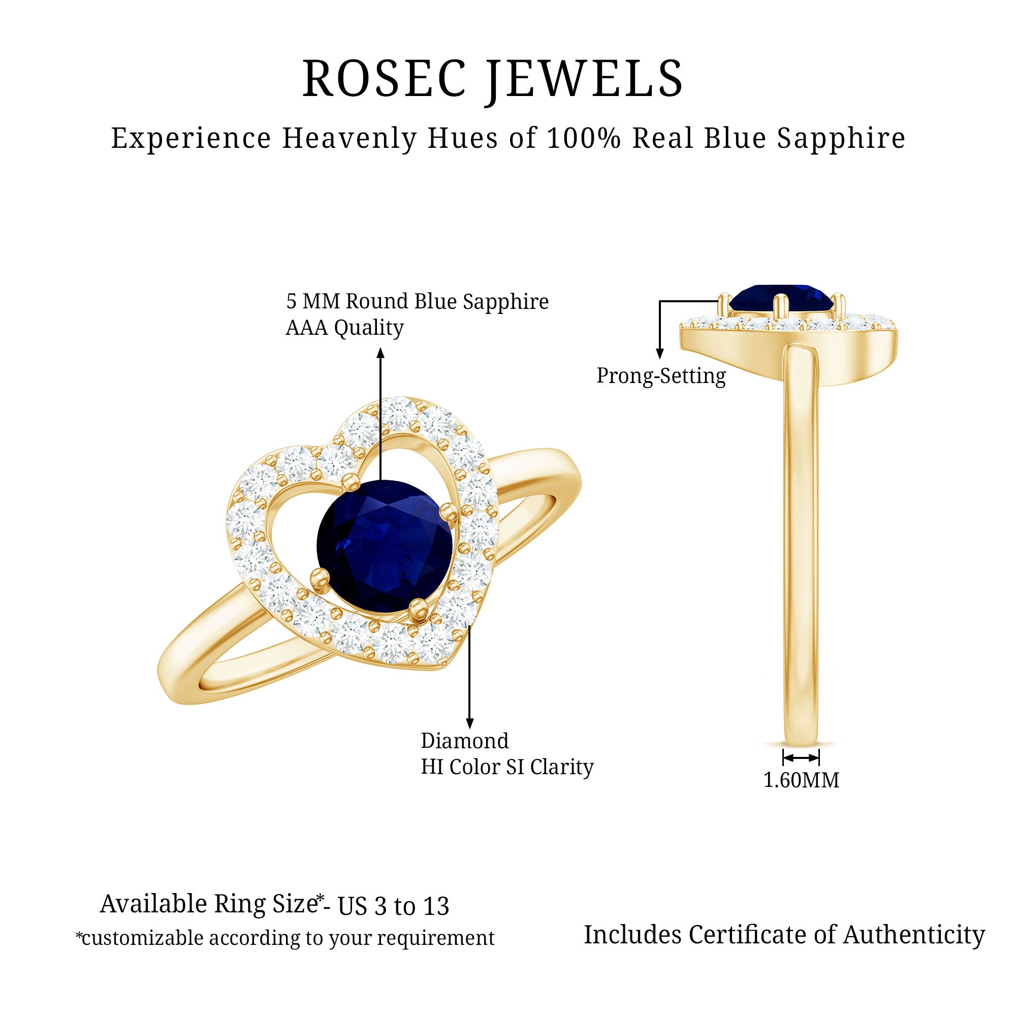 Complete your favorite looks with this charming Blue Sapphire Ring, designed to add a touch of elegance. The ring features a brilliant Round Shape Blue Sapphire, delicately placed in a 4 Prong Diagonal Setting, and is surrounded by sparkling Diamond stones, forming a captivating heart shape. Embrace the beauty and sentiment of this adorable ring, symbolizing the love and affection you share with your partner.