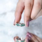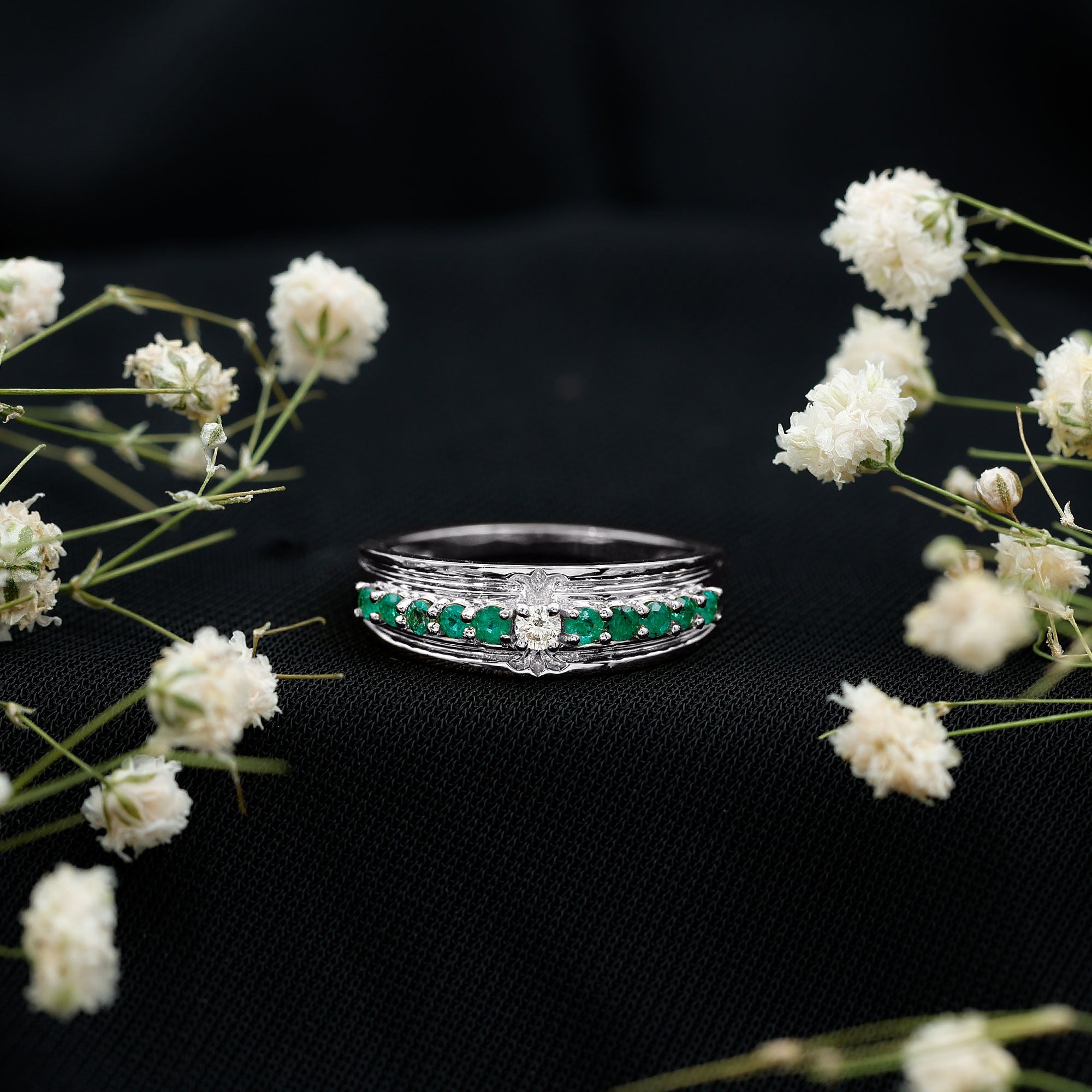Mark a milestone with our Vintage Inspired Diamond Anniversary Ring, it is a stunning piece that combines classic charm with modern beauty. Embedded with a round cut diamond that shines brightly, flanked on both sides by rich green emeralds. Each stone is carefully prong set to capture light from every angle, creating a radiant sparkle that draws attention with every movement. The engraved design at the center and along the band adds a touch of vintage artistry, giving the Diamond and Emerald Ring character and a timeless appeal. The combination of brilliant HI-SI quality diamonds and vibrant AAA quality emeralds symbolizes love, prosperity, and lasting commitment, making it an ideal choice for weddings, anniversaries, or other special occasions. The wide band is designed for both style and comfort, fitting securely while making a bold statement. Every detail, from the polished finish to the secure setting of each gemstone, reflects the skill and care of expert craftsmanship. Whether worn alone or paired with other jewelry, the Vintage Anniversary Ring adds elegance to any outfit. Its blend of classic design and sparkling gemstones creates a piece that feels meaningful and special every time it is worn.