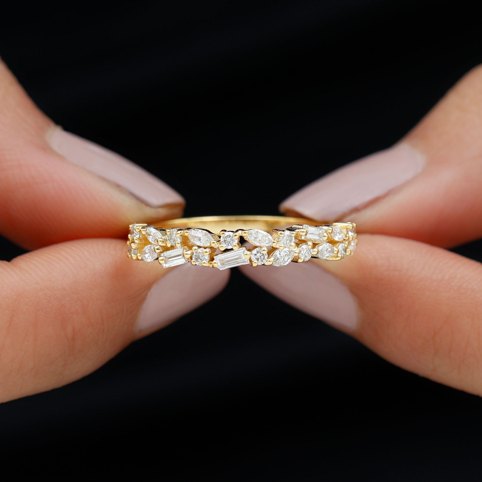 Let your feelings shine through a ring that blends beauty, meaning, and timeless style in the sweetest way. This Diamond Half Eternity Ring brings sparkle from every angle, featuring a lovely mix of baguette, marquise, and round stones set neatly in prongs. Each diamond catches the light differently, creating a gentle glow that feels elegant without being overwhelming. This comfortable Diamond Wedding Band will surely become a part of your daily wear, whether worn alone or stacked with other favorites. Real HI-SI quality diamonds add clarity and brilliance, giving the Half Eternity Wedding Band a refined look that remains stunning over time. The thoughtful arrangement of shapes adds character, making the ring stand out while staying simple and wearable. Whether given as a gift or chosen for yourself, it carries warmth and intention. Let the Two Row Eternity Band become a cherished piece that marks important moments, celebrates deep connections, and adds a soft shine to every day. Its elegance, comfort, and sparkling details make it a truly special addition to any jewelry collection.