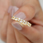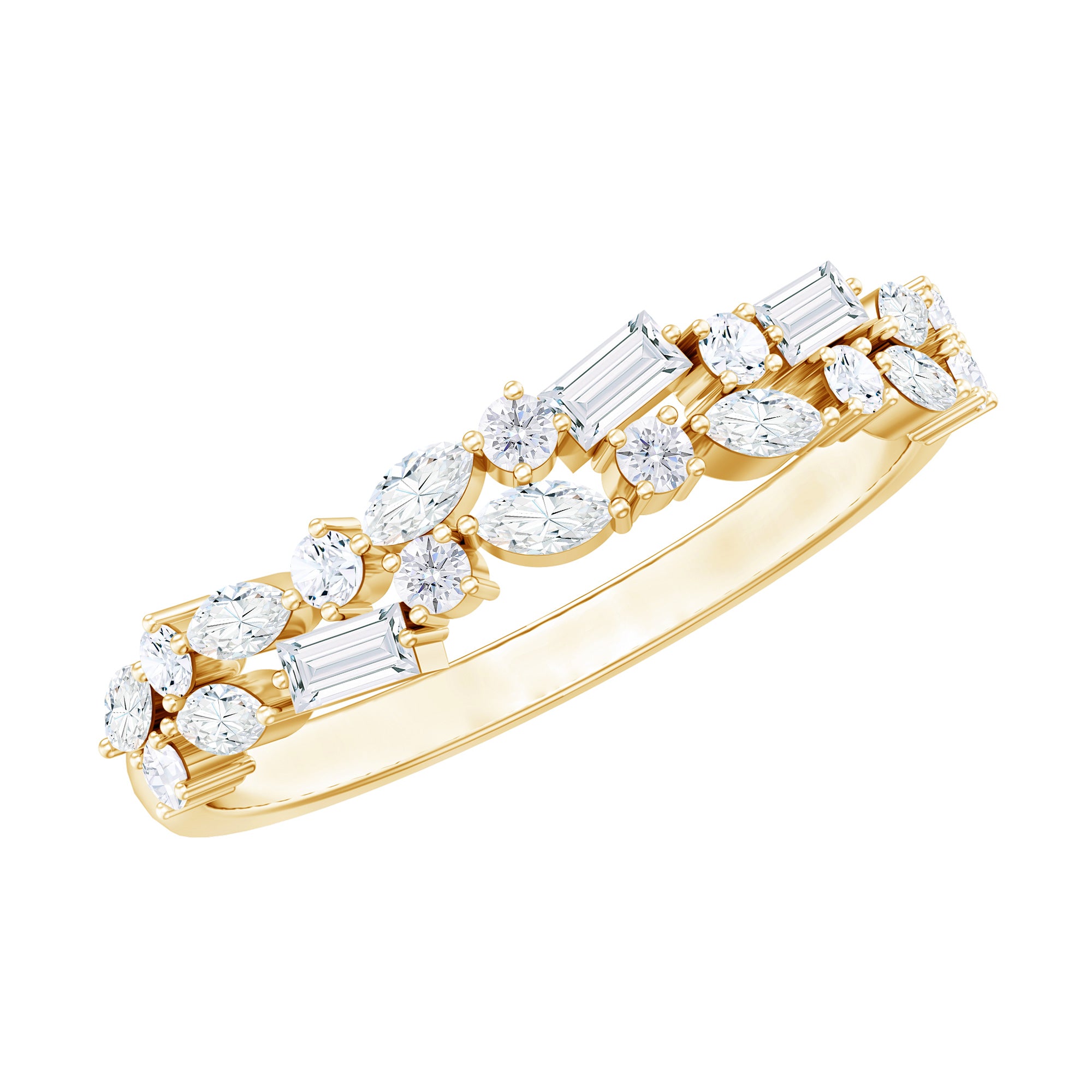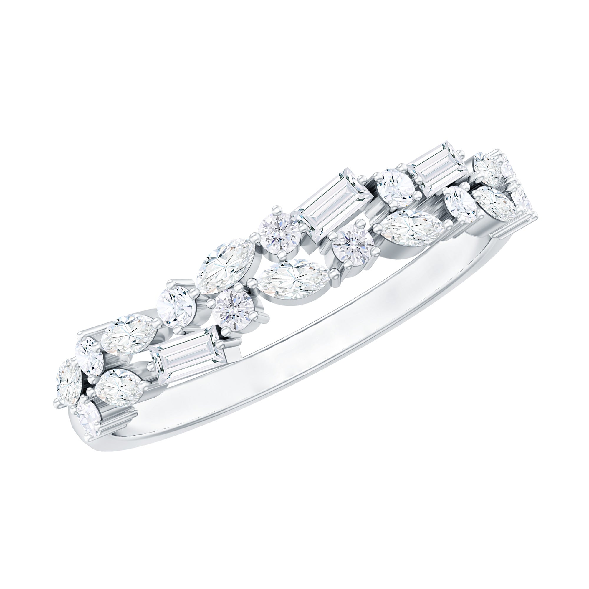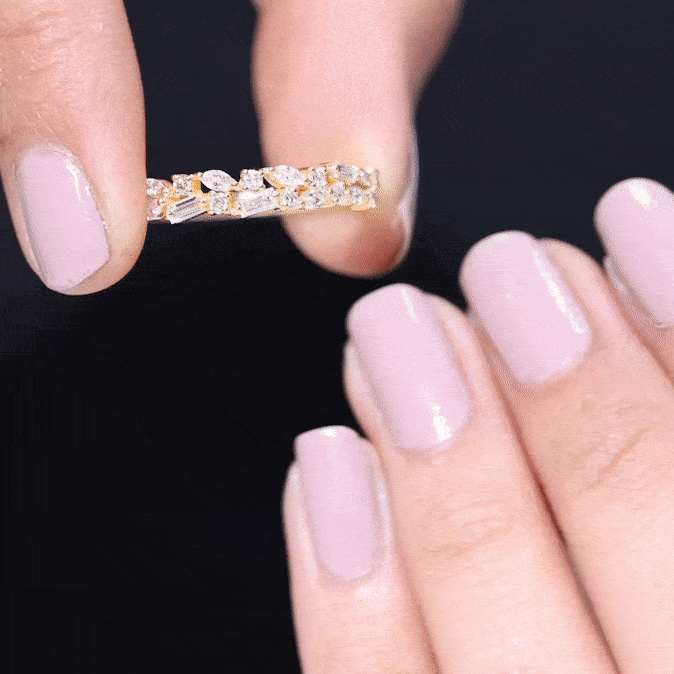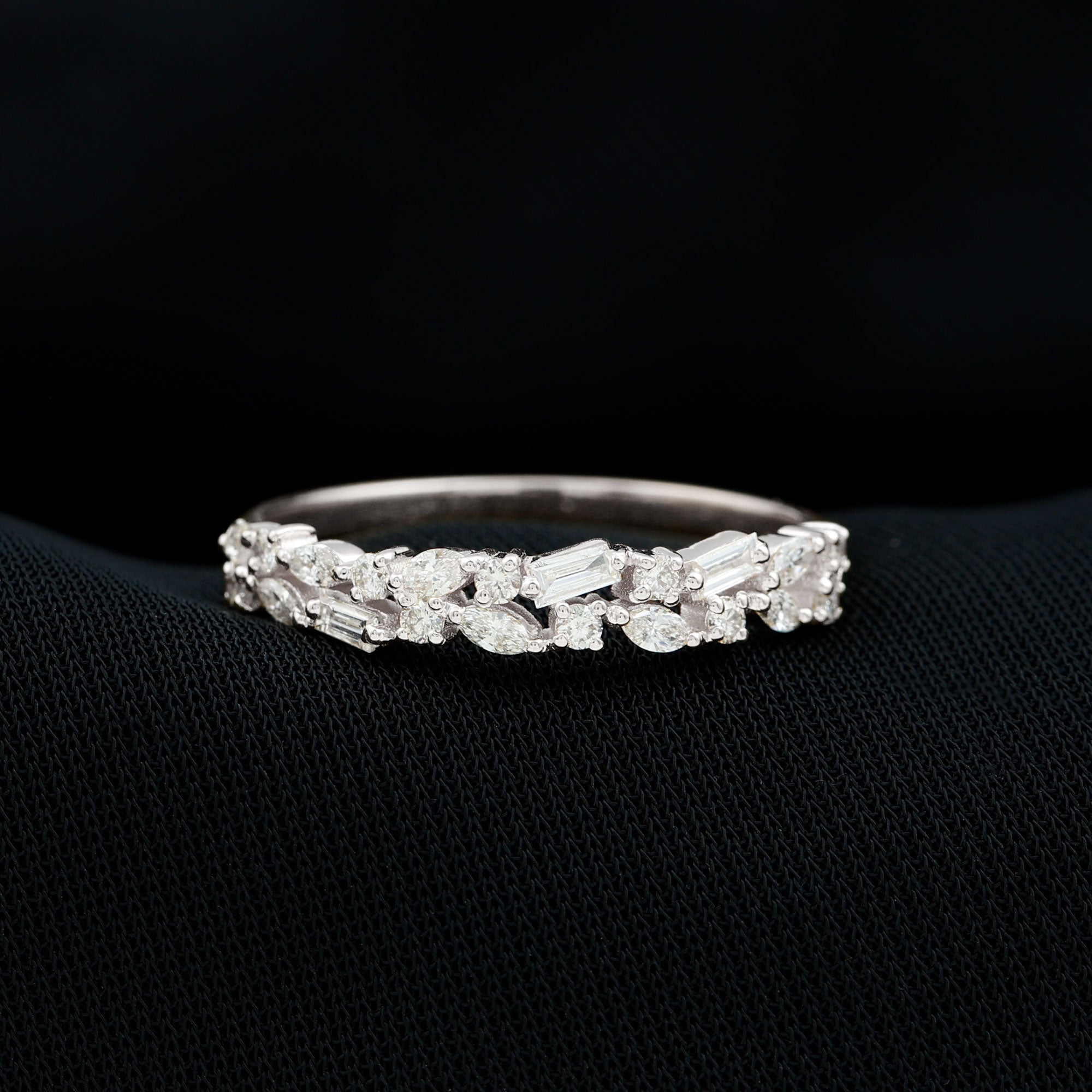 Let your feelings shine through a ring that blends beauty, meaning, and timeless style in the sweetest way. This Diamond Half Eternity Ring brings sparkle from every angle, featuring a lovely mix of baguette, marquise, and round stones set neatly in prongs. Each diamond catches the light differently, creating a gentle glow that feels elegant without being overwhelming. This comfortable Diamond Wedding Band will surely become a part of your daily wear, whether worn alone or stacked with other favorites. Real HI-SI quality diamonds add clarity and brilliance, giving the Half Eternity Wedding Band a refined look that remains stunning over time. The thoughtful arrangement of shapes adds character, making the ring stand out while staying simple and wearable. Whether given as a gift or chosen for yourself, it carries warmth and intention. Let the Two Row Eternity Band become a cherished piece that marks important moments, celebrates deep connections, and adds a soft shine to every day. Its elegance, comfort, and sparkling details make it a truly special addition to any jewelry collection.
