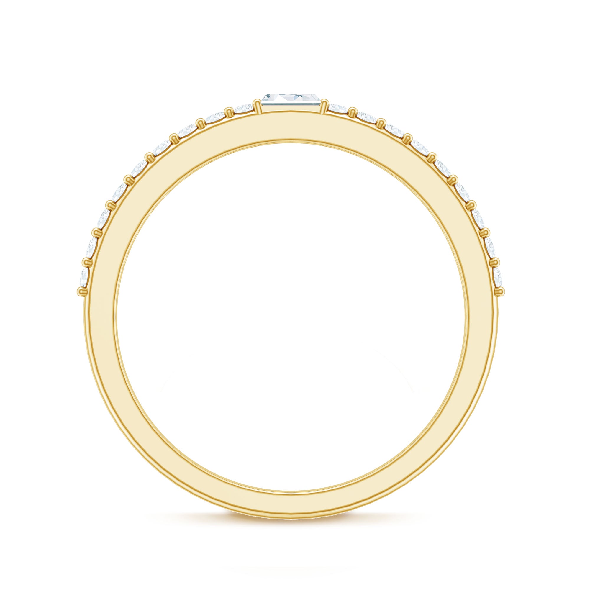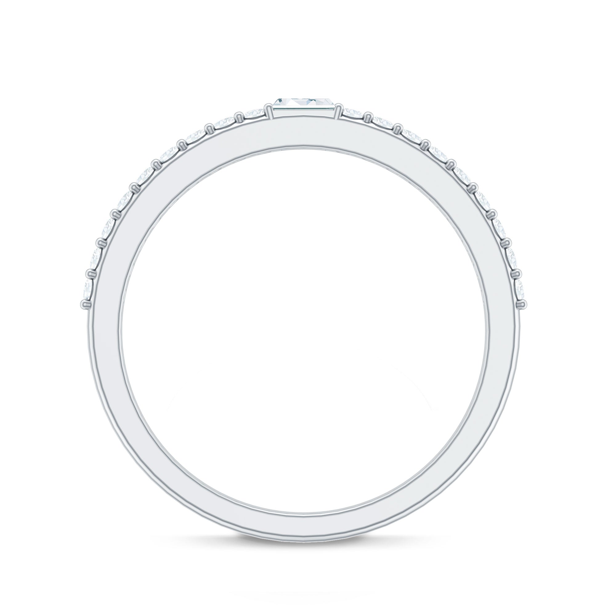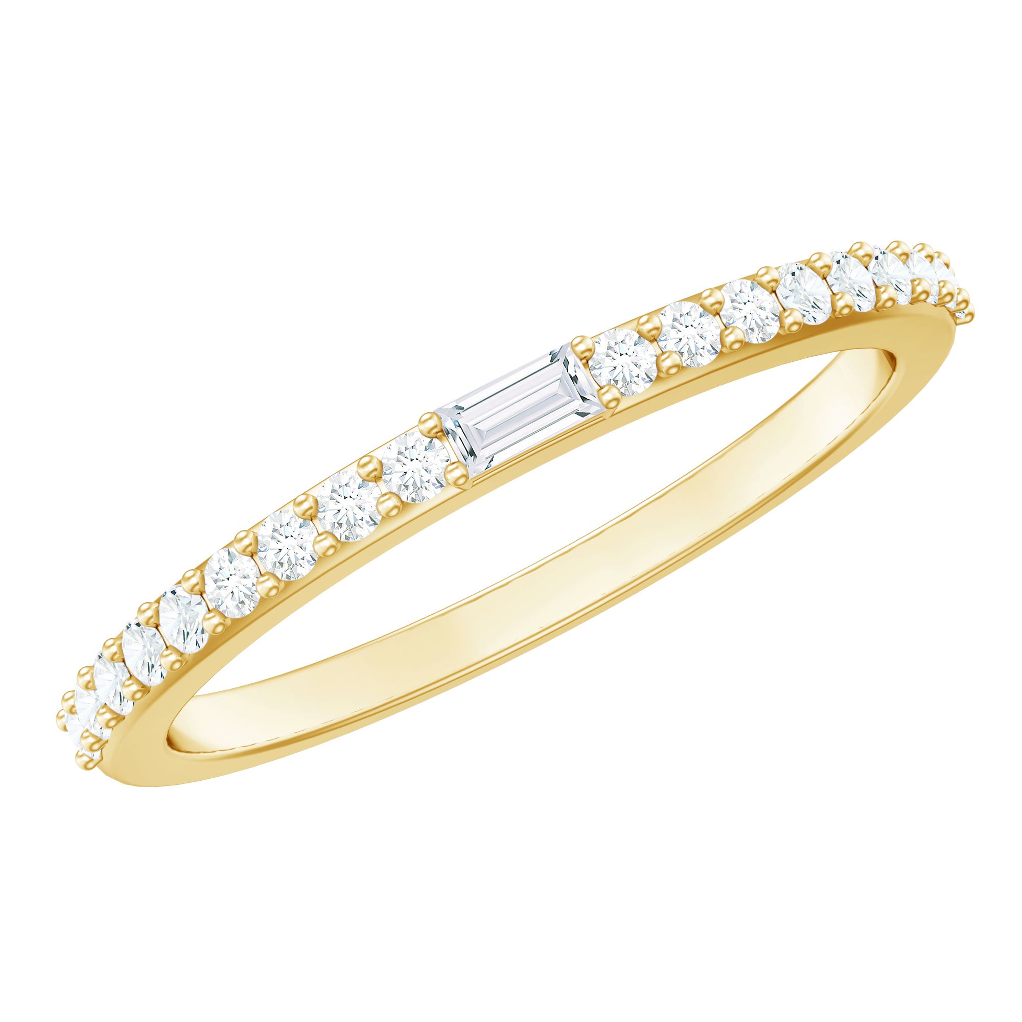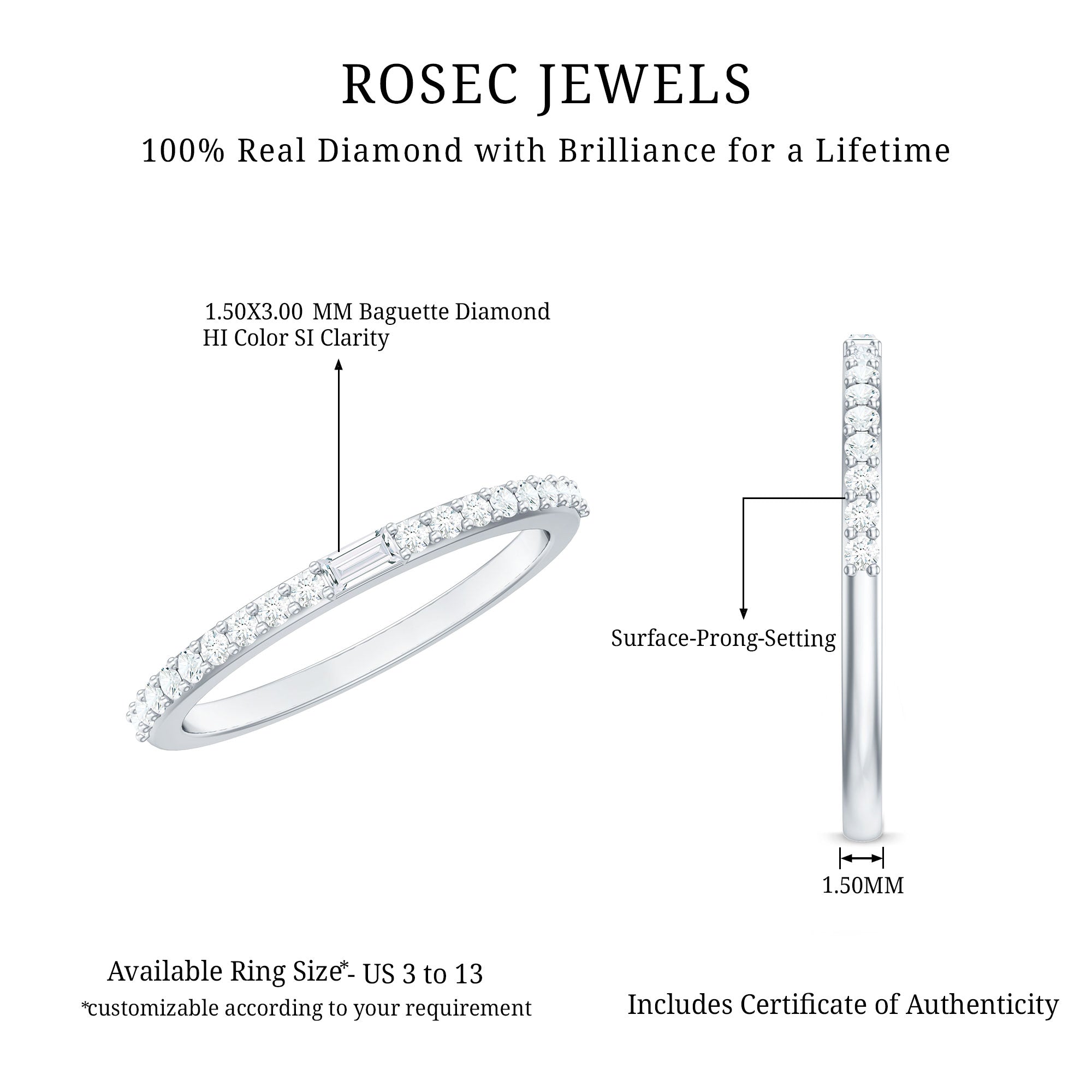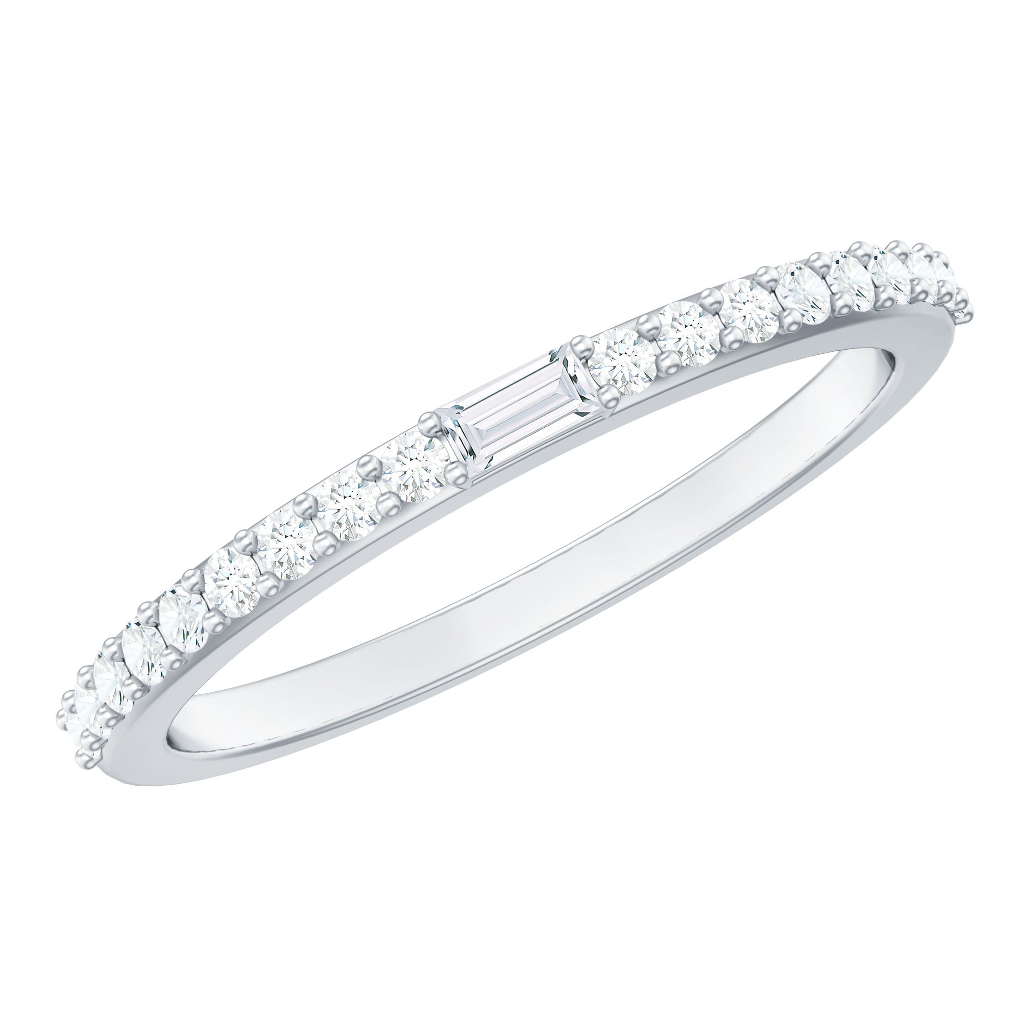 Express your love with this enchanting Diamond Half Eternity Band. The brilliance of Round Cut Diamonds adorns this band, while a dazzling Baguette Cut Diamond takes center stage, making it a perfect gift for your beloved. Let this exquisite ring be a symbol of your affection and devotion, adding a touch of sparkle to your special moments together.