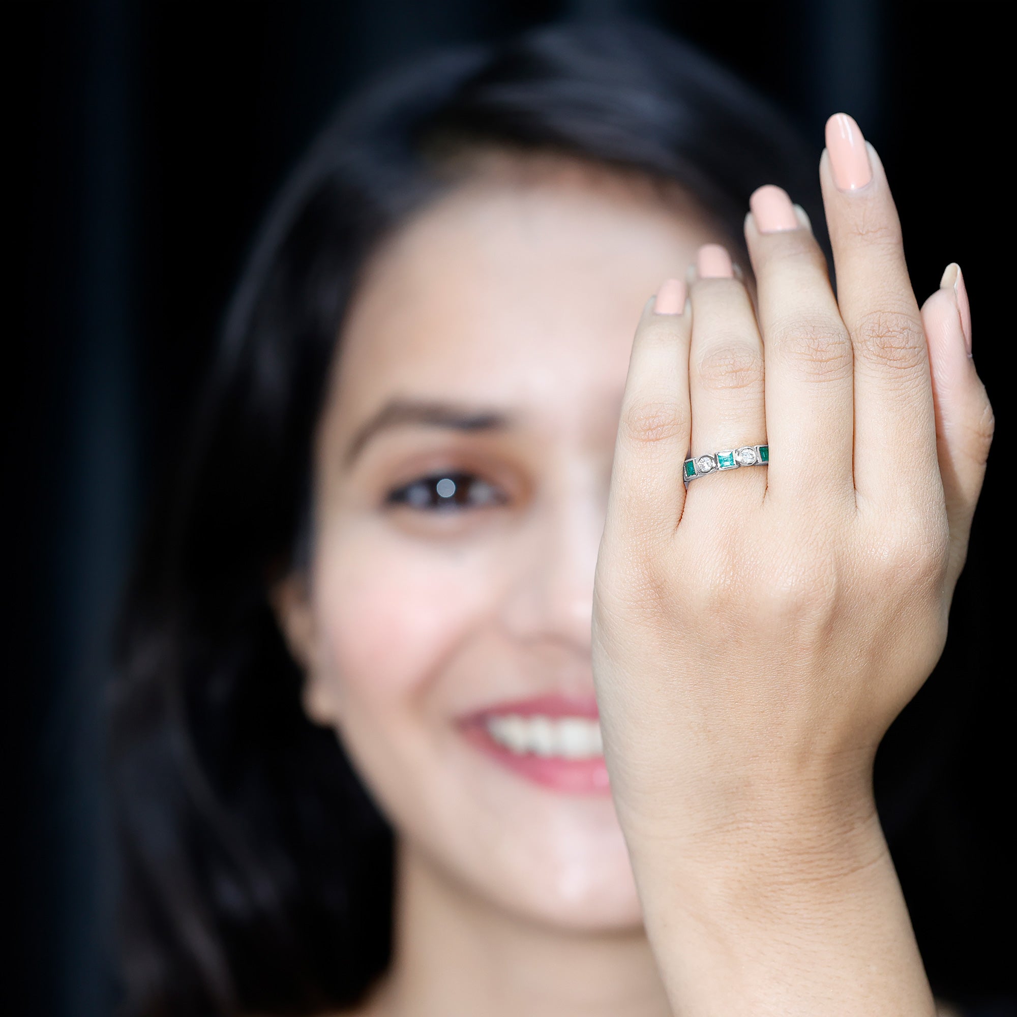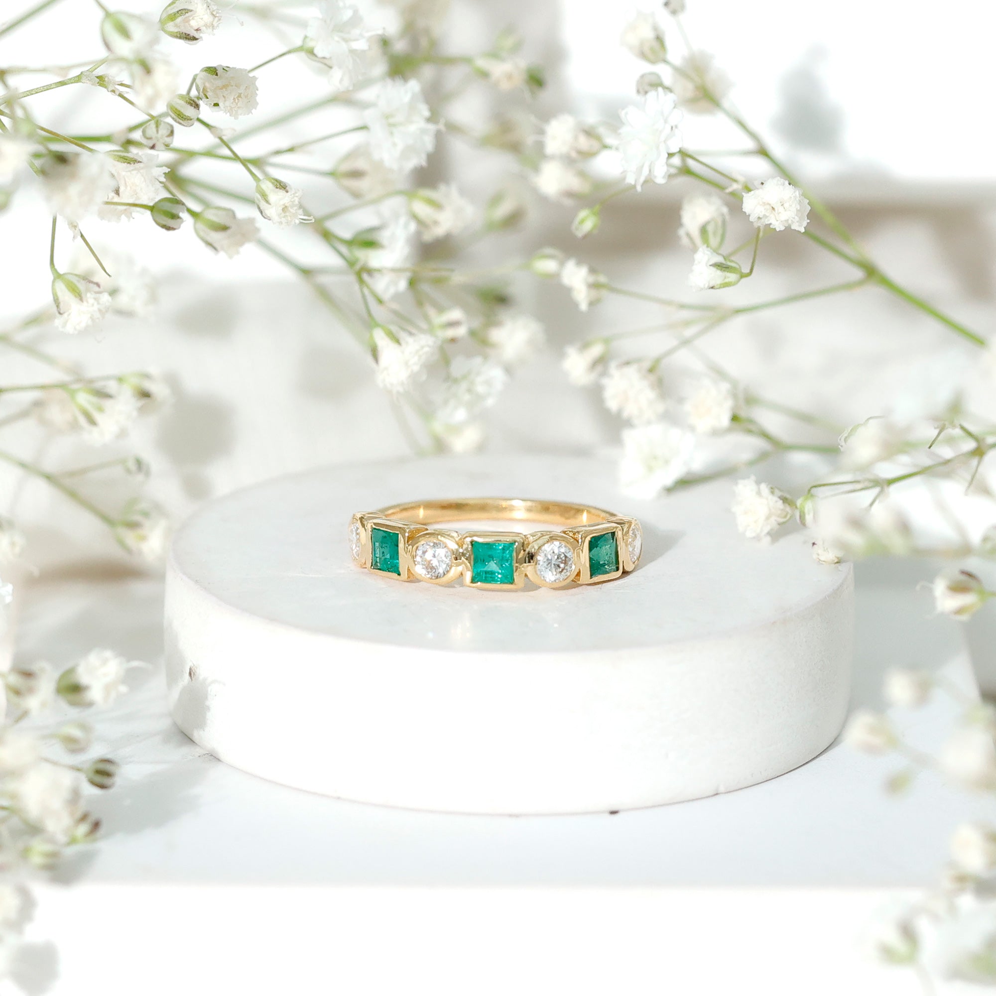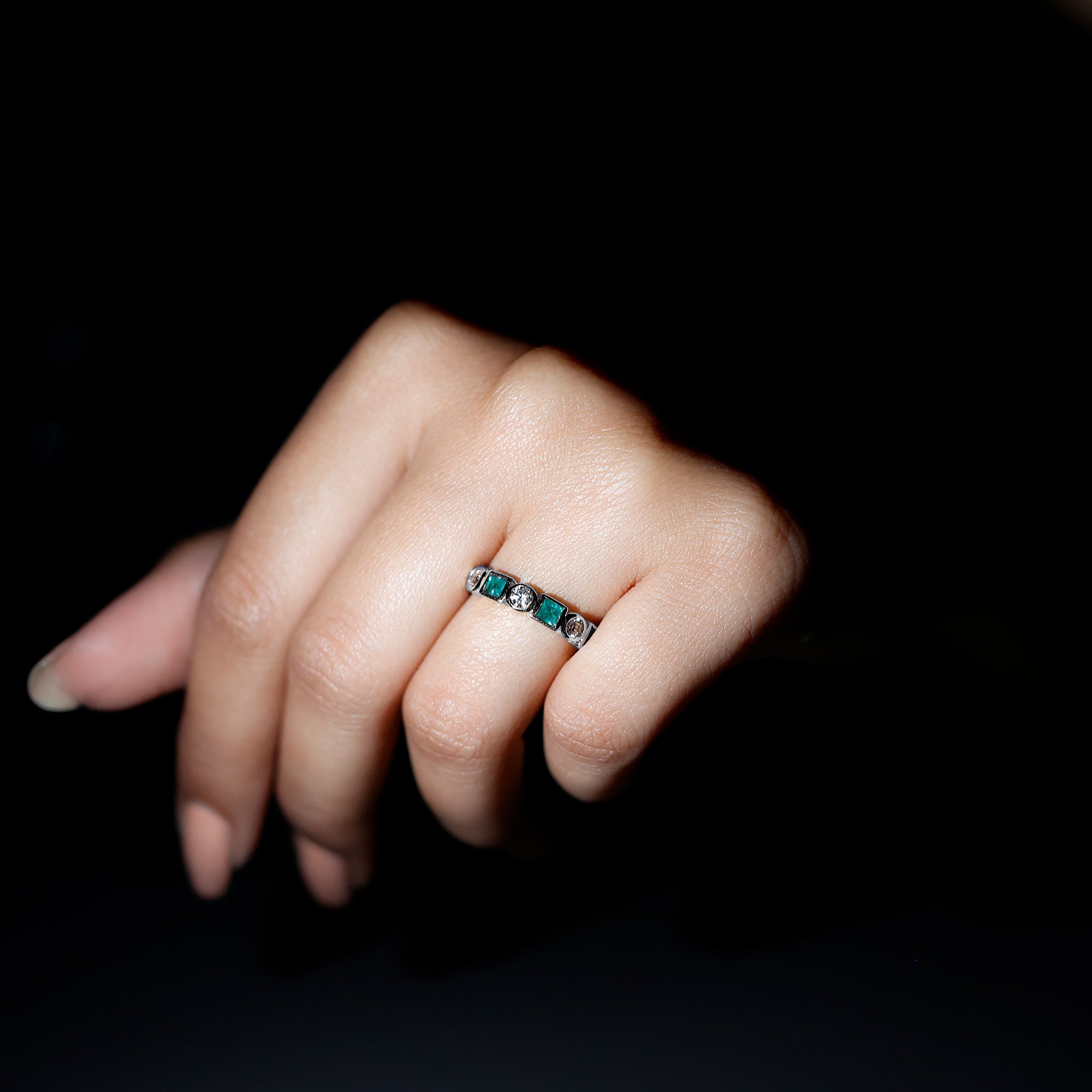 There is something truly magical about a ring that sparkles with both color and meaning, and this Emerald and Diamond Wedding Band does exactly that. Designed to turn everyday moments into something special, this elegant piece combines the richness of AAA quality emeralds with the timeless sparkle of HI-SI quality diamonds. The Half Eternity Ring features a row of princess cut emeralds and round cut diamonds, each one set securely in bezel setting. The gemstones are arranged in an alternating pattern across the front half of the band, creating a beautiful rhythm of vivid green and brilliant white sparkle. Whether it is worn as a wedding band, an anniversary ring, or simply a beautiful reminder of a meaningful bond, this piece captures the essence of love and sophistication. The emeralds bring a touch of natural charm, symbolizing hope and renewal, while the diamonds add a lasting sparkle that represents forever. Stack it with your engagement ring for a layered look or wear it solo for understated elegance - either way, it shines beautifully on its own. Crafted with care and attention to detail, this Emerald Wedding Band is more than just a piece of jewelry, it is a reflection of your story, your style, and your most treasured moments.