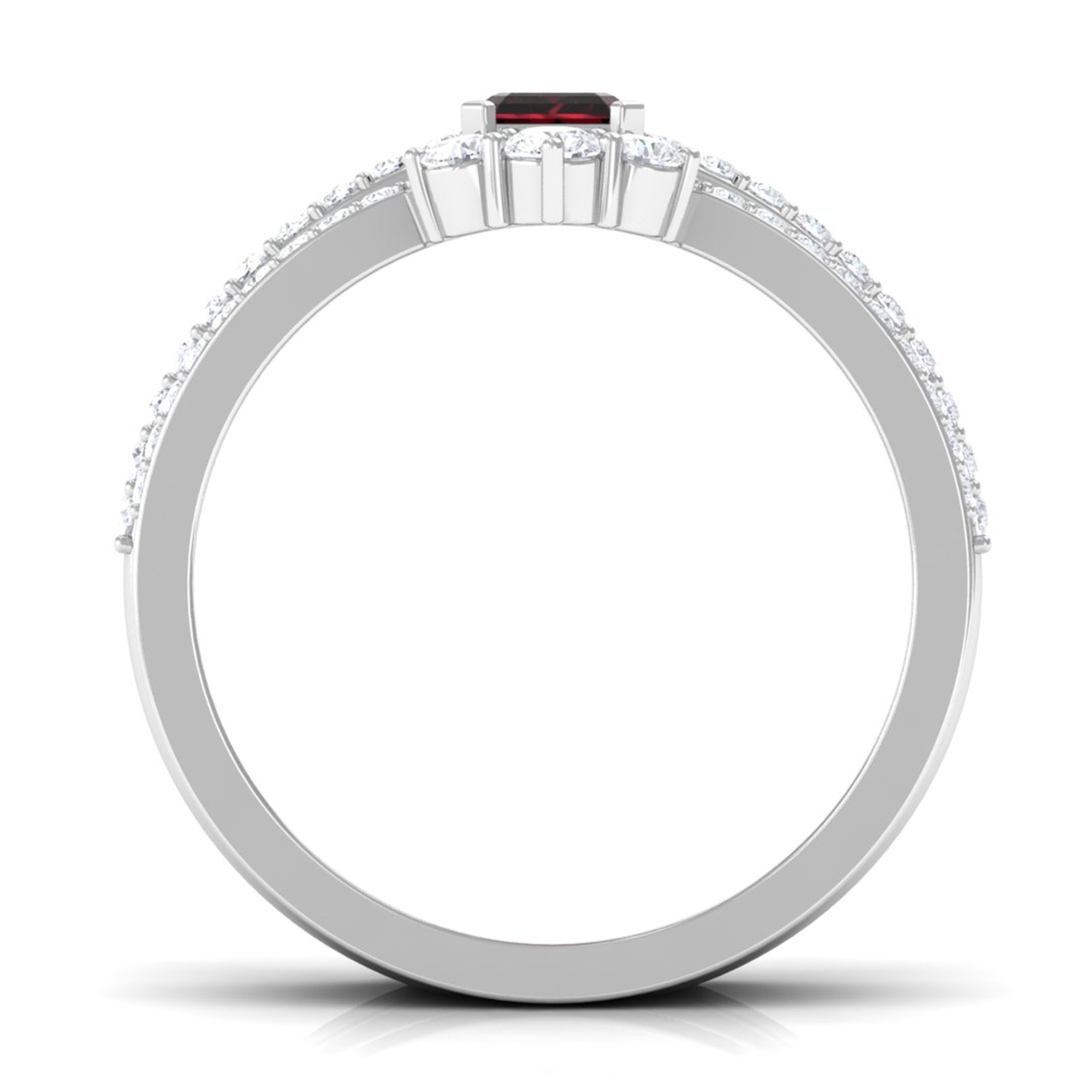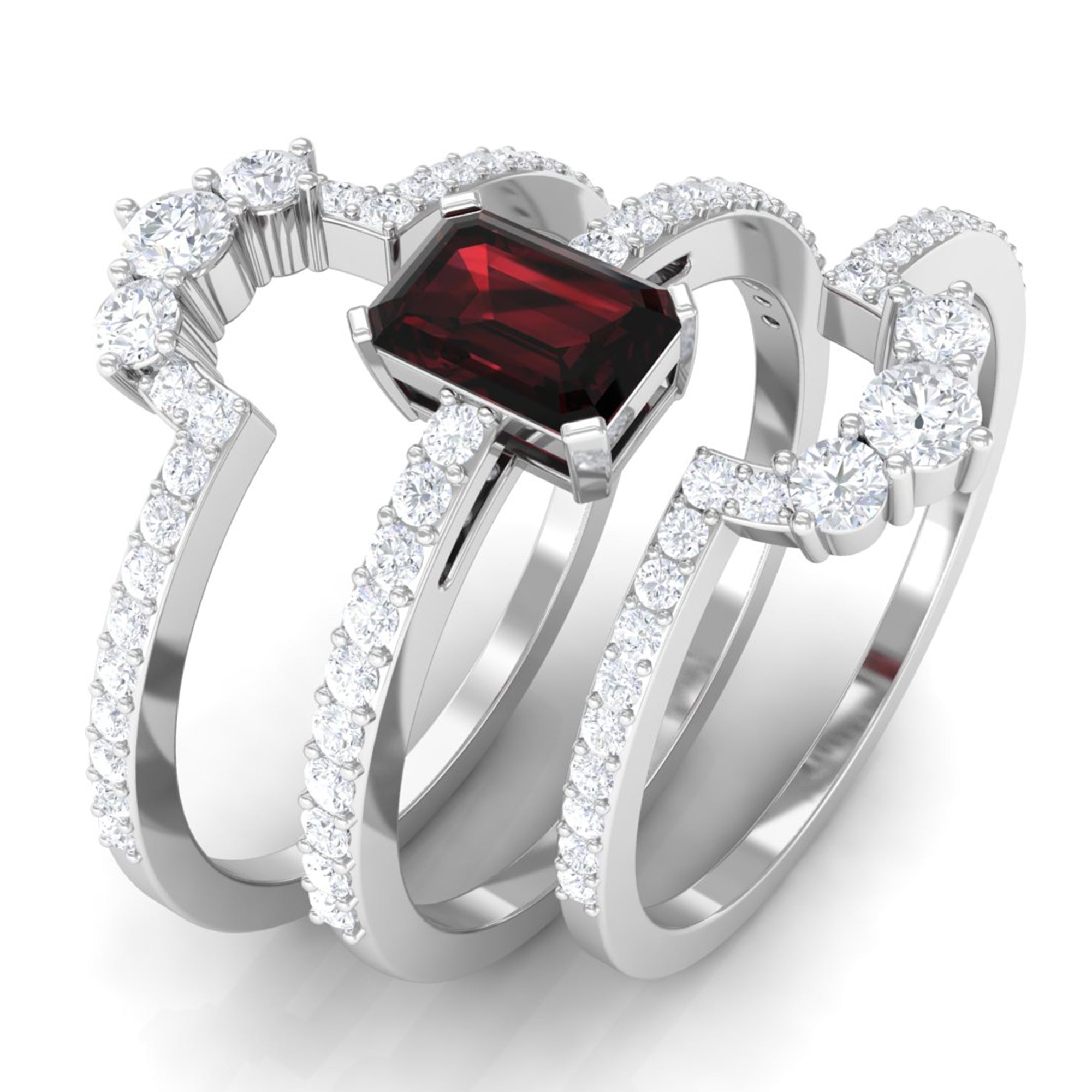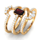 Create a stunning statement with this 3 Piece Bridal Ring Set, designed to capture the essence of timeless love and elegance. The centerpiece Solitaire Engagement Ring features a 4X6 mm Emerald Cut Garnet, flanked with sparkling Diamond Side Stones that catch the light with every movement. Complementing it are two gracefully Curved Enhancer Rings, adorned with round Diamond stones, that perfectly hug the engagement ring to create a harmonious look. Each piece is crafted to symbolize commitment, beauty and the sparkle of shared memories, making this Emerald Cut Wedding Ring Set an unforgettable choice for weddings, anniversaries or special milestones. Delivered in a signature jewelry box and available in various sizes, this Garnet Wedding Ring Set is ready to be gifted as a heartfelt expression of love or cherished as a personal treasure. Whether worn together for a complete, dazzling effect or individually for a touch of everyday elegance, these rings are as versatile as they are romantic. Meaningful and effortlessly elegant, this Wedding Bridal Ring Set turns every glance into a celebration of love.