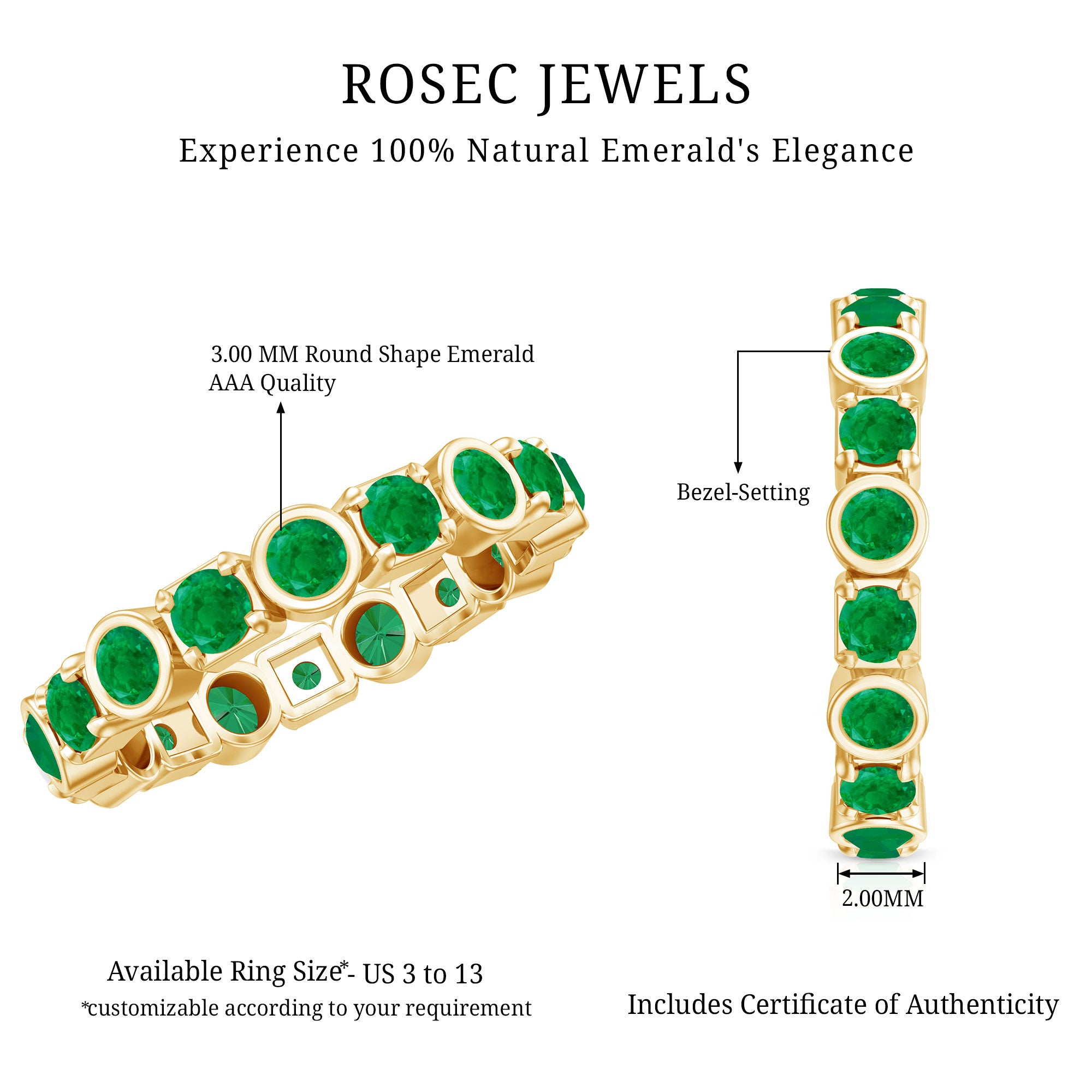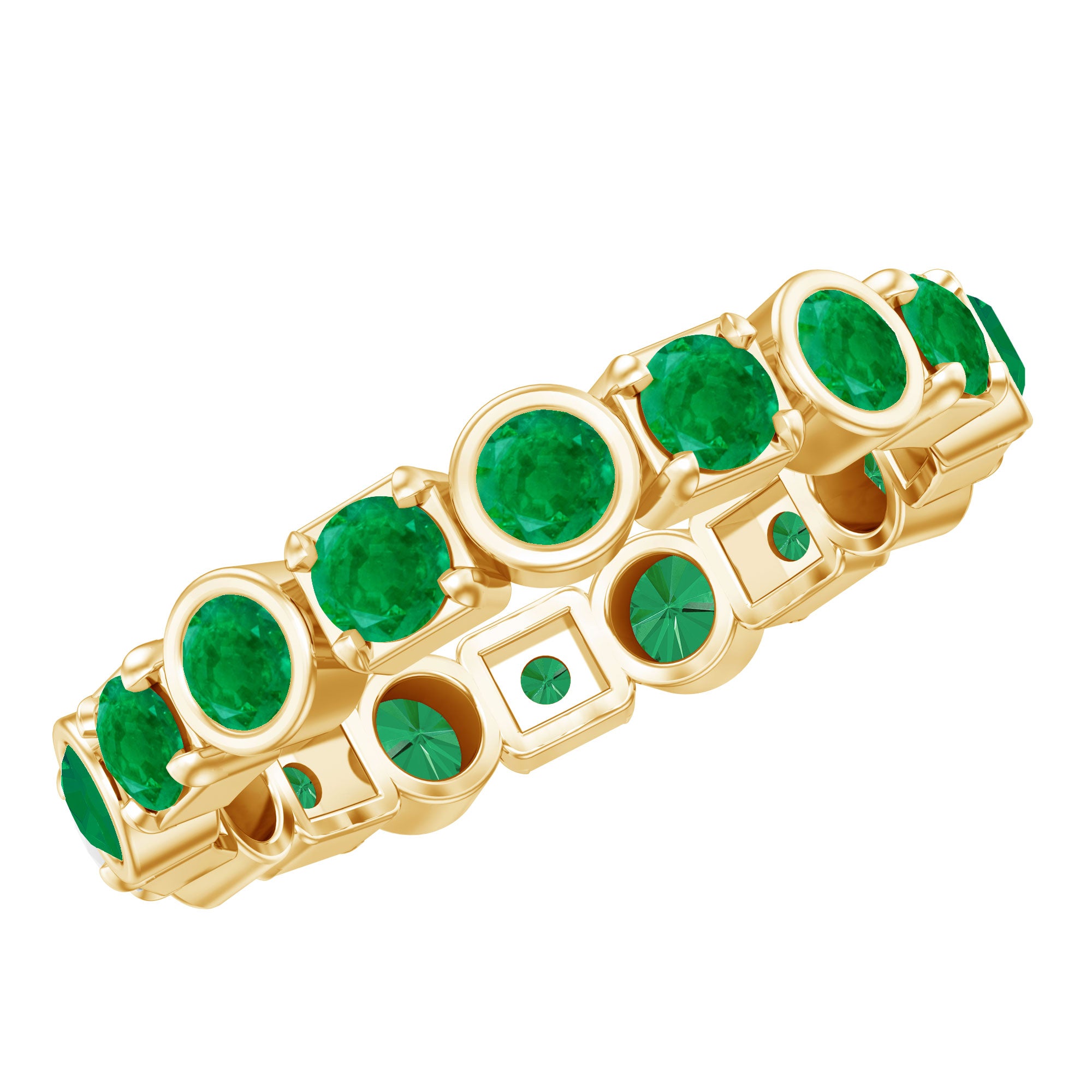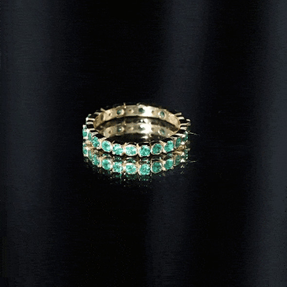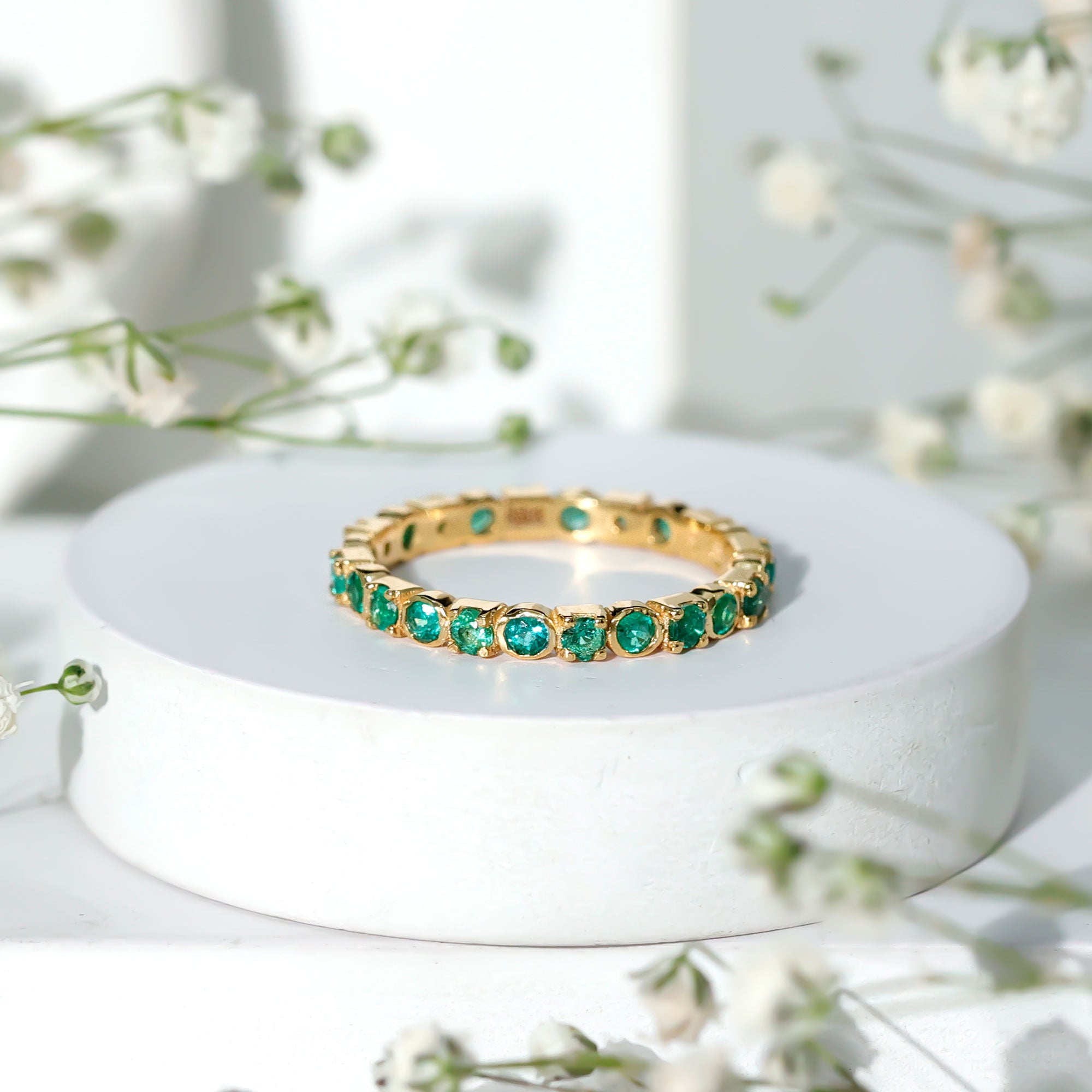An eternity band features gemstones set around the entire circumference of the ring. This design provides consistent visual sparkle from every angle while creating a harmonious flow across the band. The evenly placed emerald stones contribute to a structured and sophisticated aesthetic.