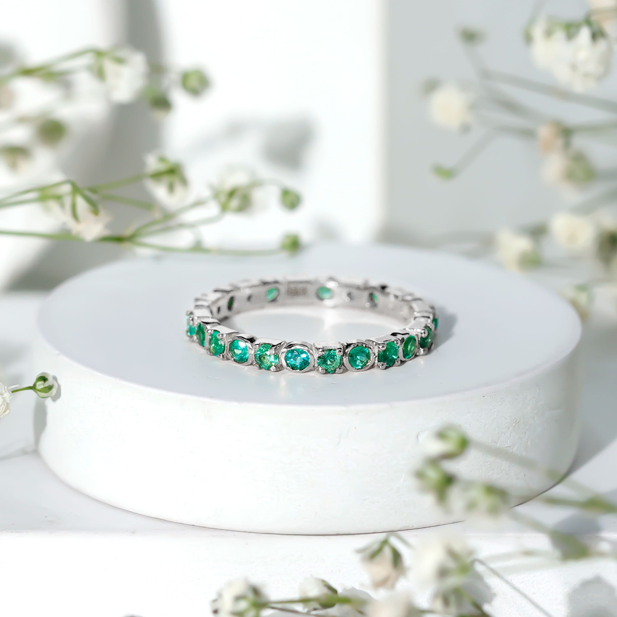 Timeless design meets modern elegance in the Emerald Eternity Band, a ring that beautifully blends geometric symmetry with the natural charm of lush green gemstones. Crafted with precision, it features a captivating pattern of alternating square and round shapes, each set with AAA quality emeralds that radiate vibrant hues. Known as the birthstone for May, emeralds symbolize love, growth, and renewal, making this Stackable Wedding Band a meaningful choice for special occasions or as a personal keepsake. The full eternity design forms an unbroken circle of gemstones, representing everlasting commitment and harmony. Its smooth, comfortable fit makes this Emerald Wedding Band perfect for everyday wear while maintaining an elegant and luxurious appeal. Versatile in style, the Emerald Anniversary Ring can be worn alone for a refined, minimalist look, paired with an engagement ring for a classic bridal set, or stacked with other bands to create a unique, layered statement. Whether given as a wedding, anniversary, or birthday gift, it serves as a lasting symbol of devotion and sophistication.