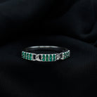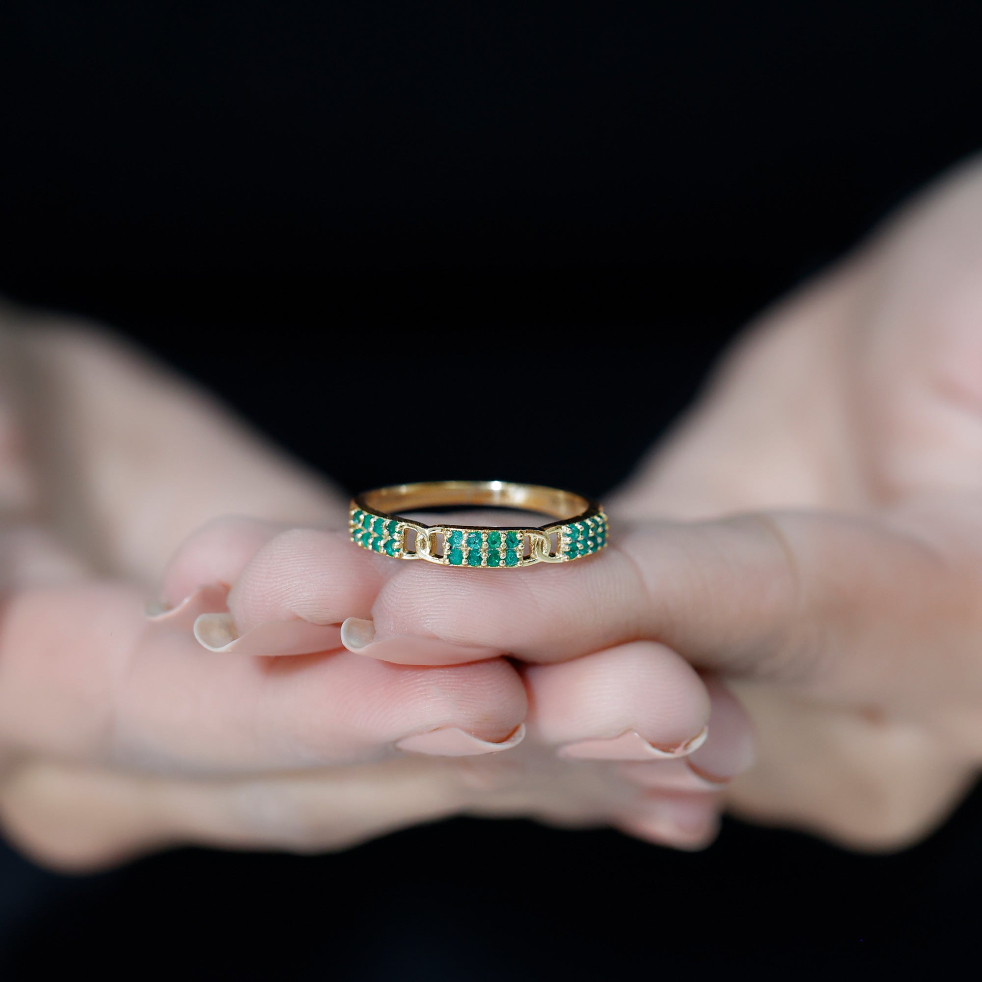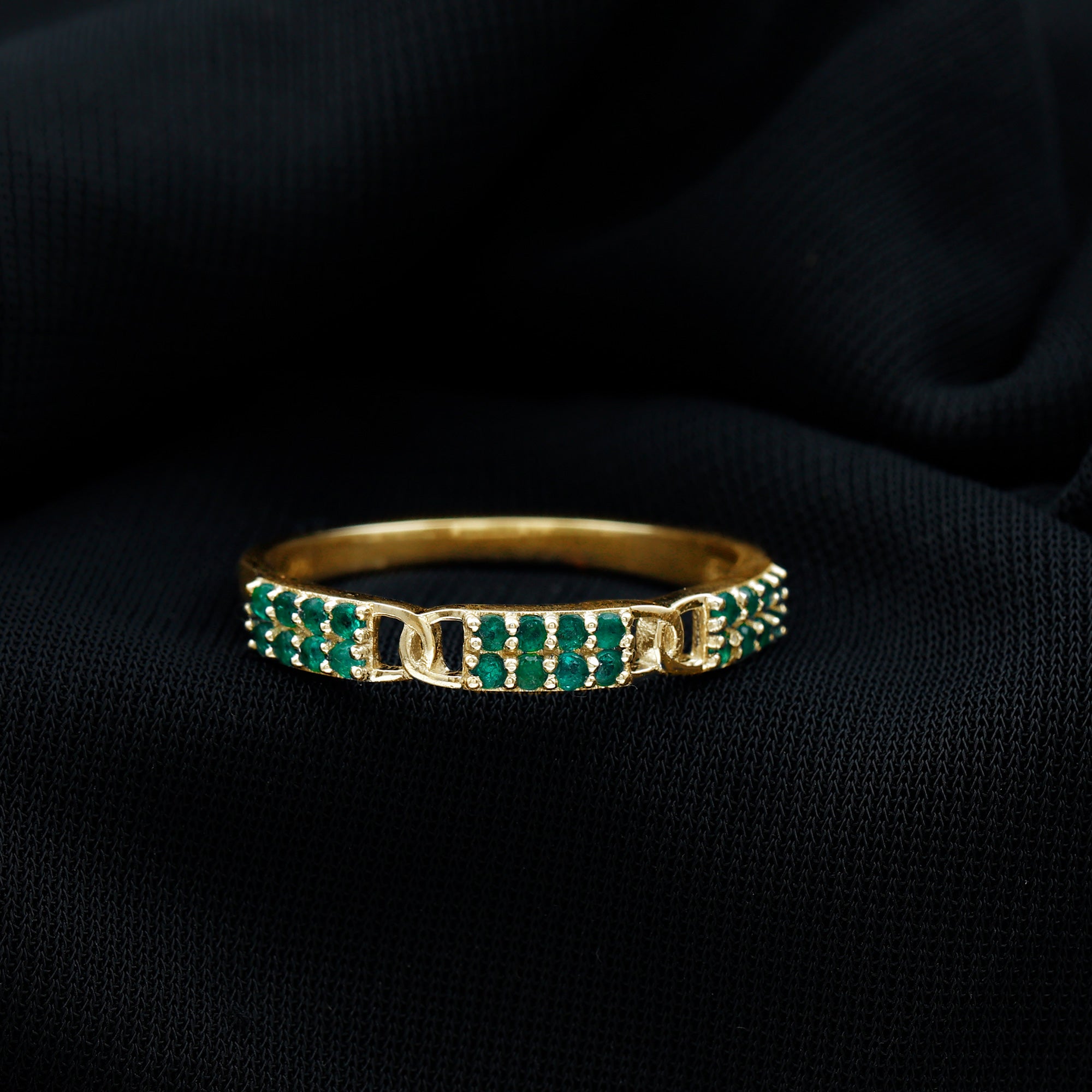 Love shines endlessly in this elegant Emerald Eternity Band, a beautiful piece that captures the essence of lasting connection. The Half Eternity Band features round shaped emeralds set delicately in secure pave setting. The emerald stones are placed along with a gracefully designed interlocking pattern, giving the Eternity Wedding Band a unique and stylish look that stands out from traditional designs. The deep green color of the AAA quality natural emeralds symbolizes harmony, renewal, and everlasting affection, making this Wedding Anniversary Ring a meaningful choice for celebrating special moments. The half-circle arrangement of gemstones creates a balanced and eye-catching display, offering just the right amount of shine while keeping the design timeless and elegant. Perfect for anniversaries, weddings, or as a thoughtful gift, this Emerald Wedding Band can be worn alone for a classic look or stacked with other rings for a more personalized style. The intricate interlocking band adds depth and dimension, while the vibrant emeralds bring a touch of nature-inspired beauty.